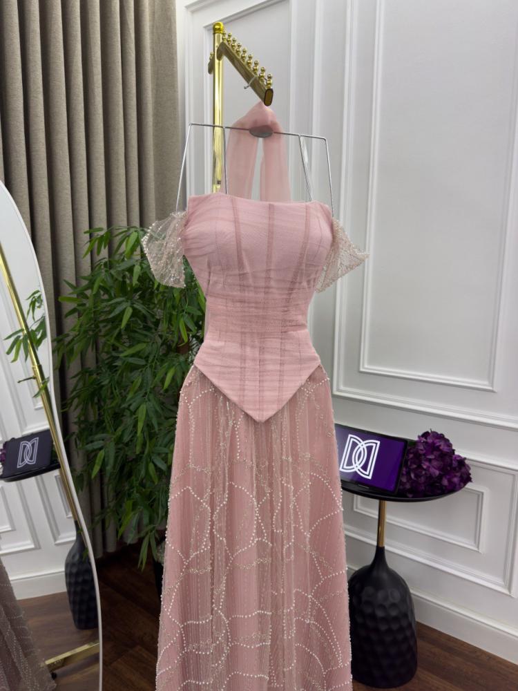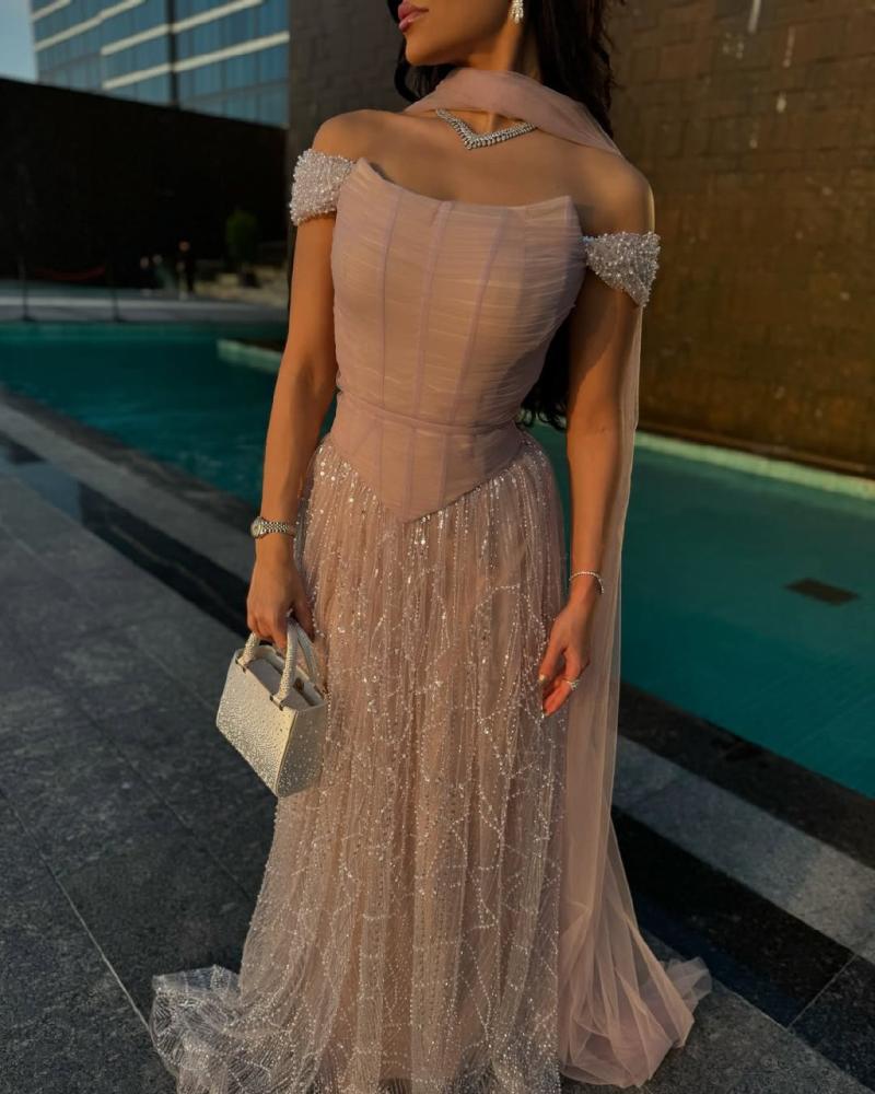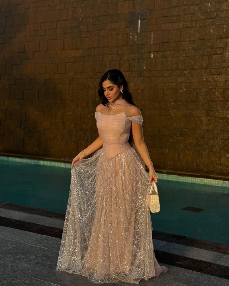 فستان سهره من التل اوف شولدر تطريز راقي فخم
