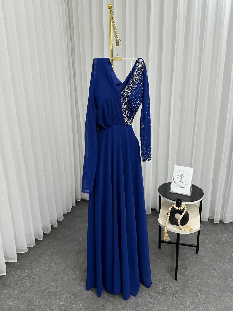 التصميم :فستان سهره ناعم و انيق باكمام طويله مزين بالخرز و اللولو على الصدريه و الاكمام و من الجزء السفلي كلوشخط العنق :دائريهاللون : ازرق نيليالخامه :شيفون - لولوالتمدد: لاالمناسبه : سهره - فستان عيد - فستان خطوبهالمقاسات: S-M-L-XL-XXL-XXXL