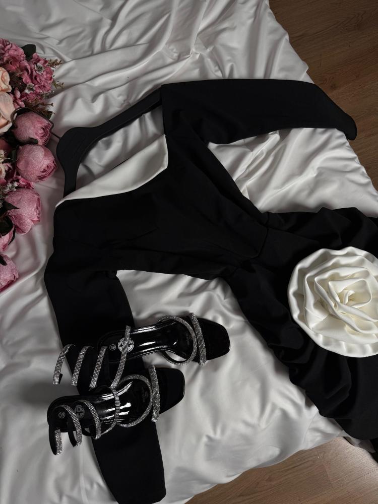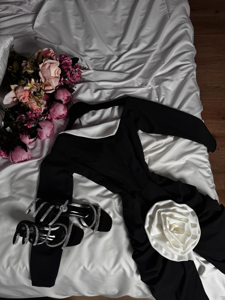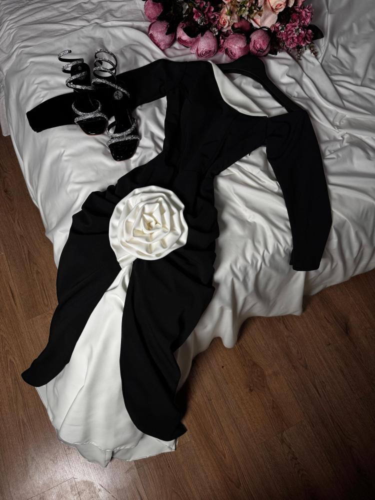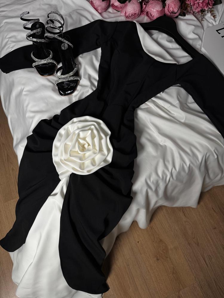 فستان ناعم اللون ابيض على اسود الخامه كريب استرتش رااقي باربي