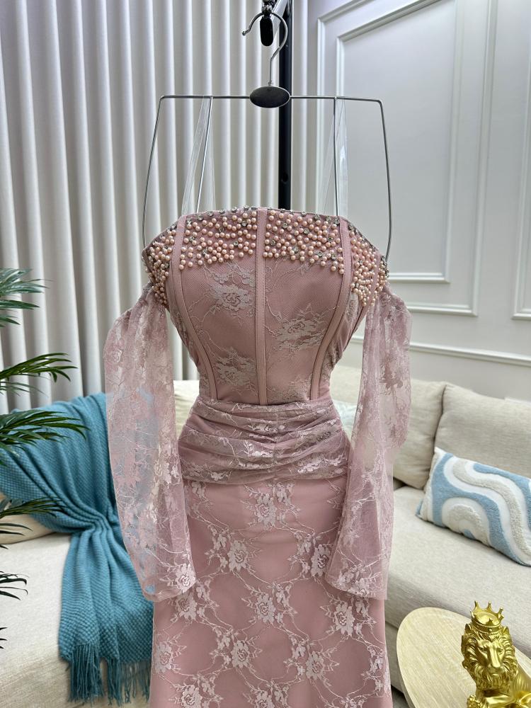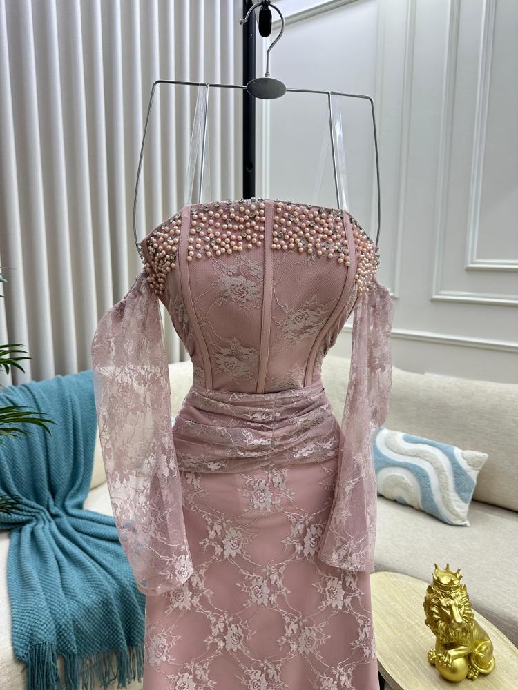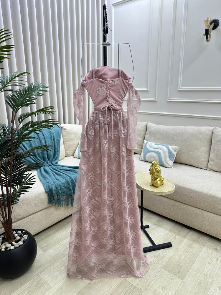 فستان سهره اللون لحمي دانتيل درجه اولى كوري بتطريز لول راقي من متجر جوهره TR