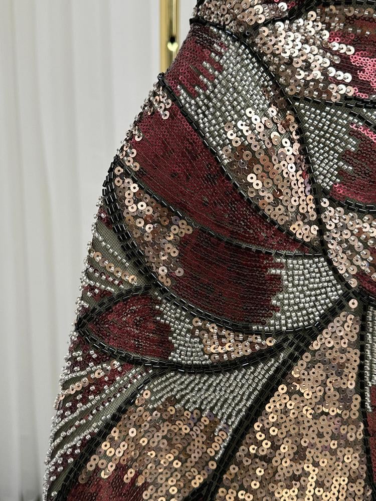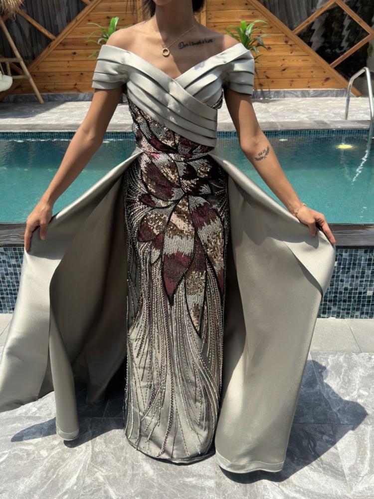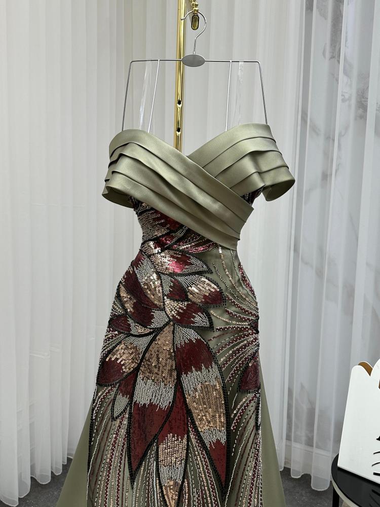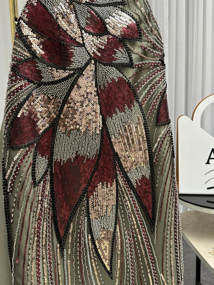 فستان سـهرة الخامة ميكادو كلفه تطريز راقي لون زيتي من متجر جوهره AN