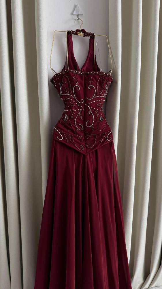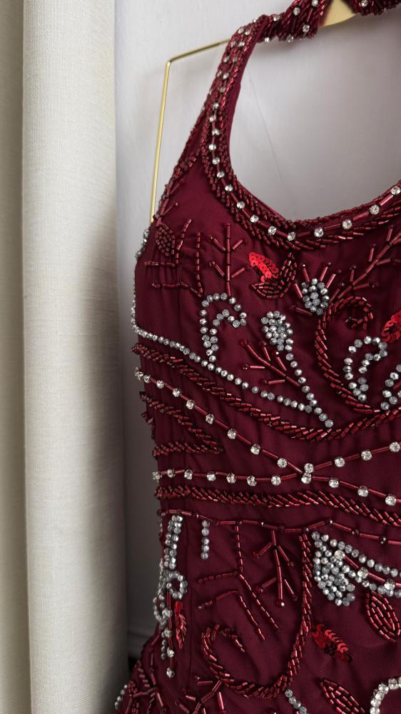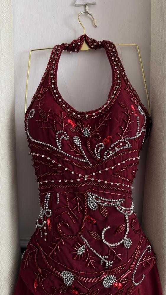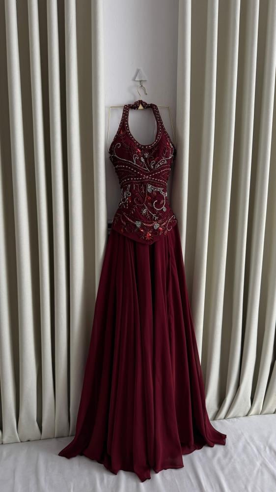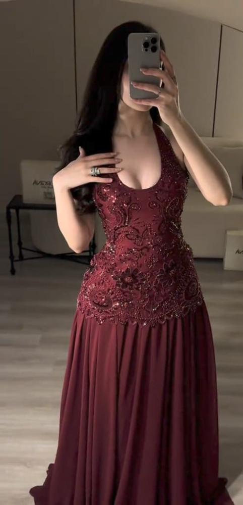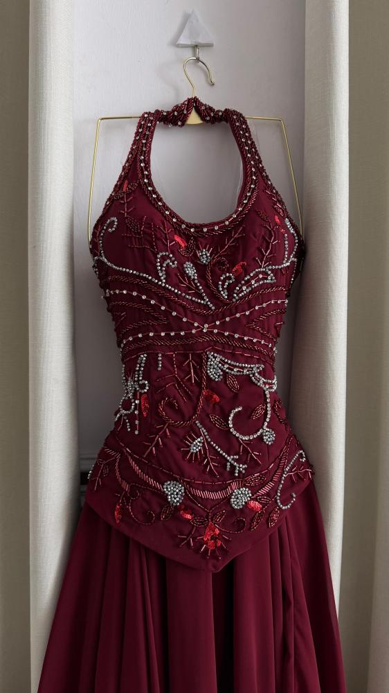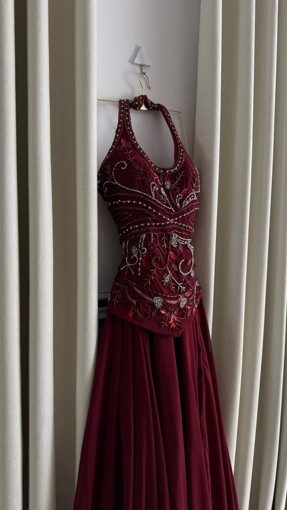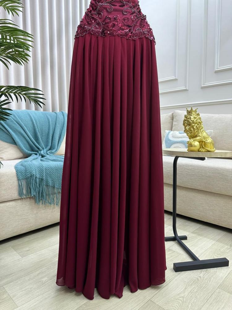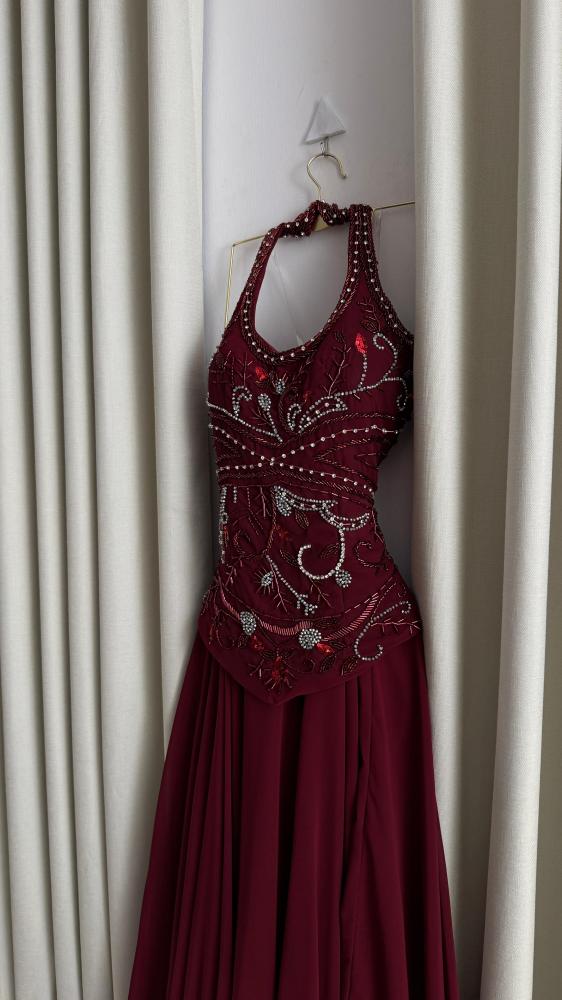 فستان سهره اللون لحمي وبرغندي خامه شيفون وخرز من متجر جوهره MN MA