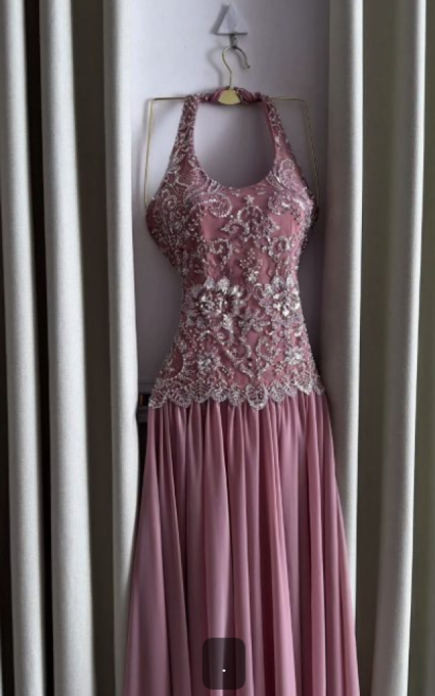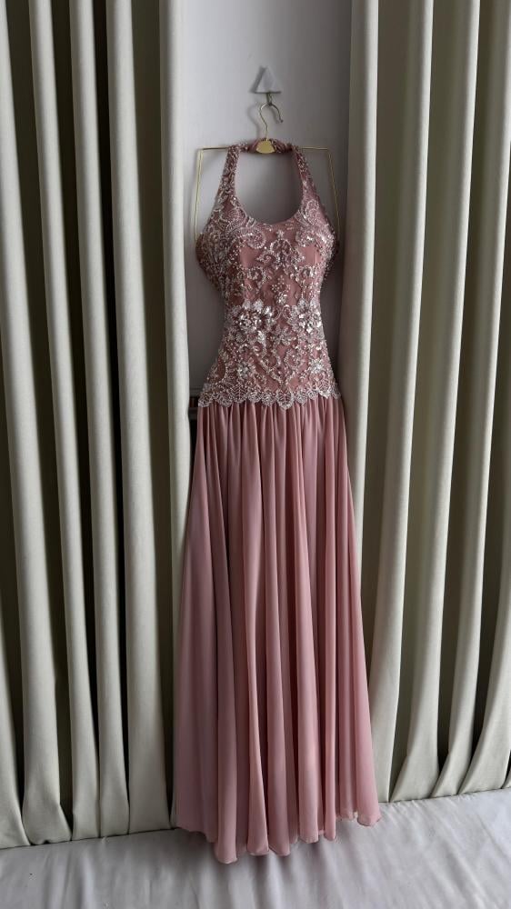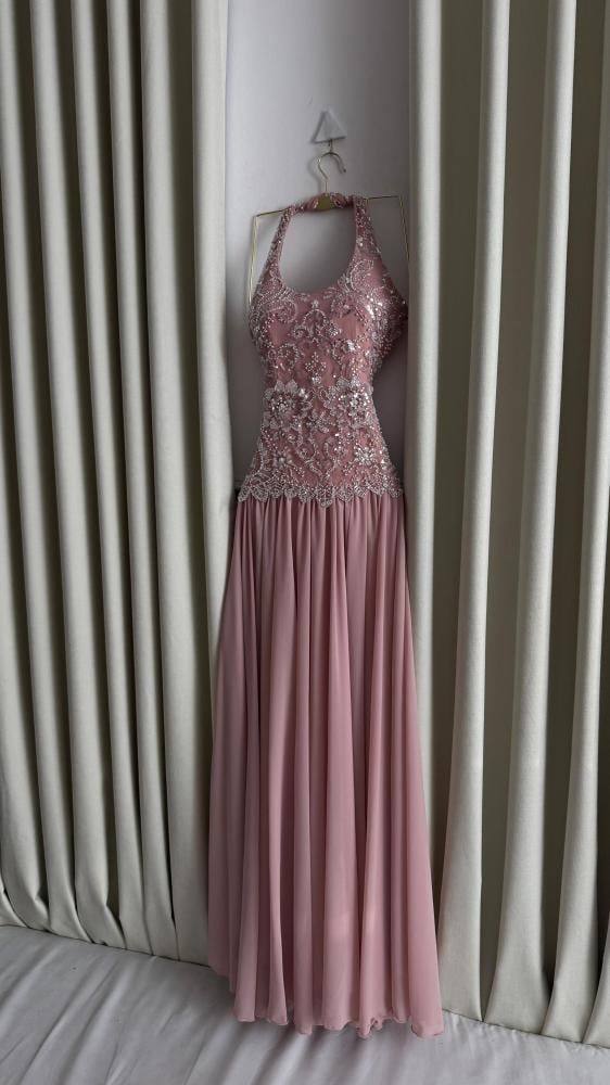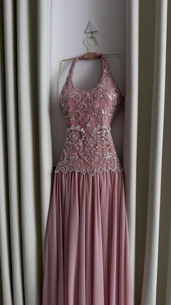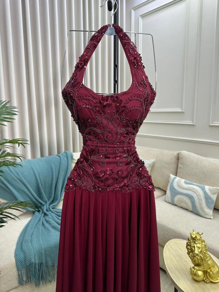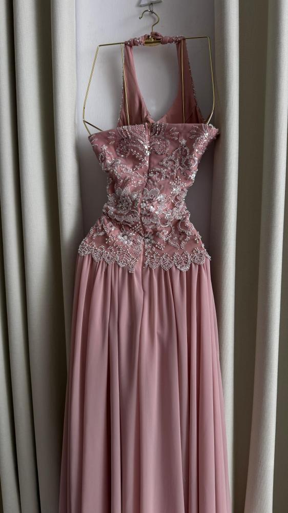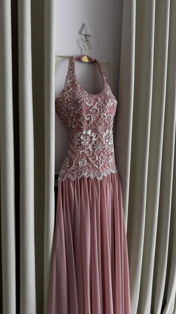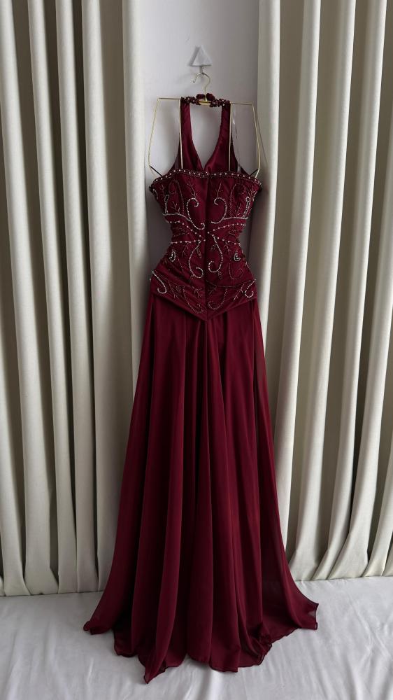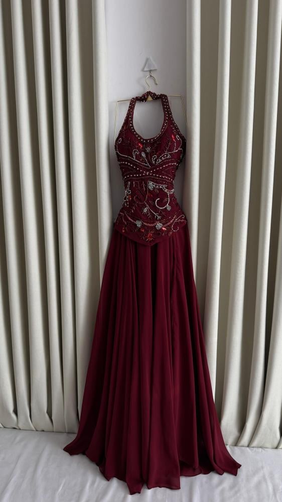 فستان سهره اللون لحمي وبرغندي خامه شيفون وخرز من متجر جوهره MN MA