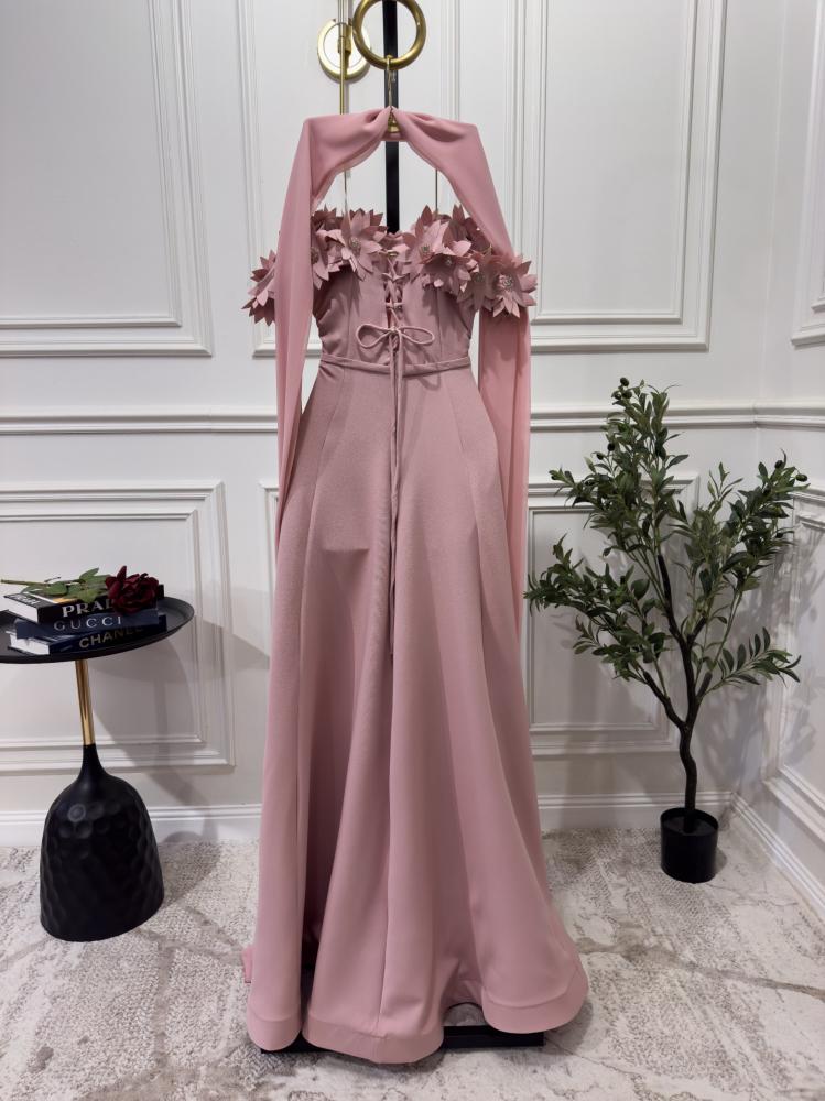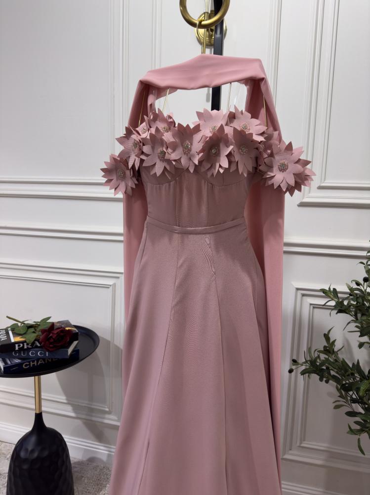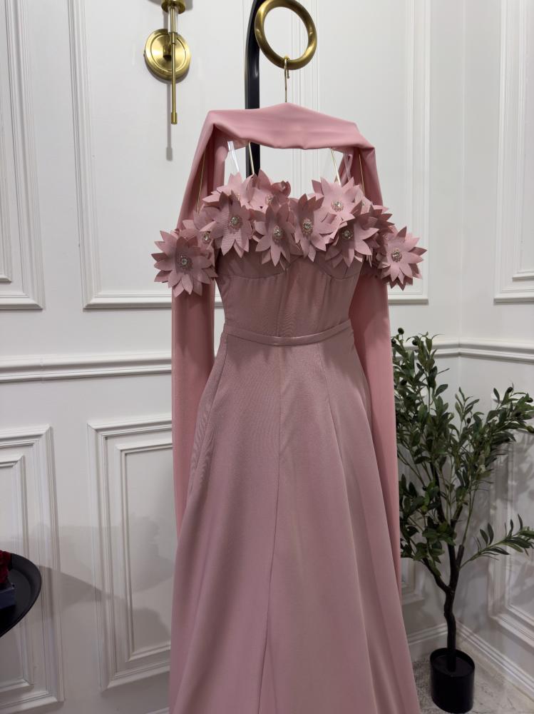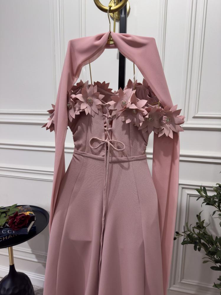 فستان لحمي اوف شولدر مزين بالورد و الكريستال الخامه باربي درجه اولى