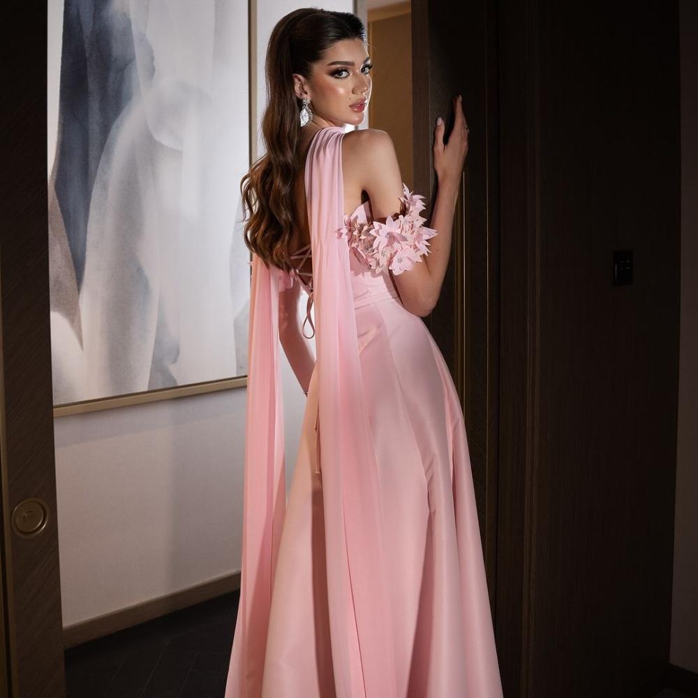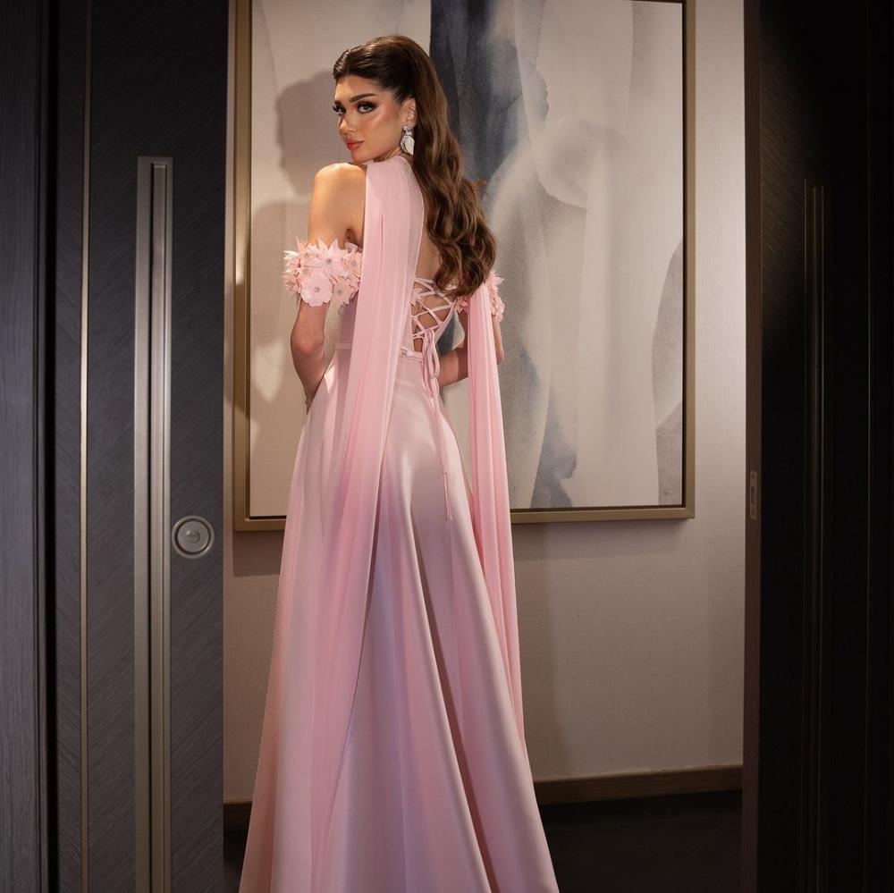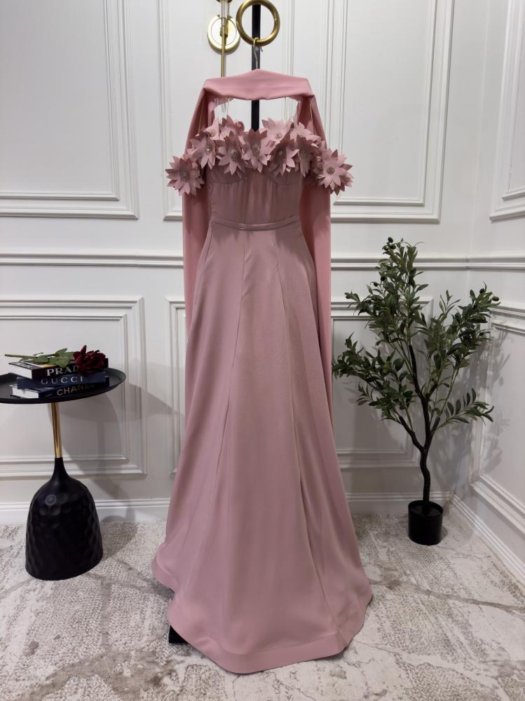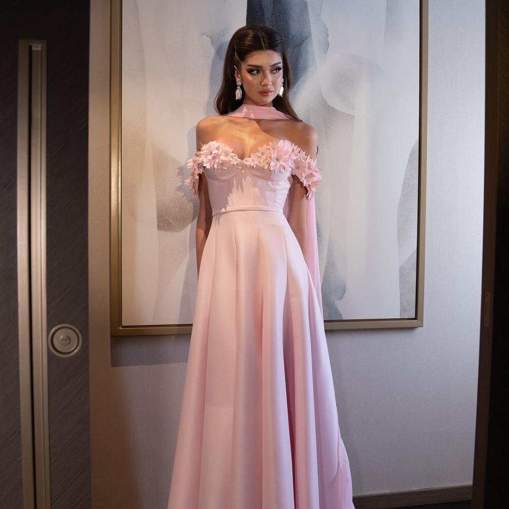 فستان لحمي اوف شولدر مزين بالورد و الكريستال الخامه باربي درجه اولى