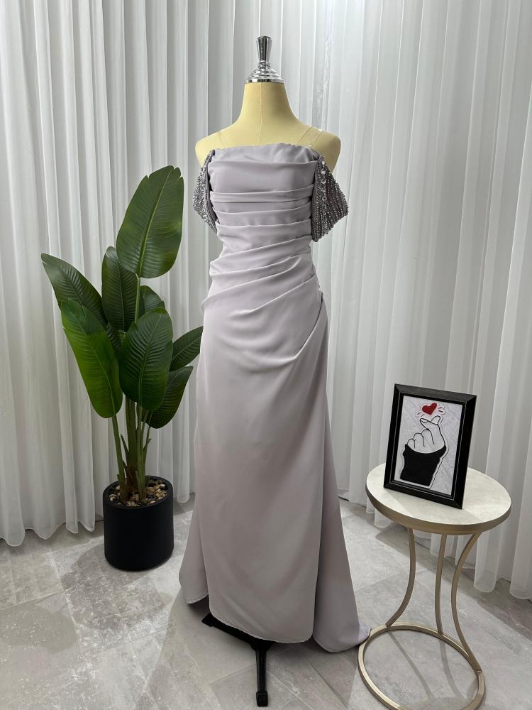 فستان سهره ناعم و فخم تصميم : ناعم و ضيق طويل اكمام مزينه بالكريستالخط العنق : اوف شولدراللون : يميل الى الرمادياتالمناسبه : ملكه - خطوبهالمقاسات : S-M-L-XL-XXL