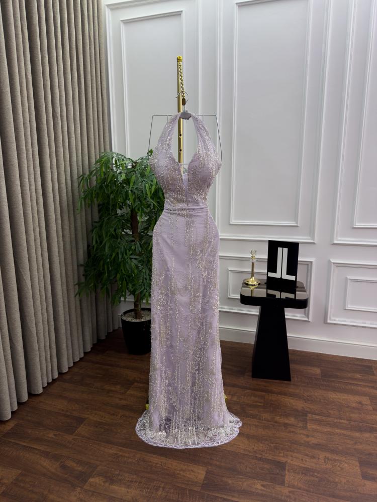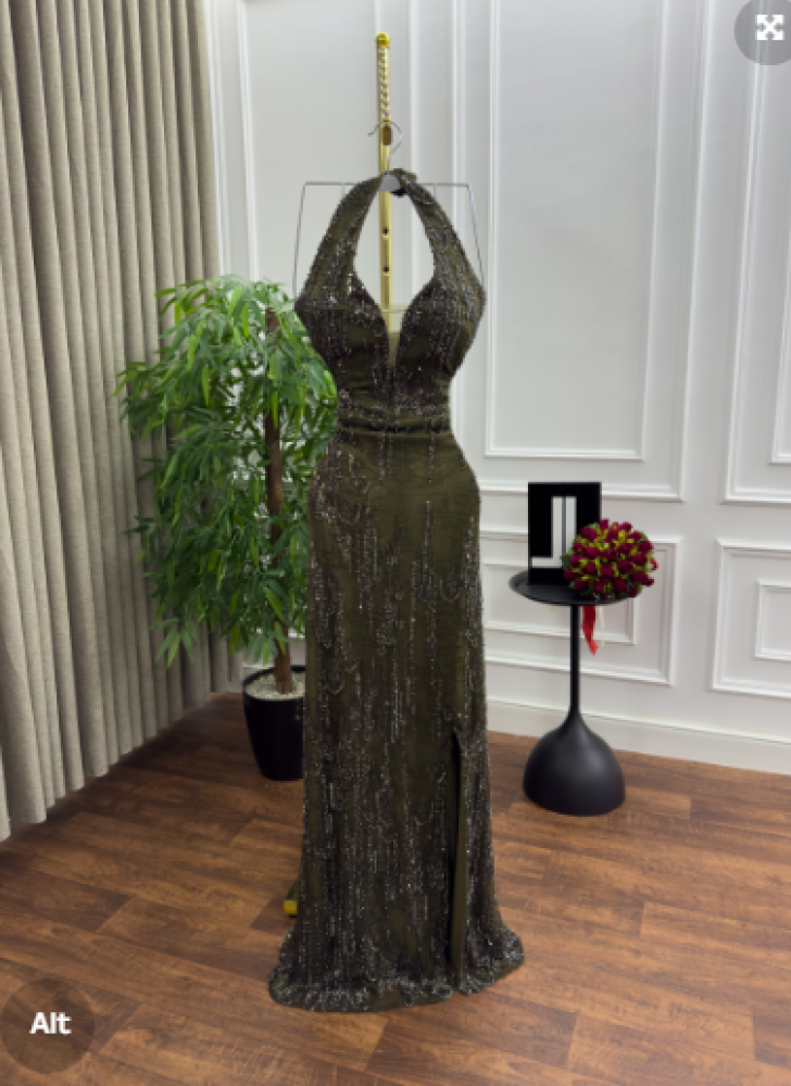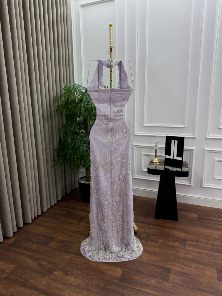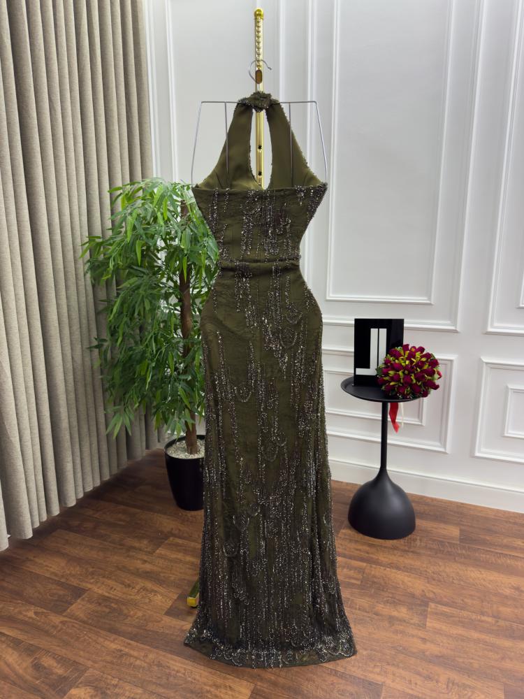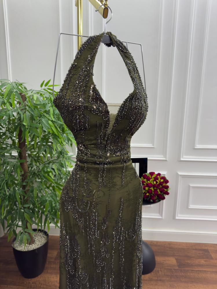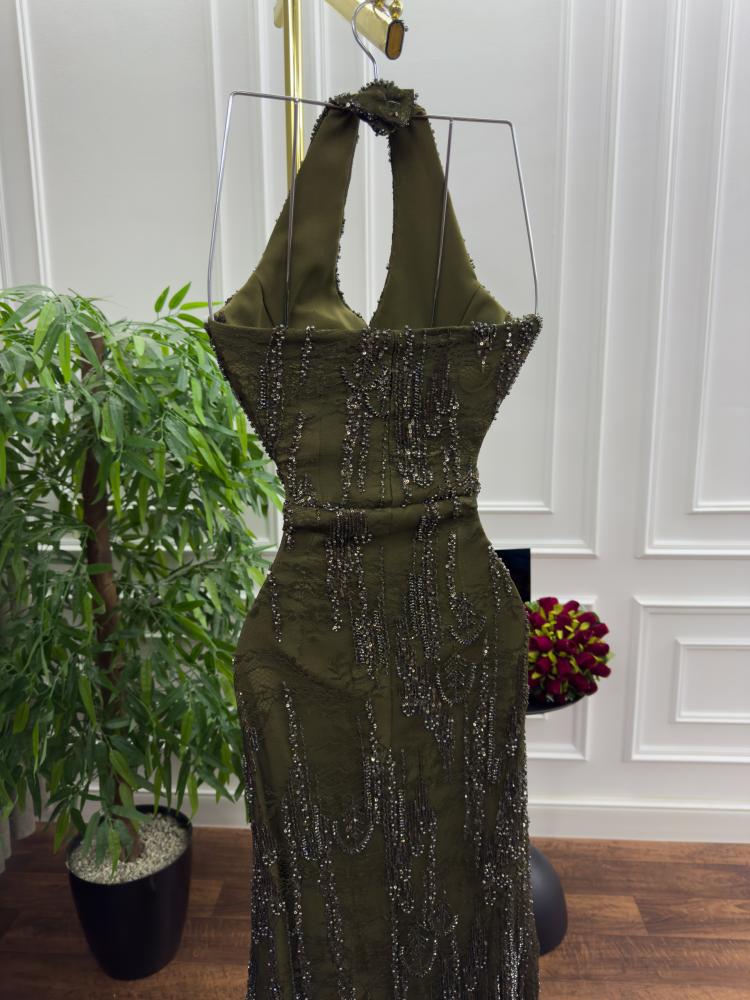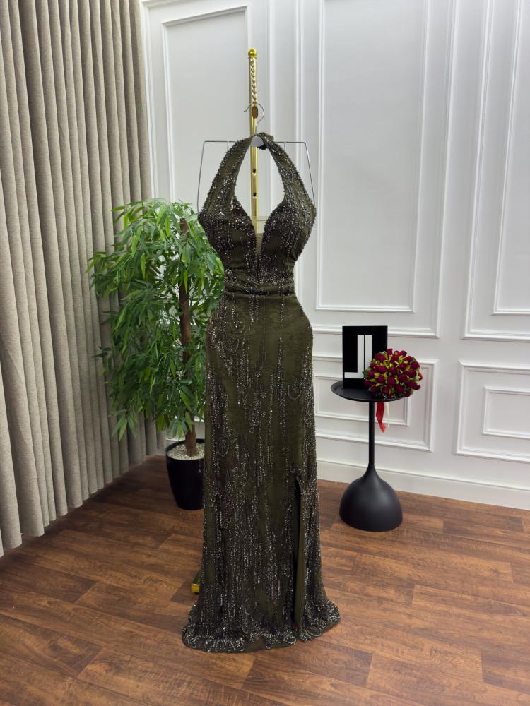 فستان سهره اللون زيتي و موف دانتيل مطرز من متجر جوهره LA MN
