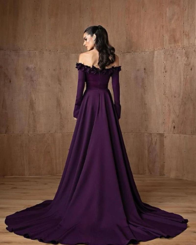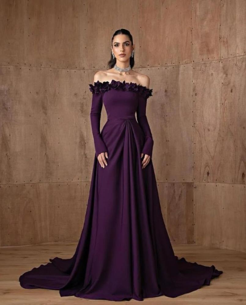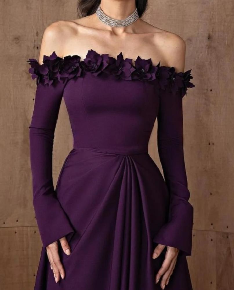 فستان سهره ليلكي الخامه باربي مزين بالورد قصة الاوف شولدر من متجر جوهره