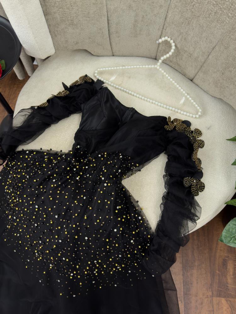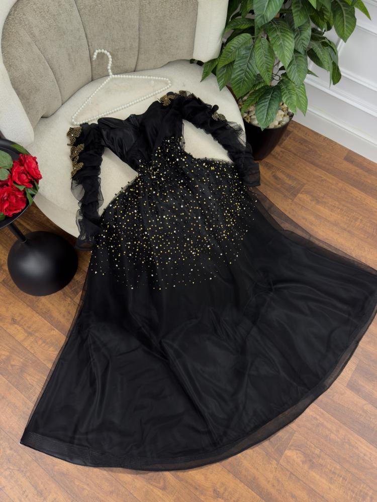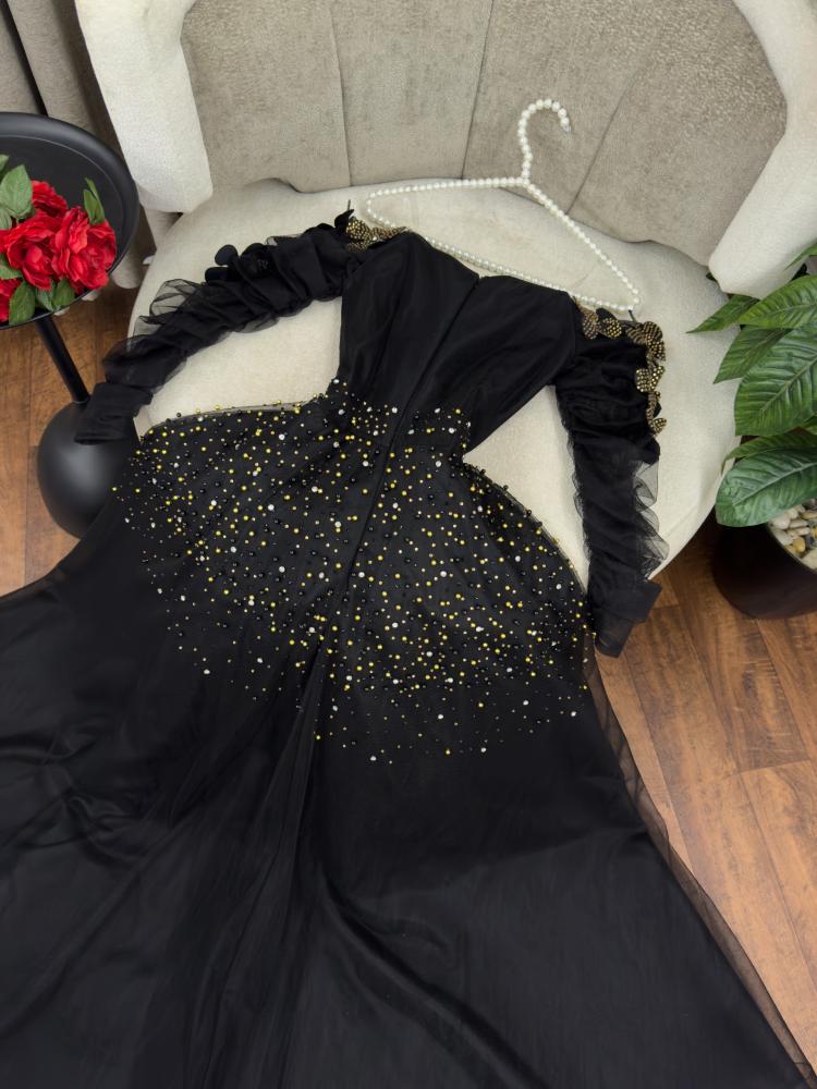 فستان سهره اسود الخامه تل تطريز كبيوتر وفصوص MN