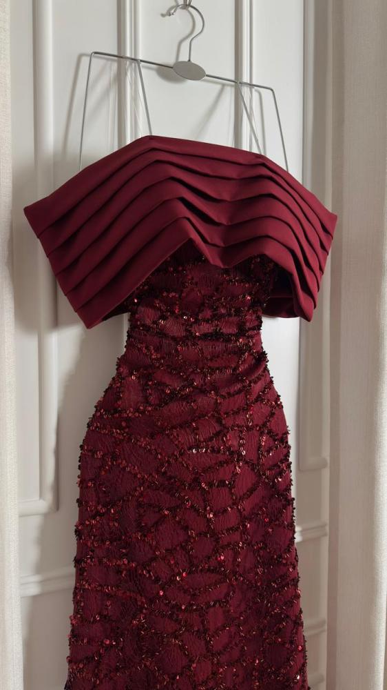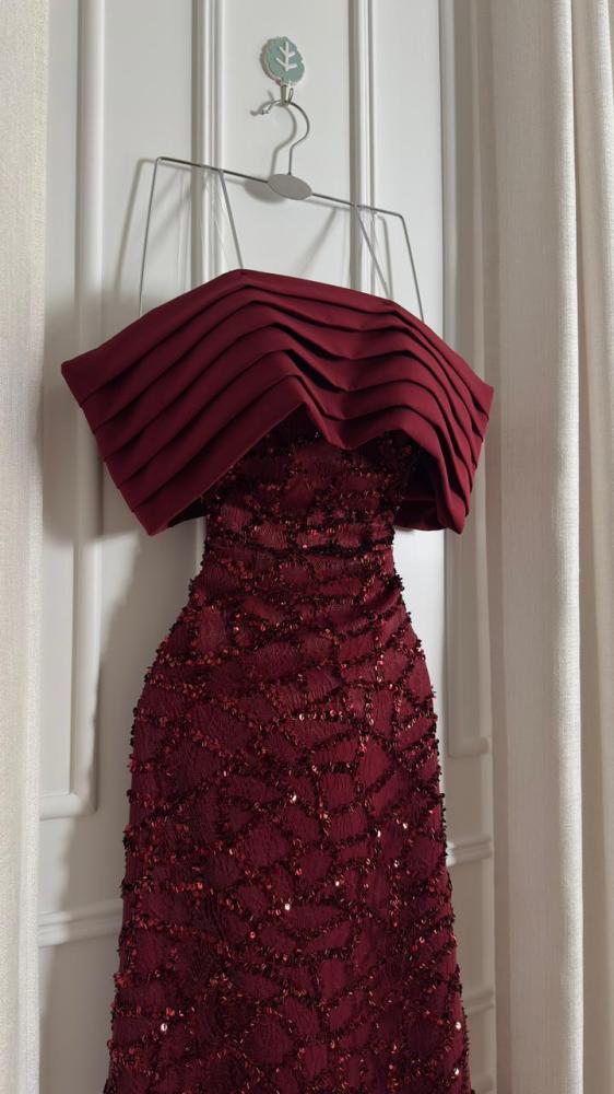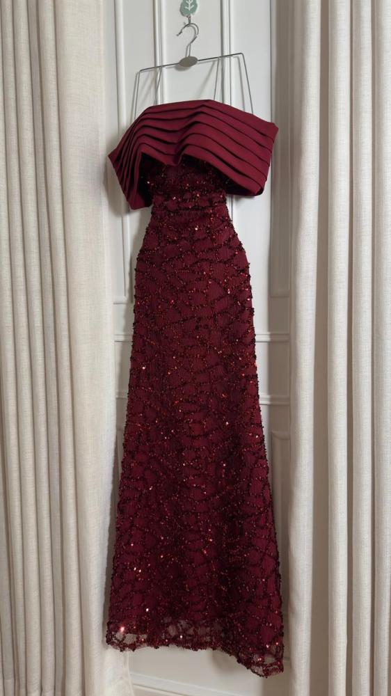 فستان سهره اللون عنابي و بني ترتر خرز الصدريه تفته من متجر جوهره LF