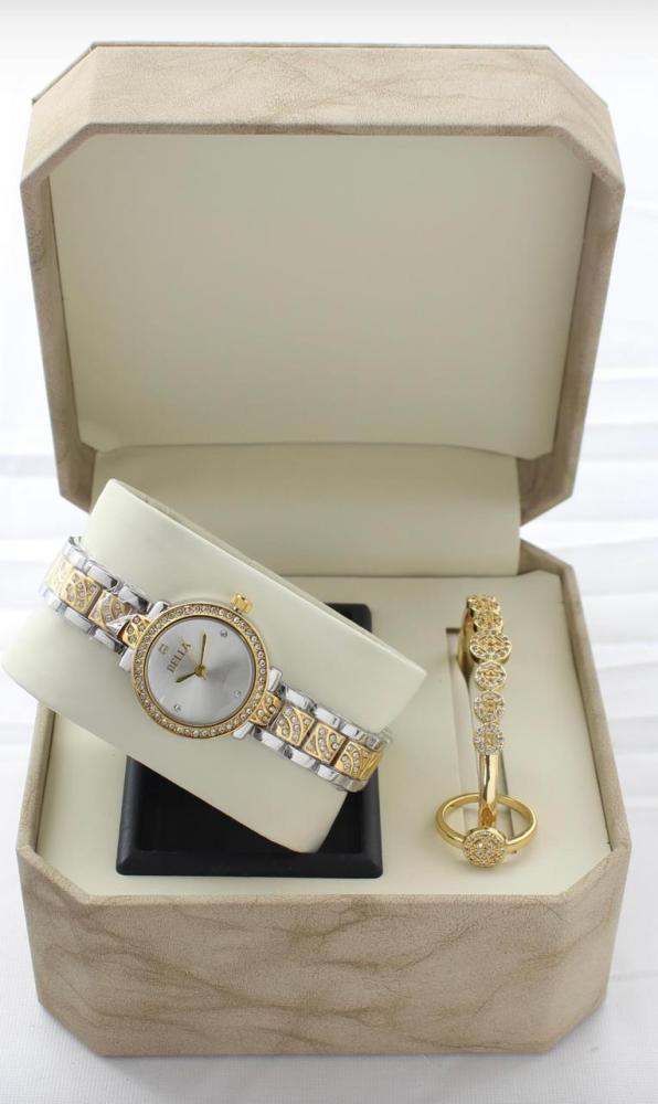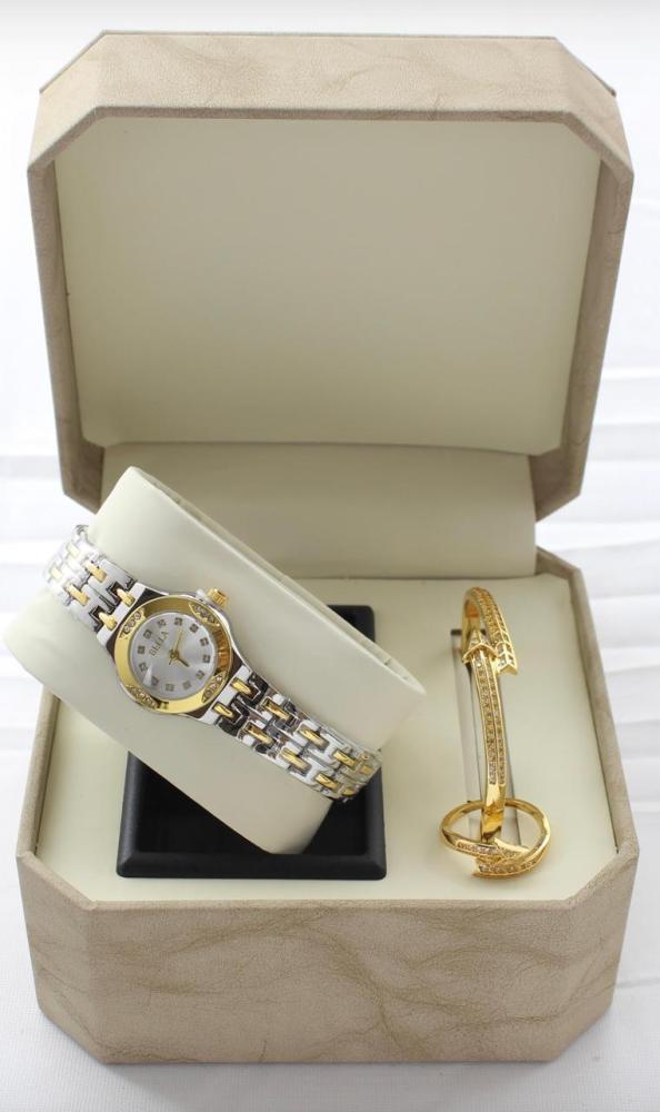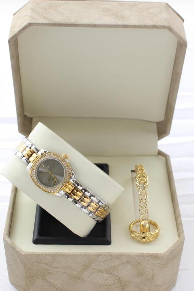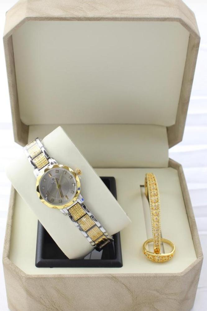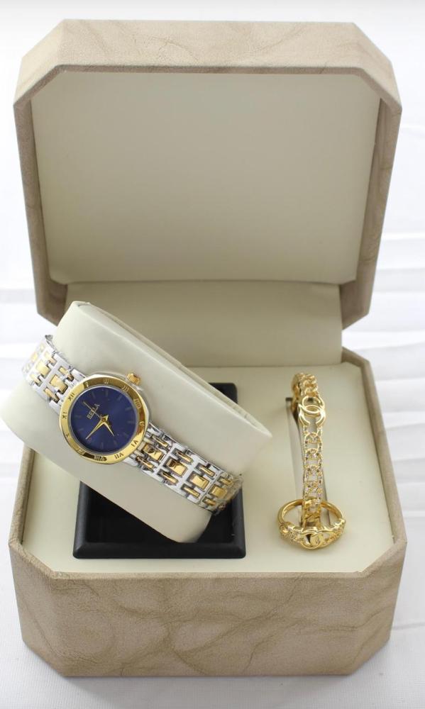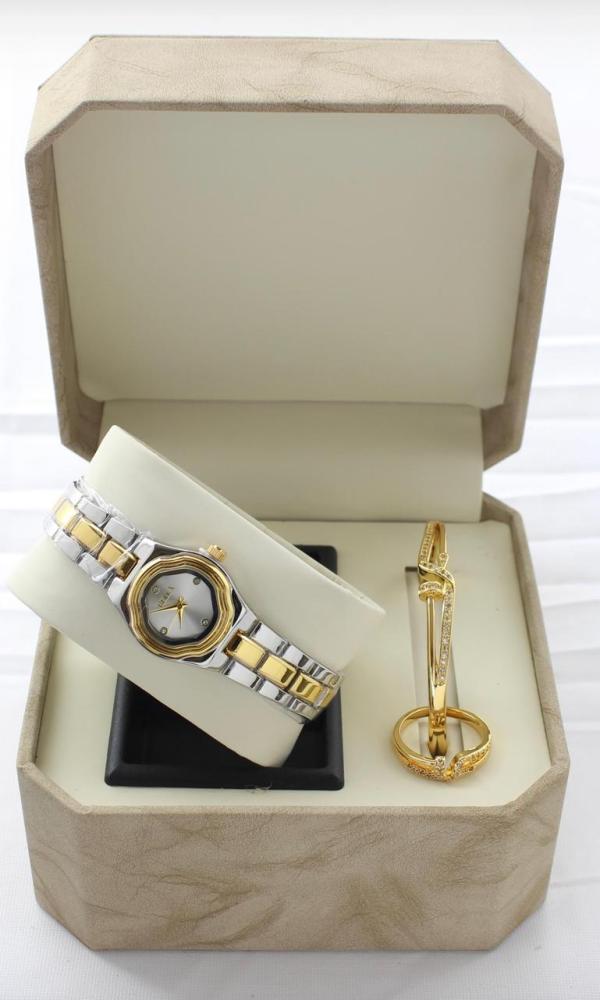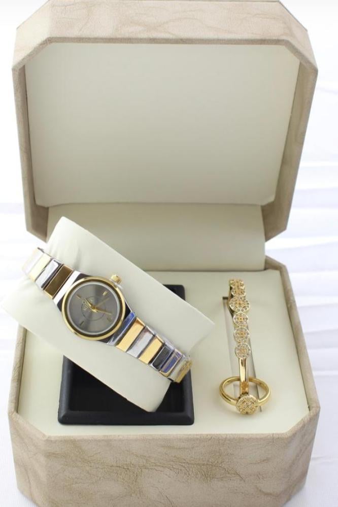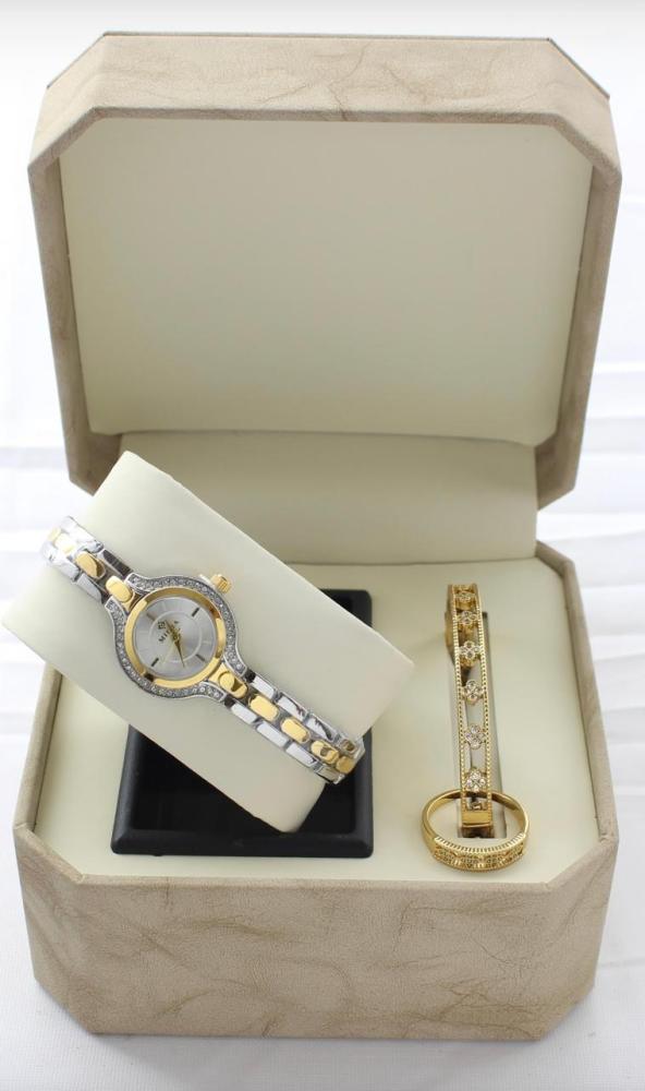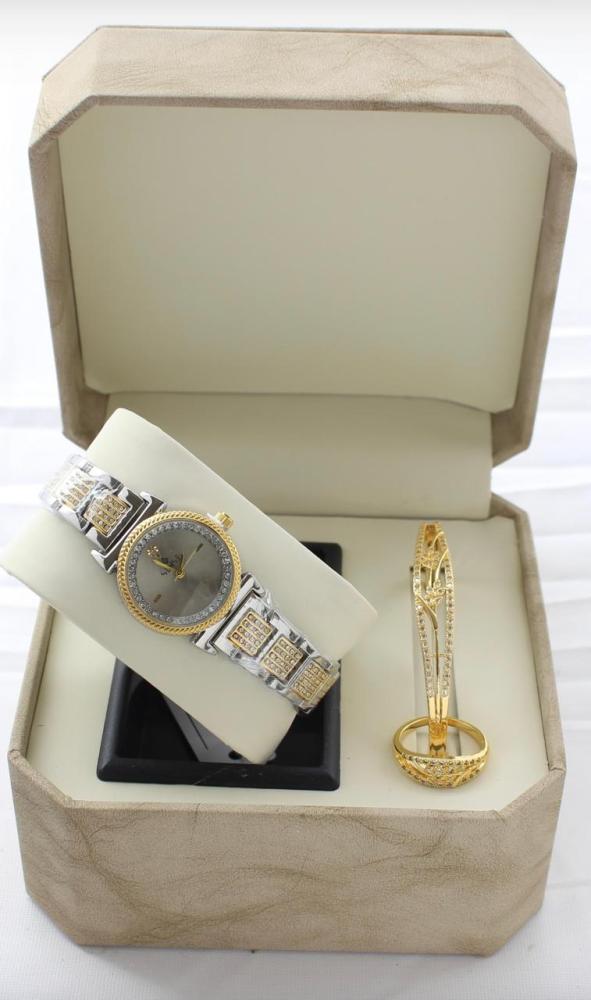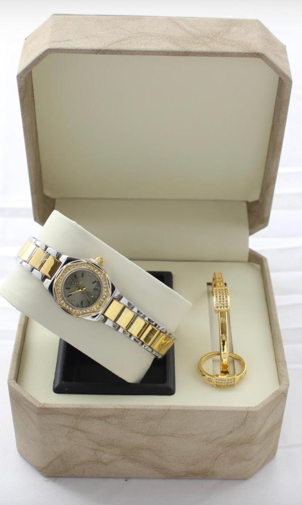 طقم أنيق فاخر 💫ساعة بتصميم أنثوي راقٍ مع أسورة أنيقة وخاتم تضيف لمسة فخامة لإطلالتك⏱ ضمان لمدة سنة🎁 يأتي في علبة هدايا فاخرة جاهزة للإهداء