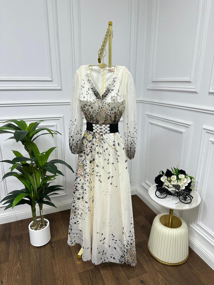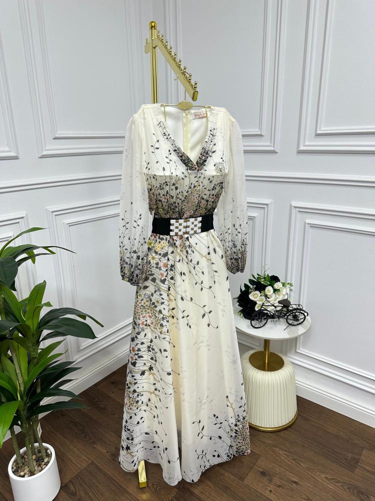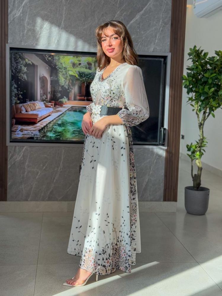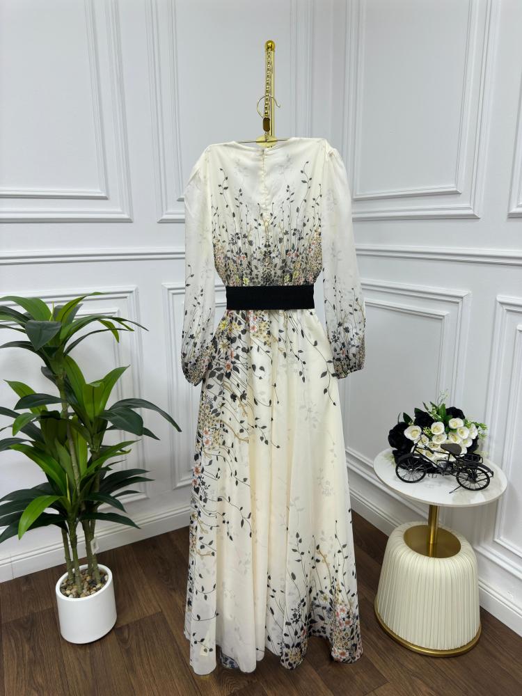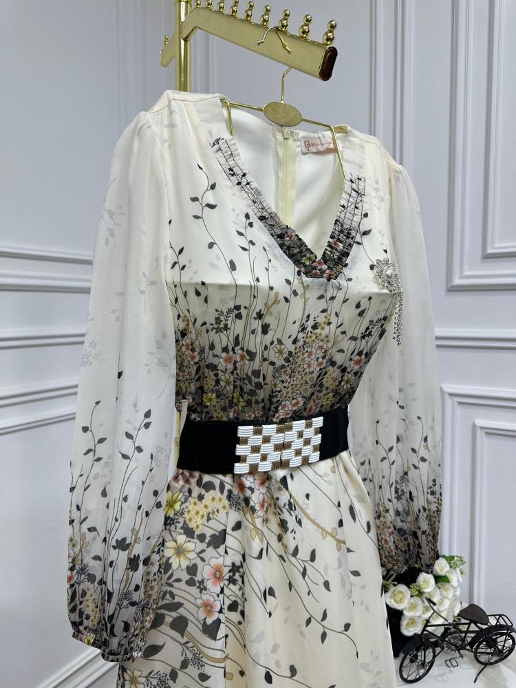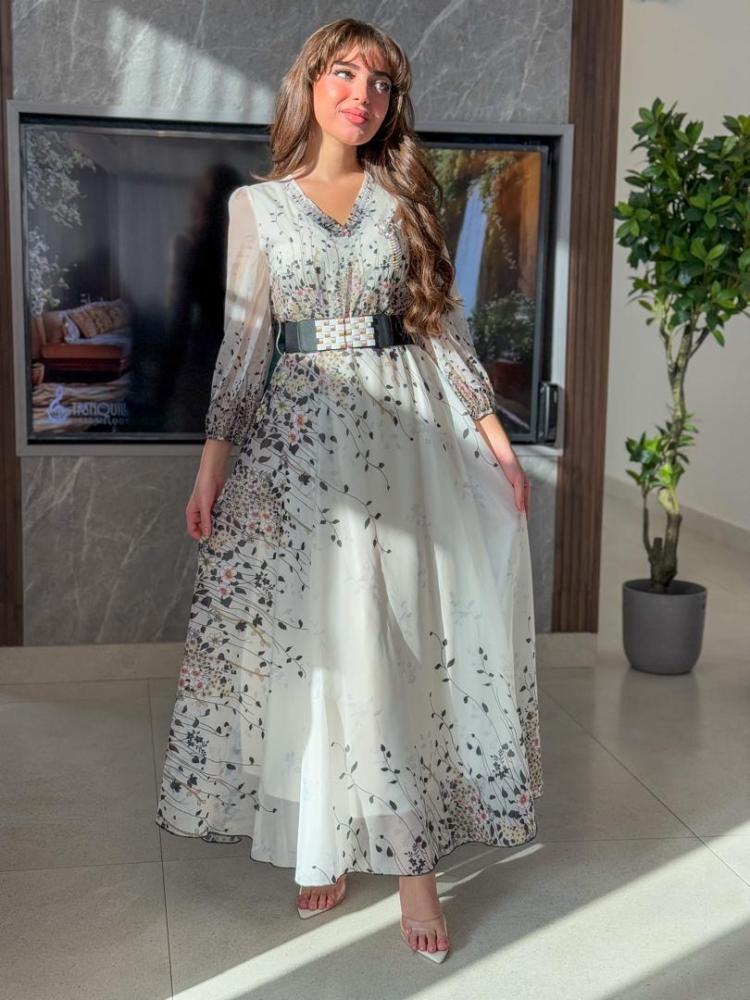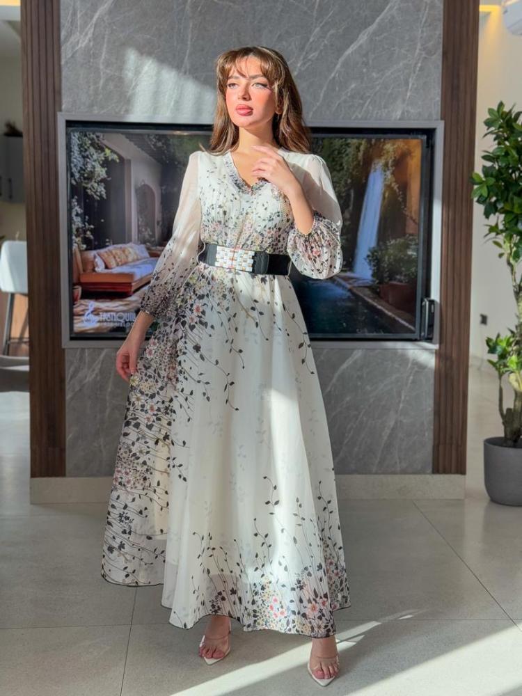 فستان مشجر خام شيفون جورجيت مع حزام اسود عريض