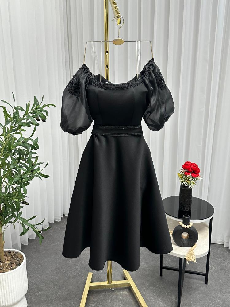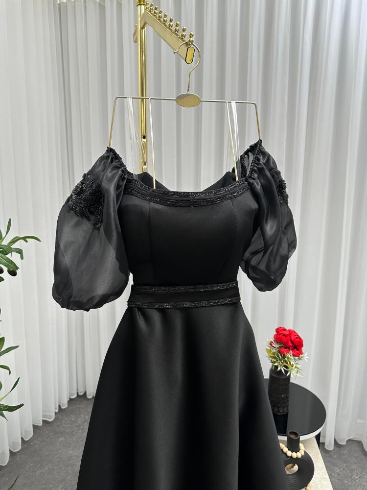 فستان اسود طبي باكمام بالونيه مع حزام على الخصر مطرز يدوي