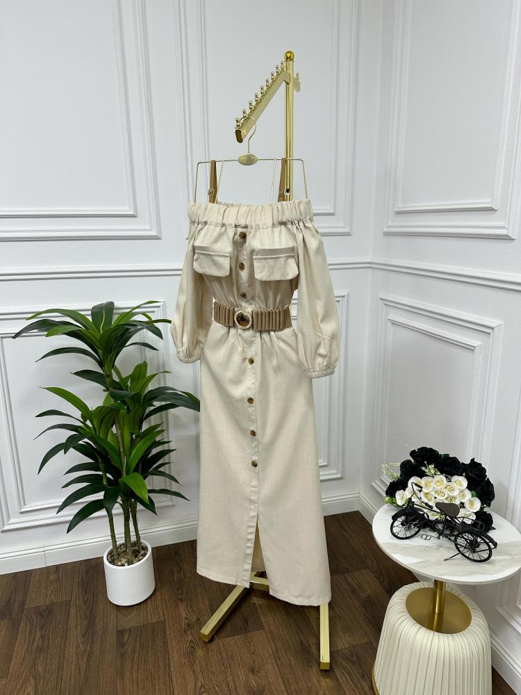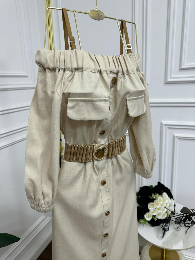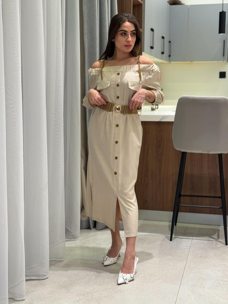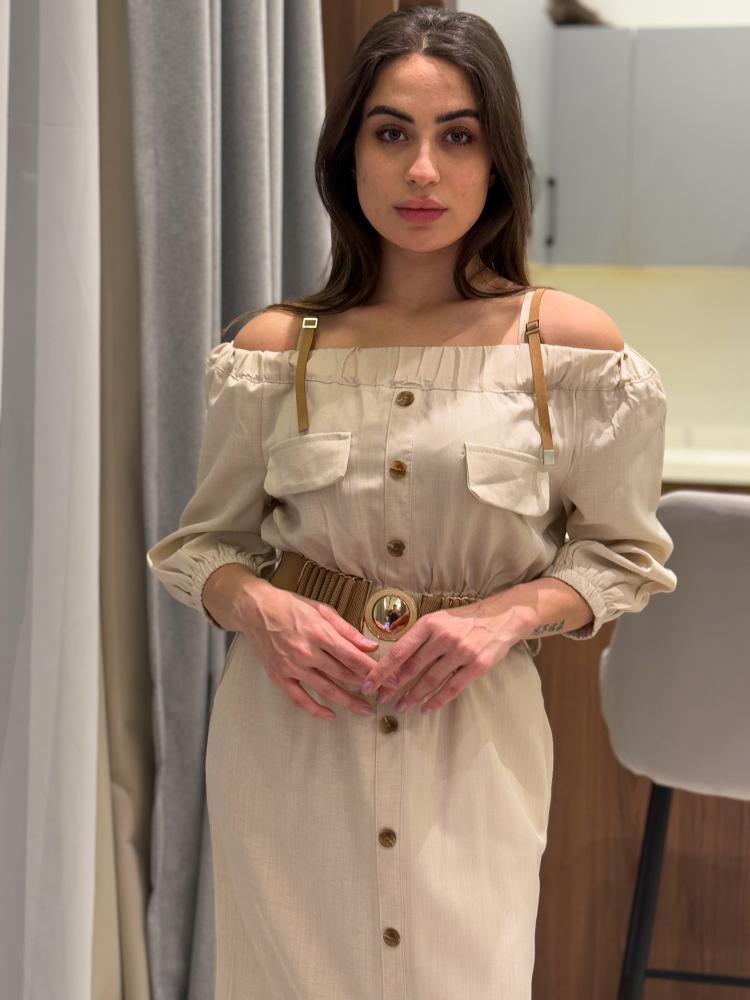 فستان بيج مع حزام على الخصر خامه كتان سي واي