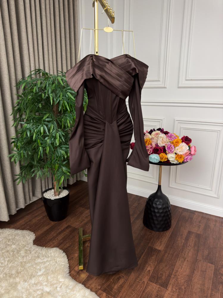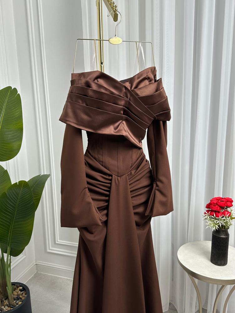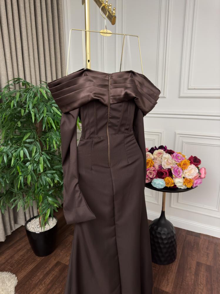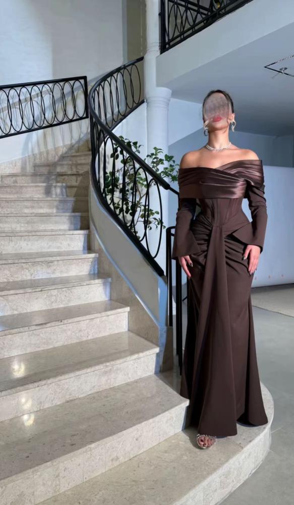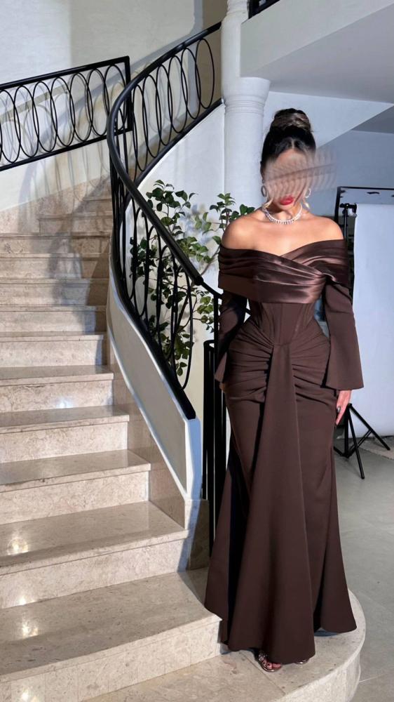 التصميم : فستان سهره بني فاتح اكمام طويله قصه اوف شولدر طويل مع طيات متماثله على الكتف و كسر مدرجه على الخصر و قصة كورسيه على الصدريه لإطلاله انثويه مميزه .