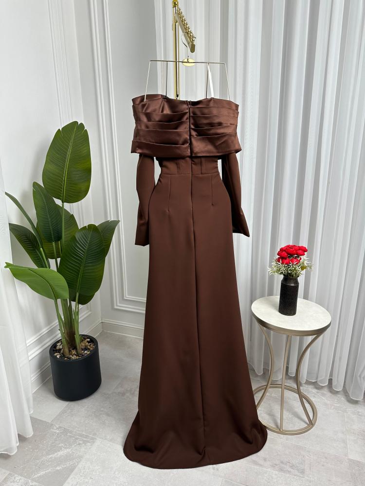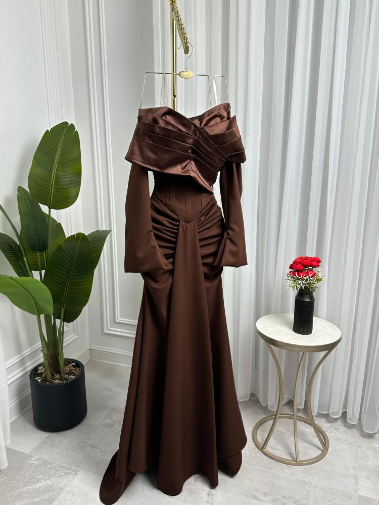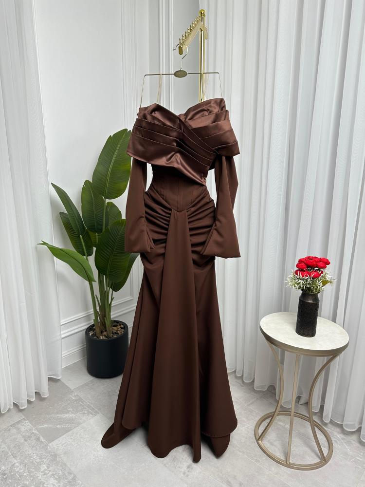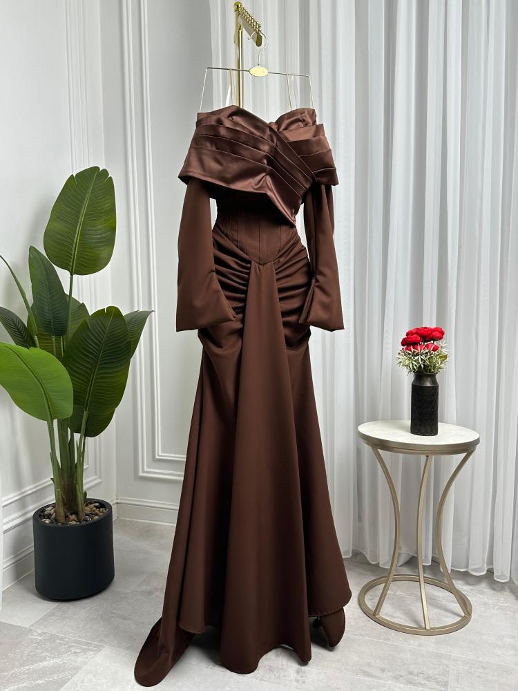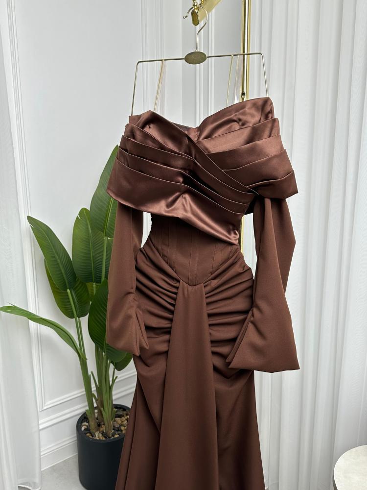 التصميم : فستان سهره بني فاتح اكمام طويله قصه اوف شولدر طويل مع طيات متماثله على الكتف و كسر مدرجه على الخصر و قصة كورسيه على الصدريه لإطلاله انثويه مميزه .