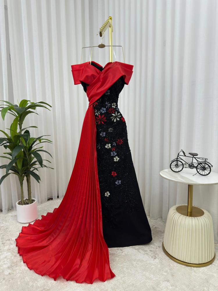 فــسـتان سهره اللون اسود على احمر القماش باربي قماش مطرز بوليصه اورجنزى من متجر جوهره AR