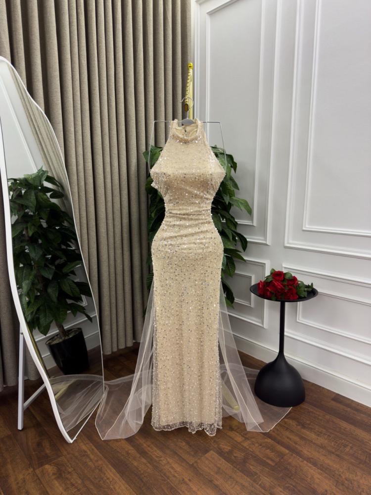 فستان سهره اللون بيج خامه تل مطرزه بلول وخرز من متجر جوهره MN
