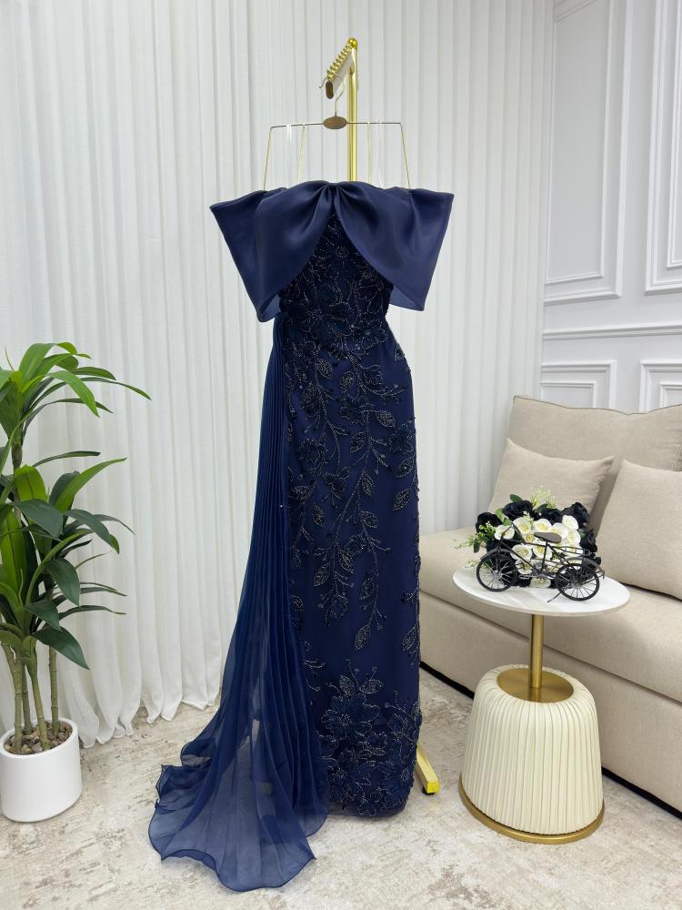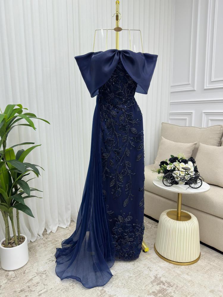 فستان سهره اللون كحلي خام باربي مع جازار مزين بكلفه تطريز اصلي AR