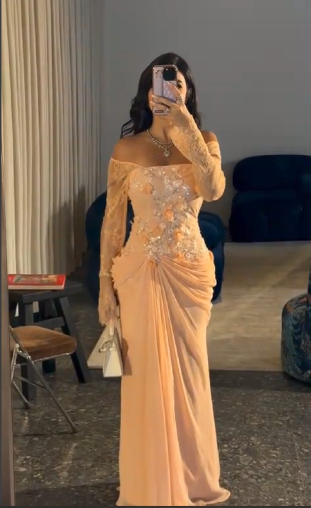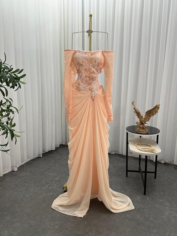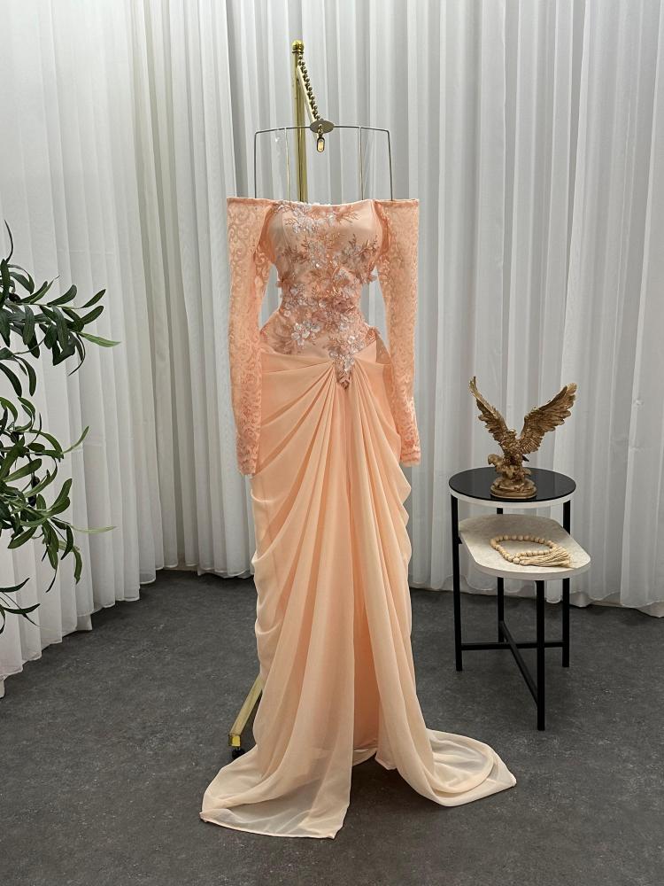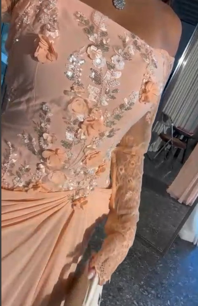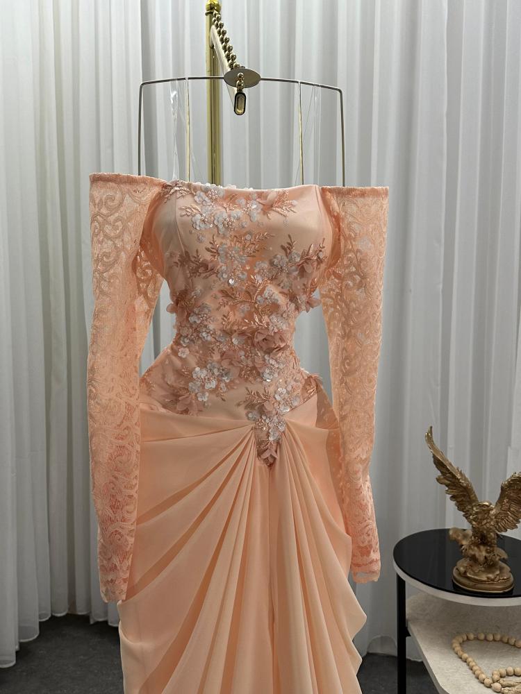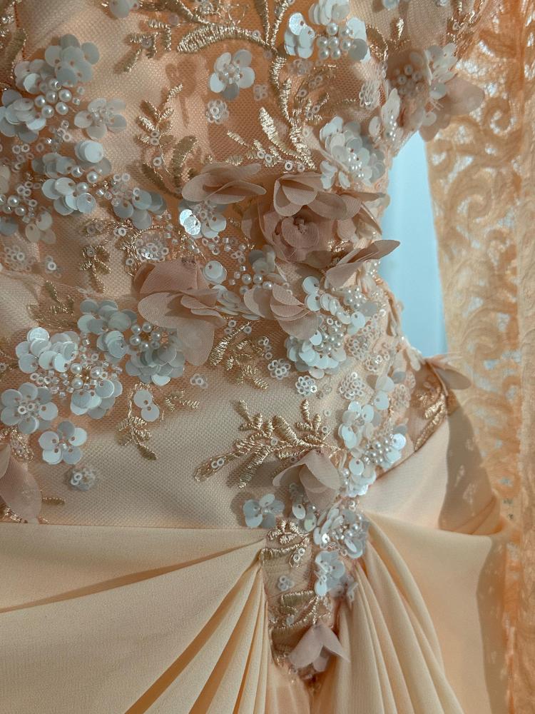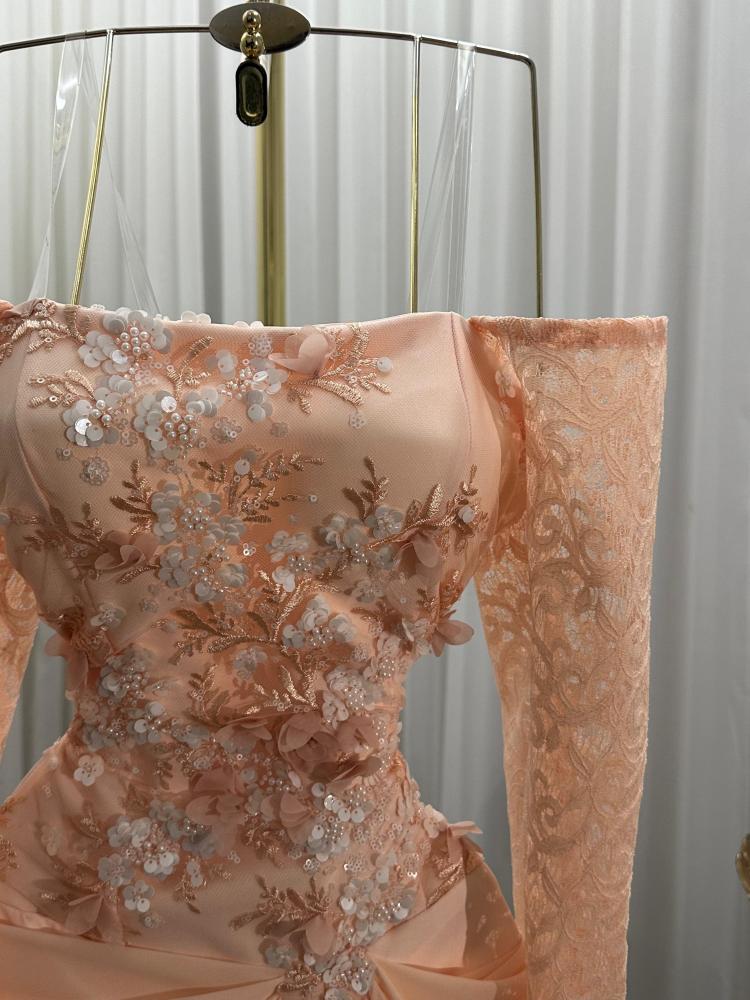 فستان سهره اللون خربزي جورجيت باربي اكمام دانتيل صدريه قماش سهره راقي من متجر جوهره QN