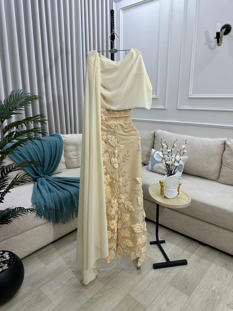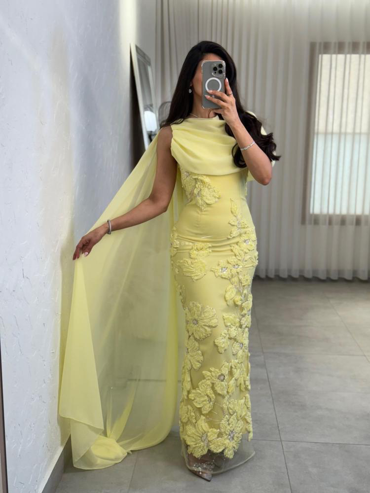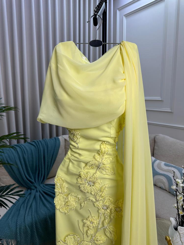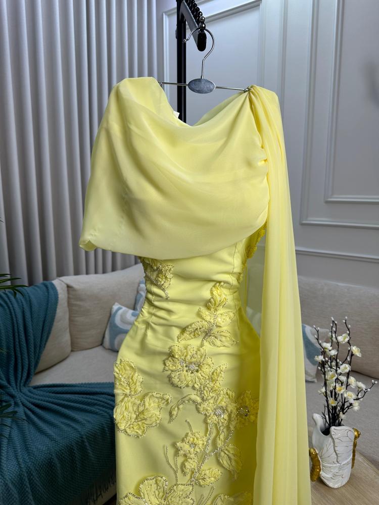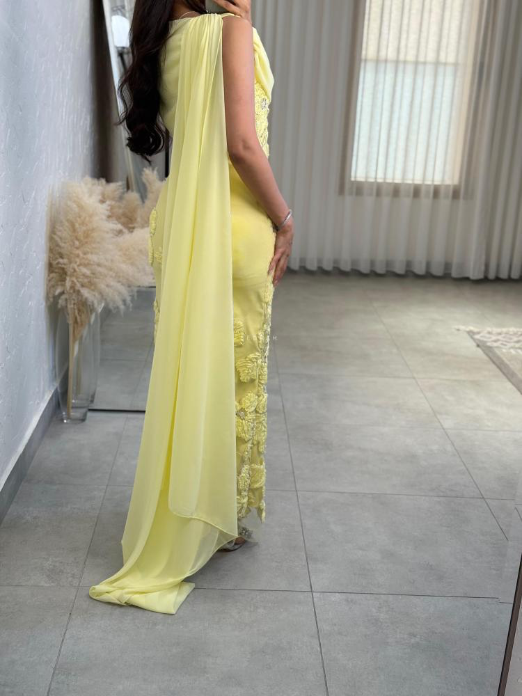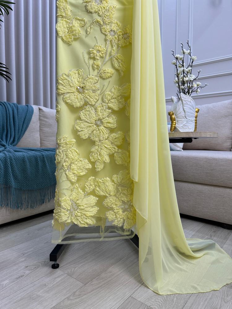 فستان سهره اللون اصفر باربي وتل علا ورد جوده و فخامه و تصميم مميز باتقان من متجر جوهره MN FH