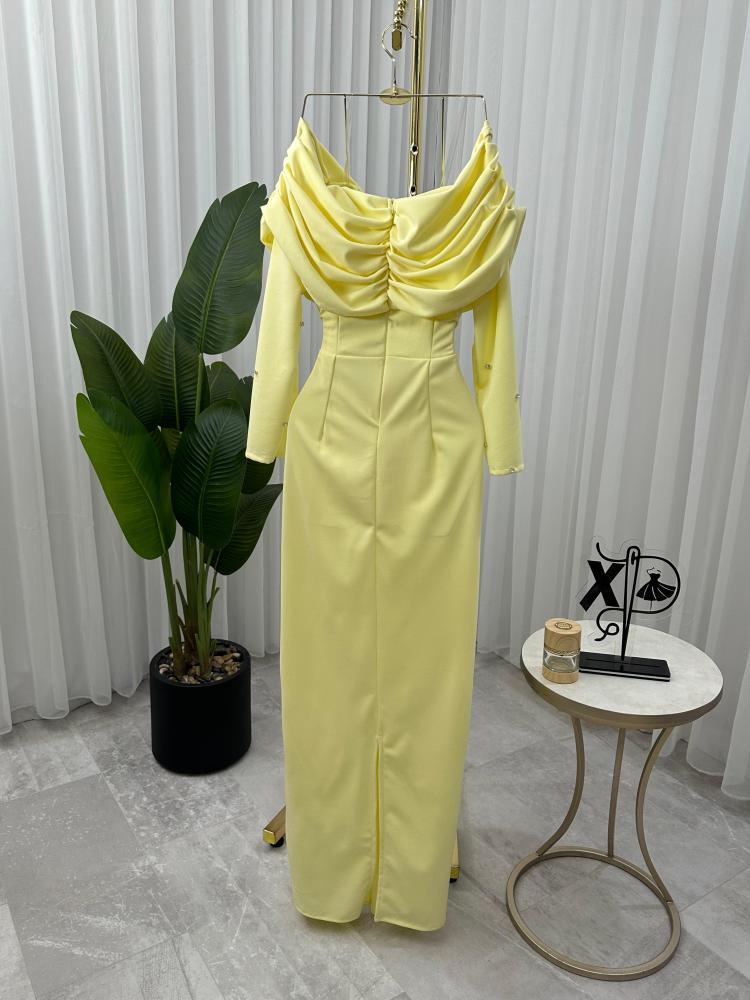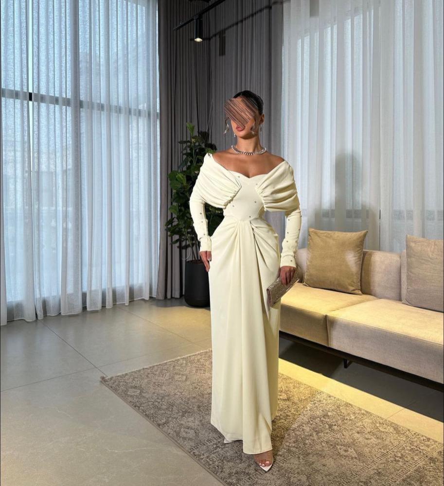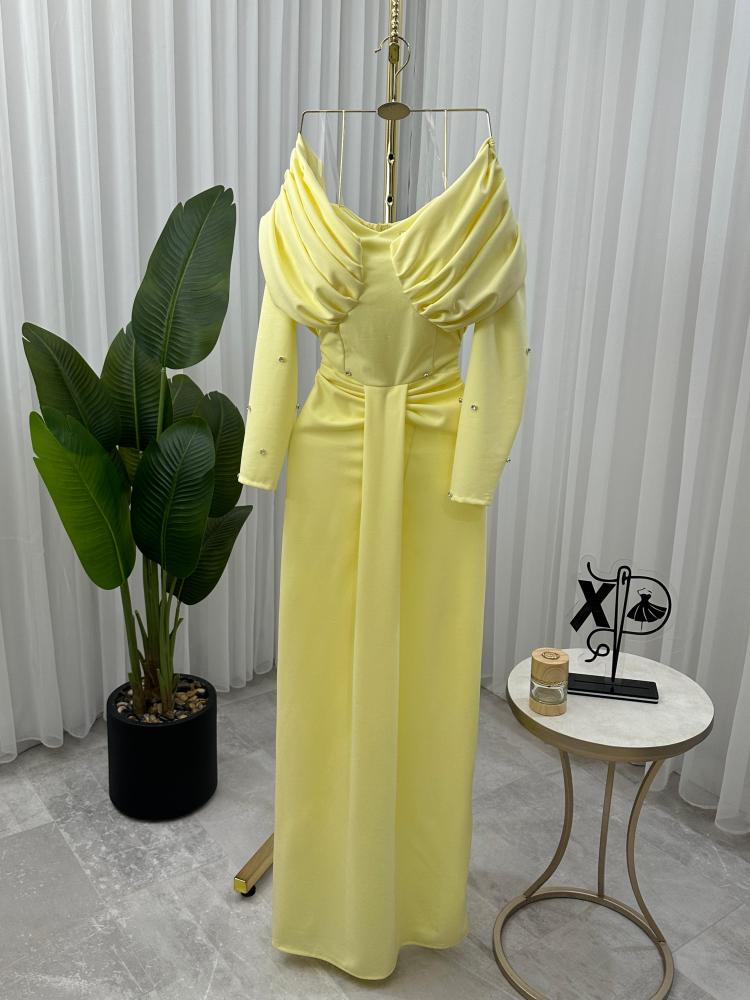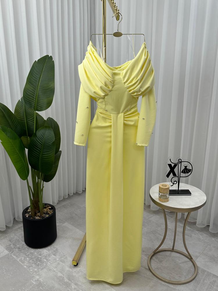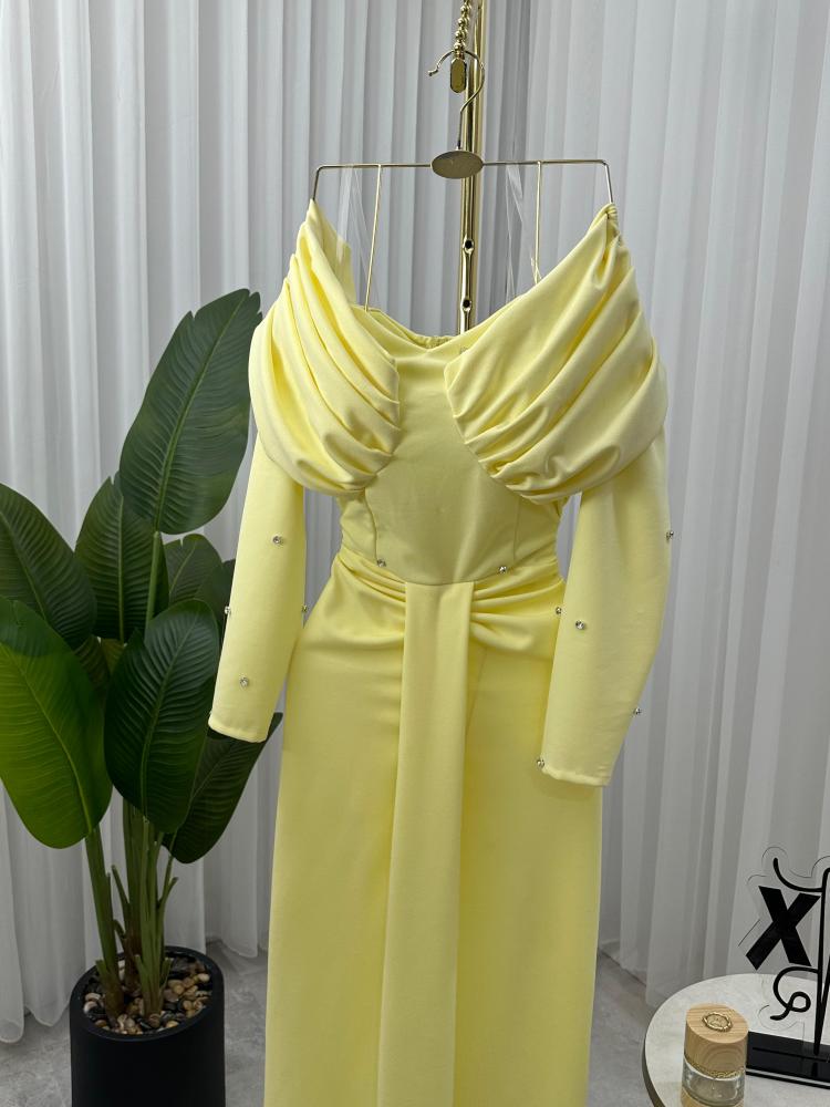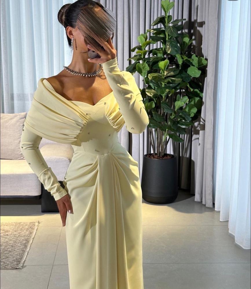 فستان ناعم باكمام طويله مع قصه طيات متجانسه من الصدر الى الكتفين و طيات على الخصرلتعطيك اطلاله مميزه الخامه : كريب باربيالتمدد: غير قابل للتمدداللون : اصفر المفاسات : S M L XL XXL XXXL