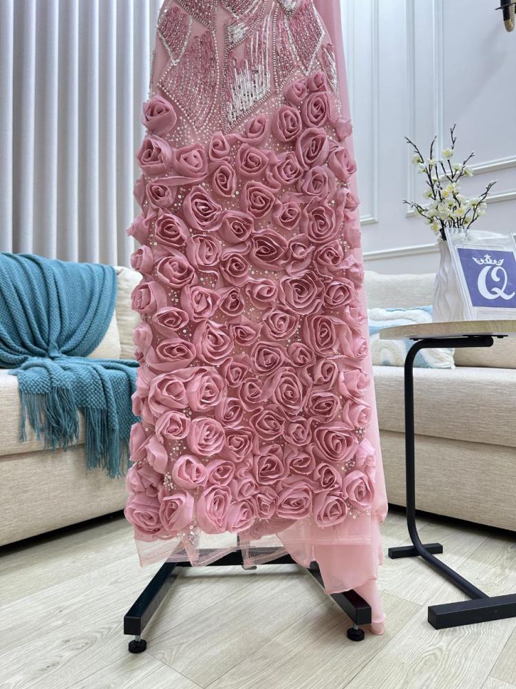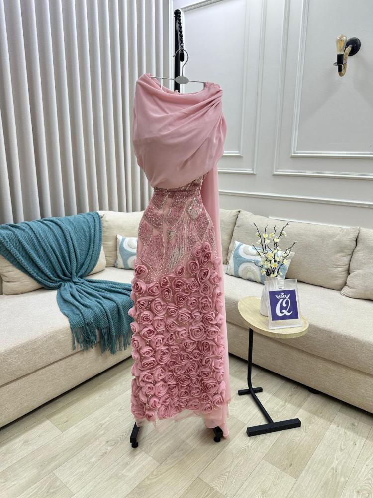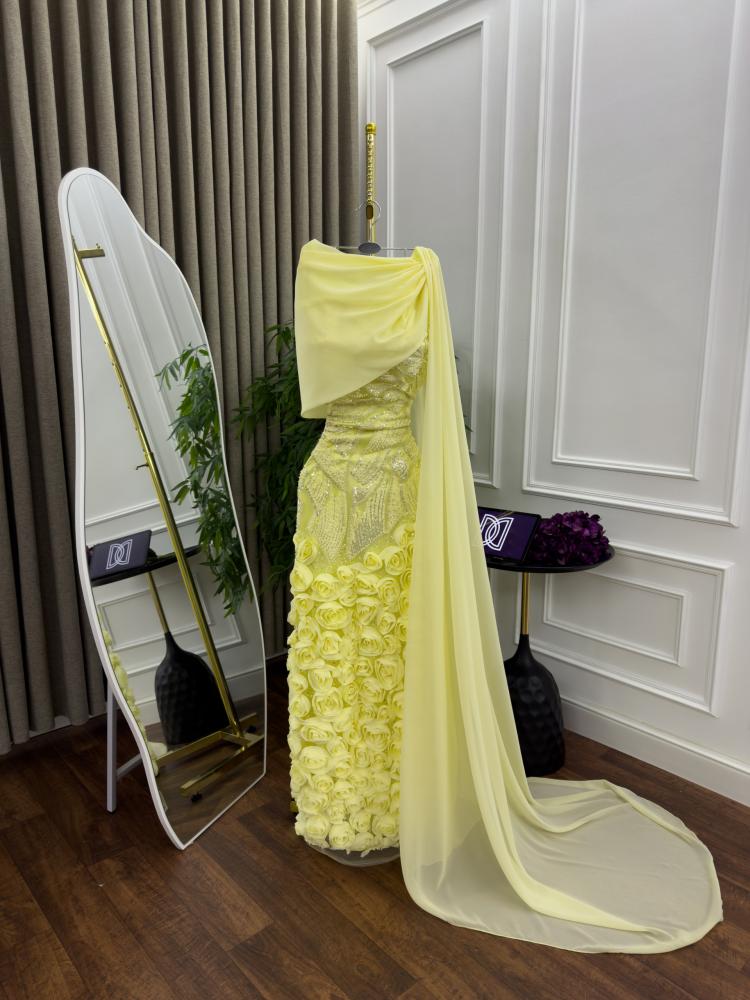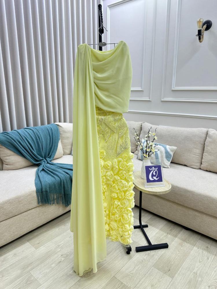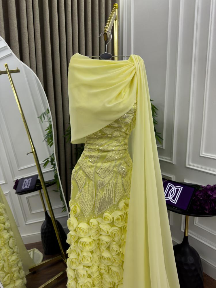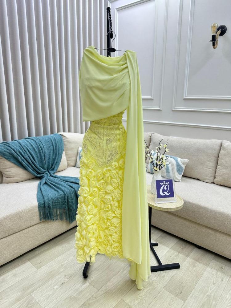 فستان سهره الالوان اصفر و وردي قماش ورود وتطريز خرز وترتر وقصة روعه وشال جورجيت من متجر جوهره QU D