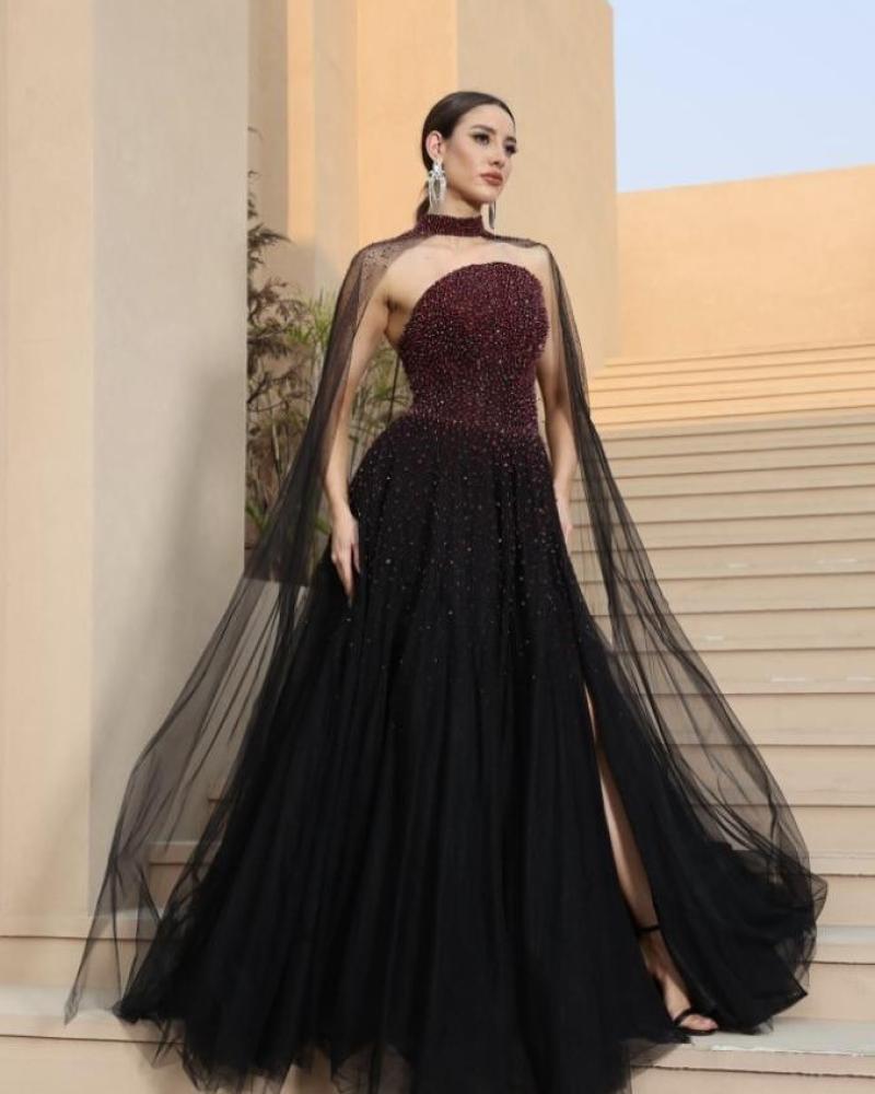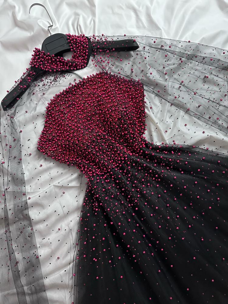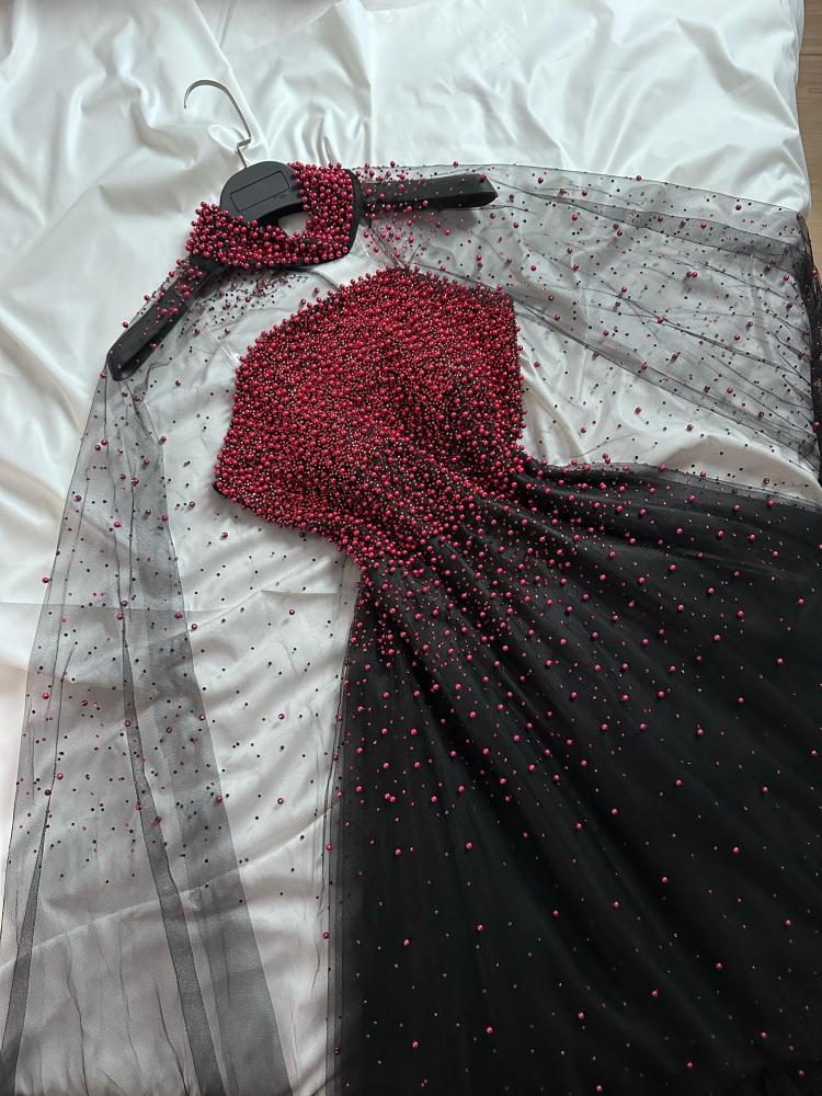 فستان سهره فخم اسود على احمر الخامه شيفون على كبس لولو على تطريز فصوص تفته من تحت من متجر جوهره Q