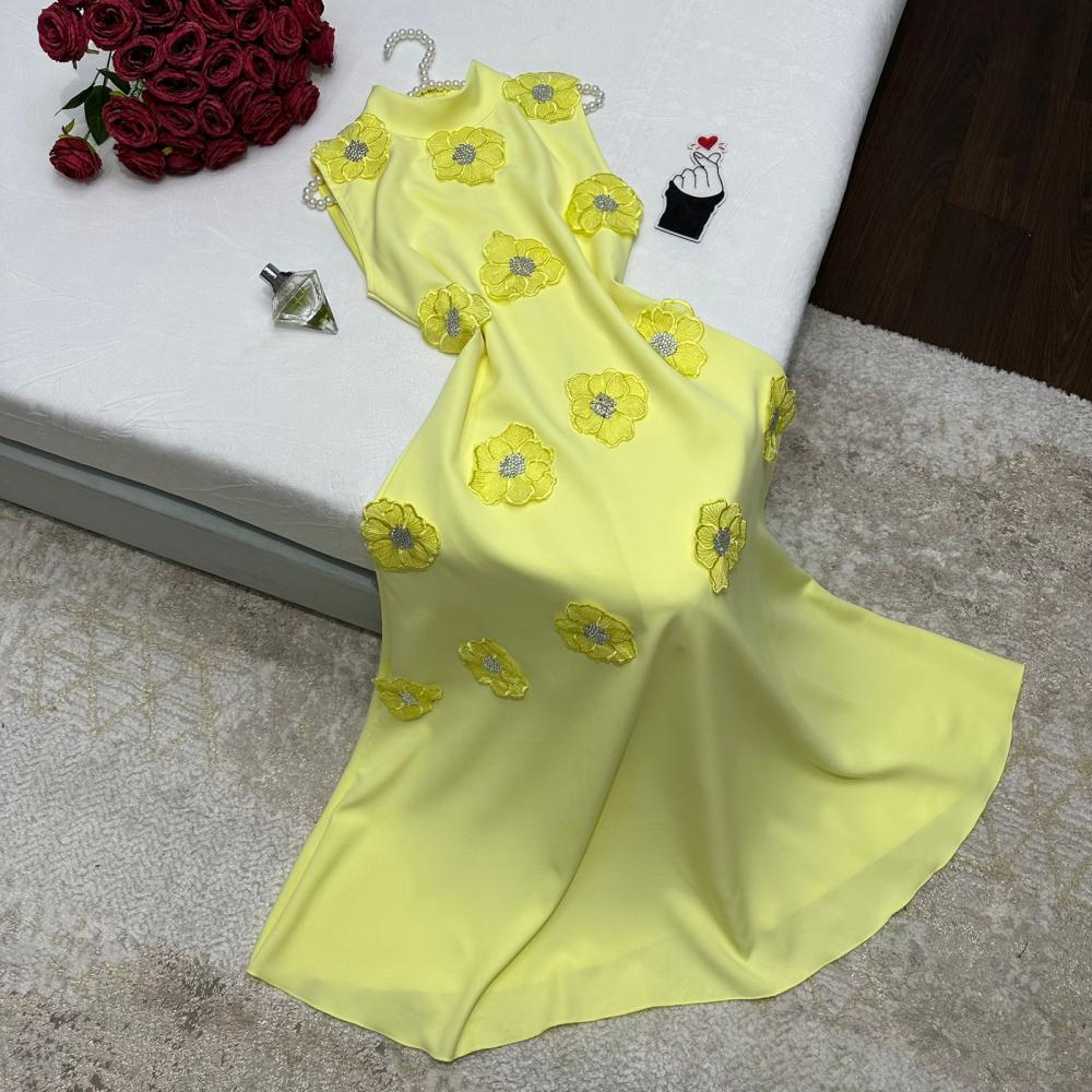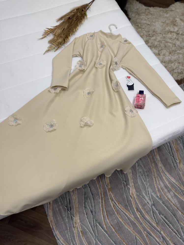فستان باربي مزين بكلف من الورد بلون بيج و الاصفر من متجر جوهره