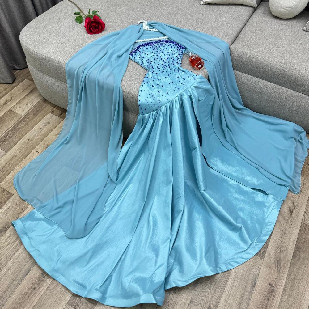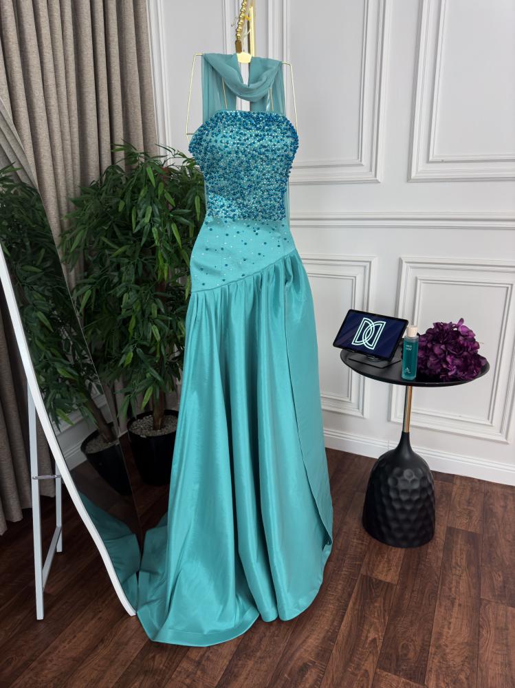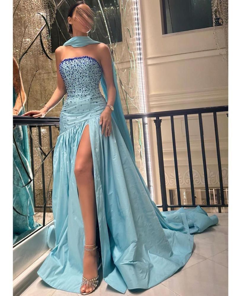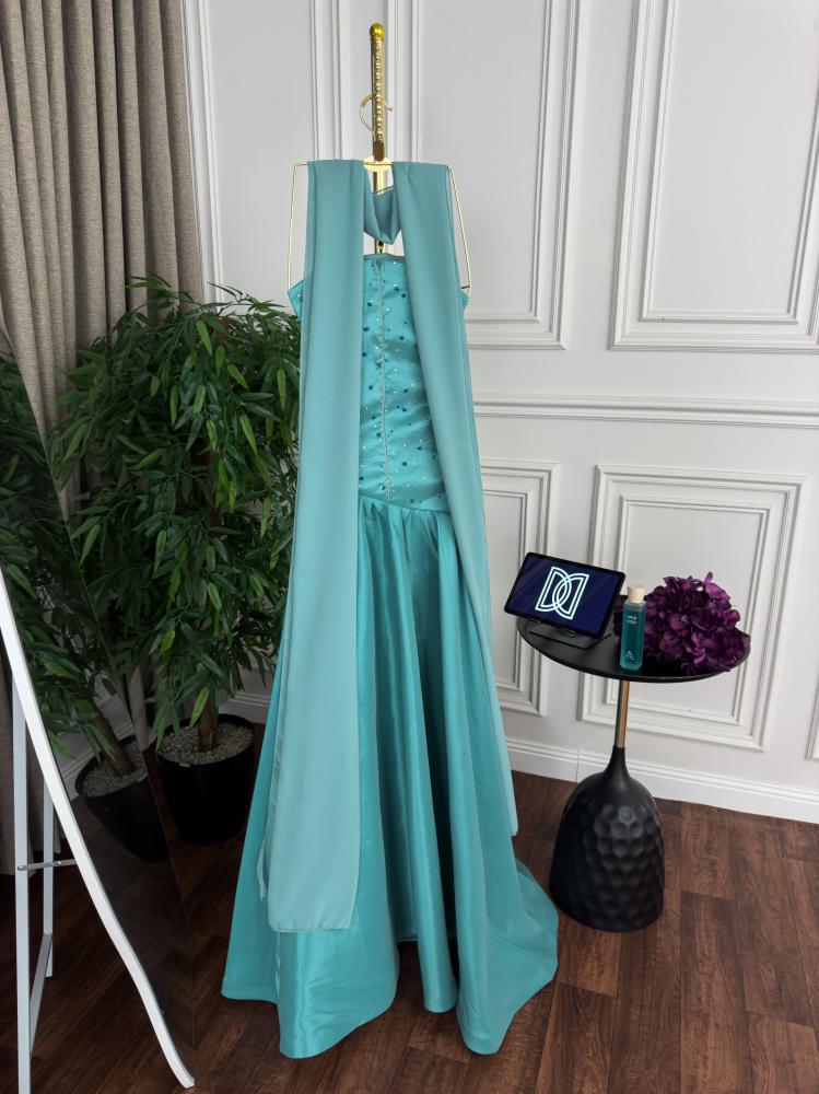 وصف المنتجتصاميم : فستان سهره اوف شولدر مطرز بالخرز على التوب و الخصر مع فتحه جانبيه و قصه كلوش بكسر وشال من الشيفون اللون : سماوخط العنق : اوف شولدرنوع القماش : شانطون و شيفونالتمدد: غير قابل التمددالمقاسات المتوفره :S – M – L- XL –XXL –