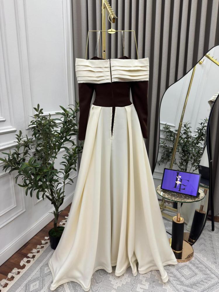 فستان سهره اللون بني على بيج كلفه سهره تحت ورود الصدر والذيل باربي من متجر جوهره LF