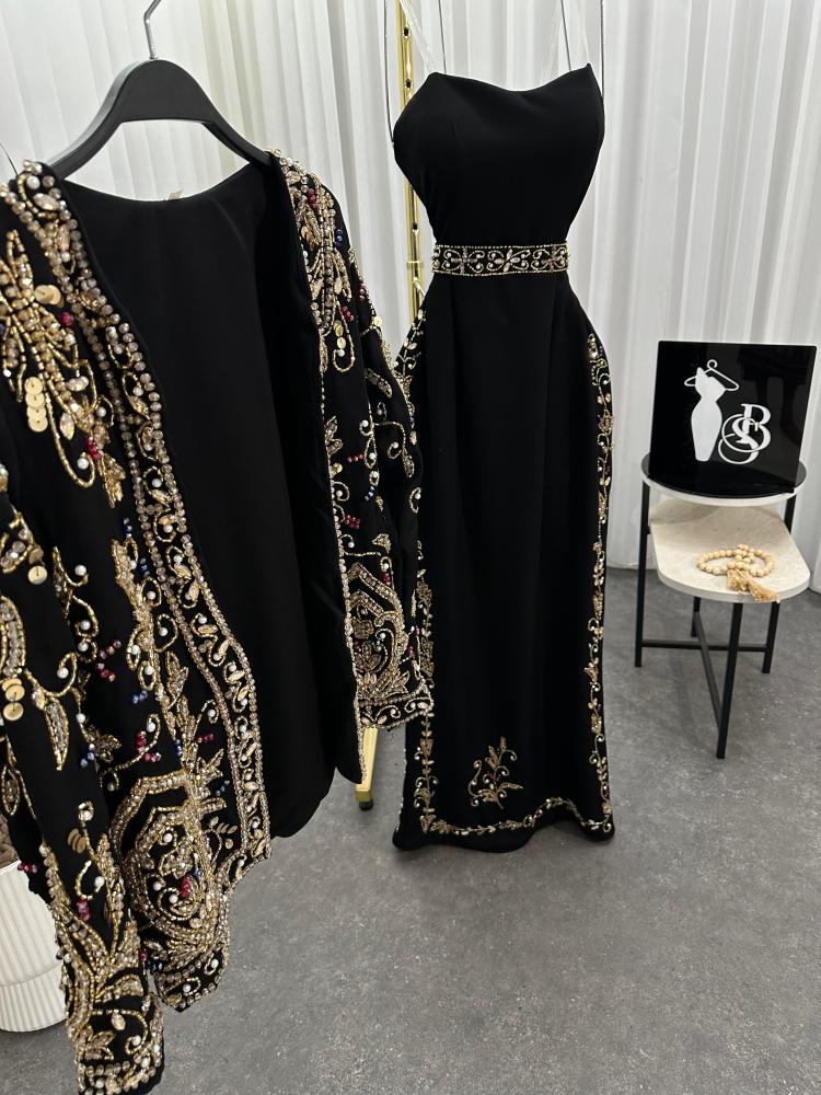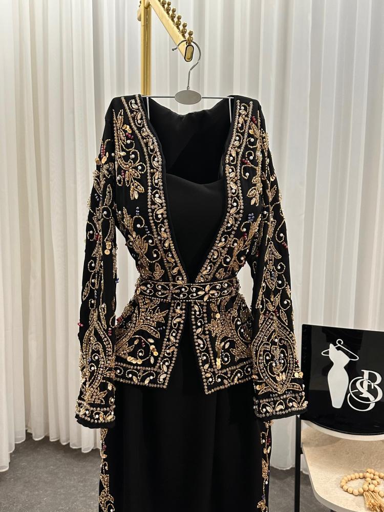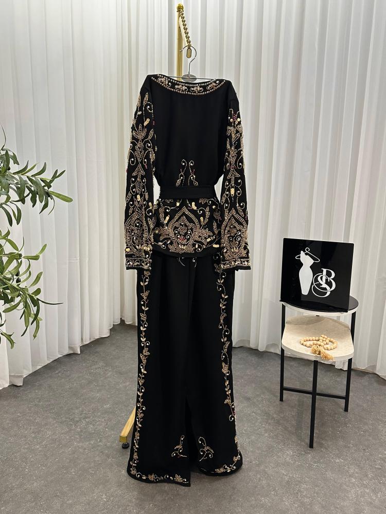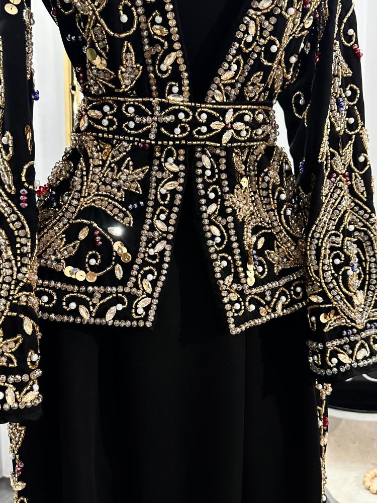 فستان سهره اللون اسود قطعتين تطريز يدوي راقي على القماش مطعم بفصوص واحجار الزركو من متجر جوهره BS