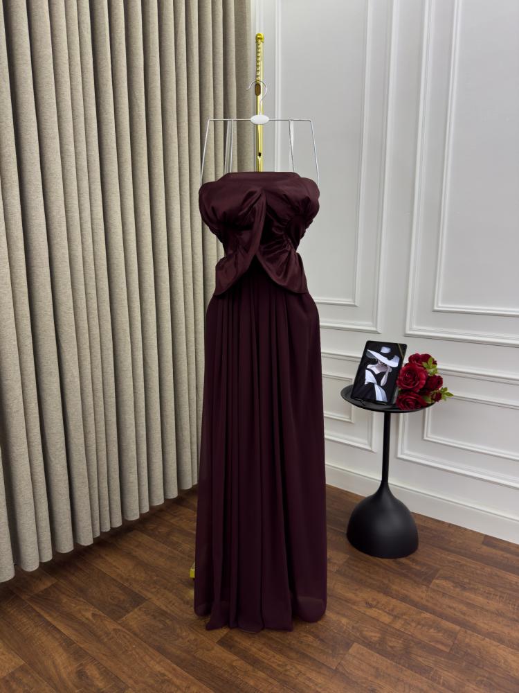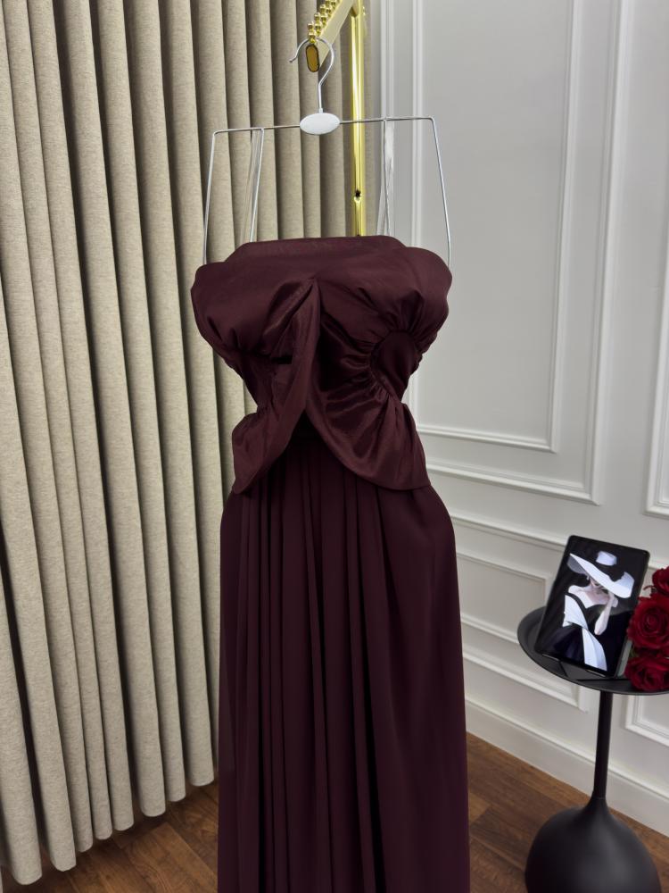 فستان سهره اللون بني الخامه شيفون صدريه شانطون من متجر جوهره JR