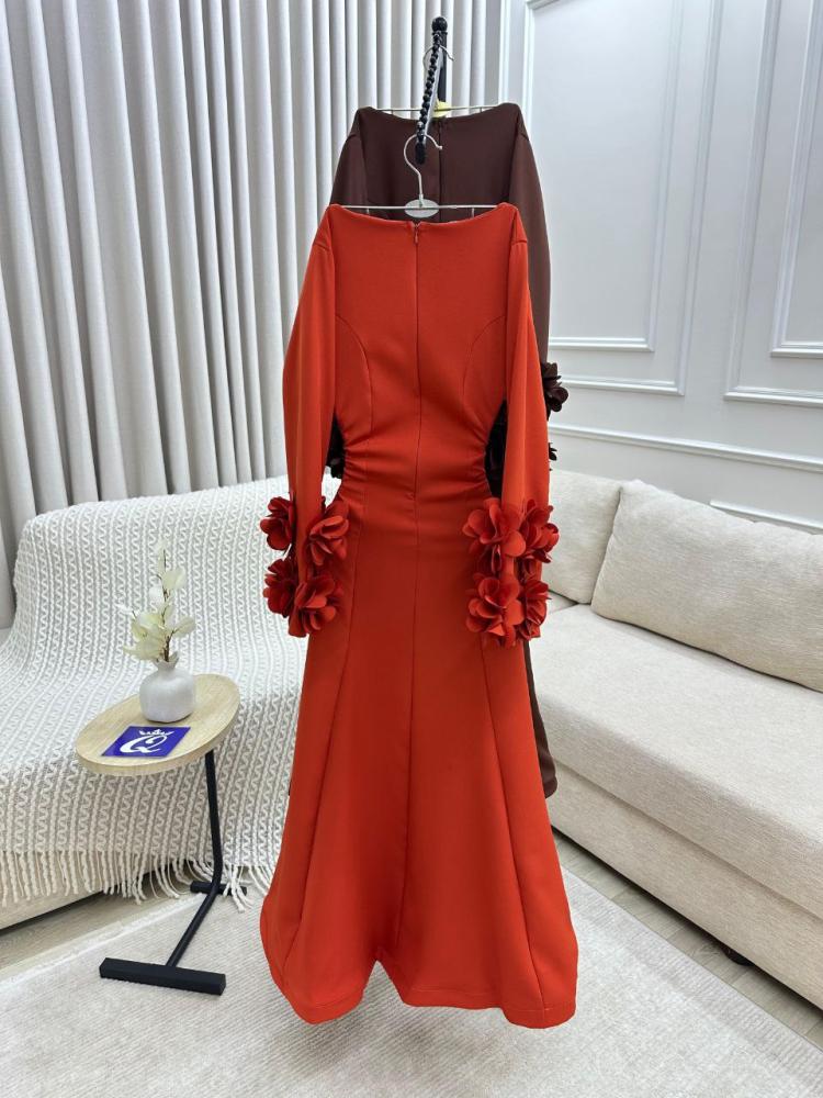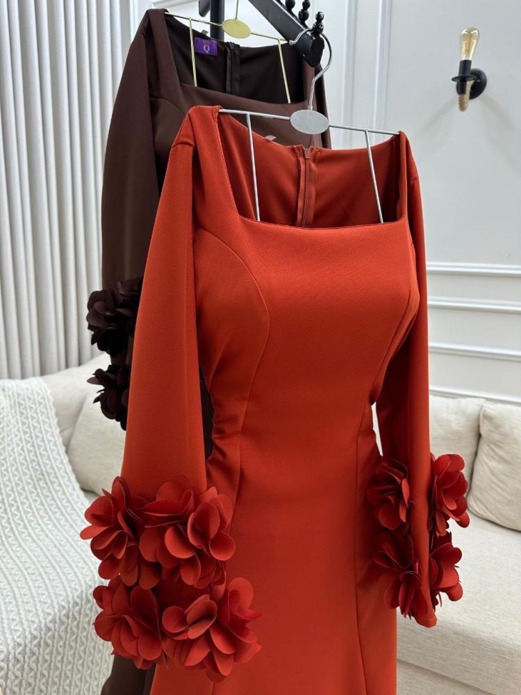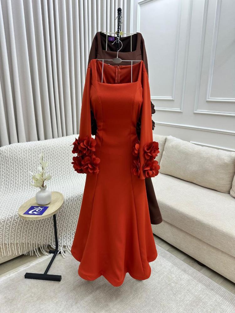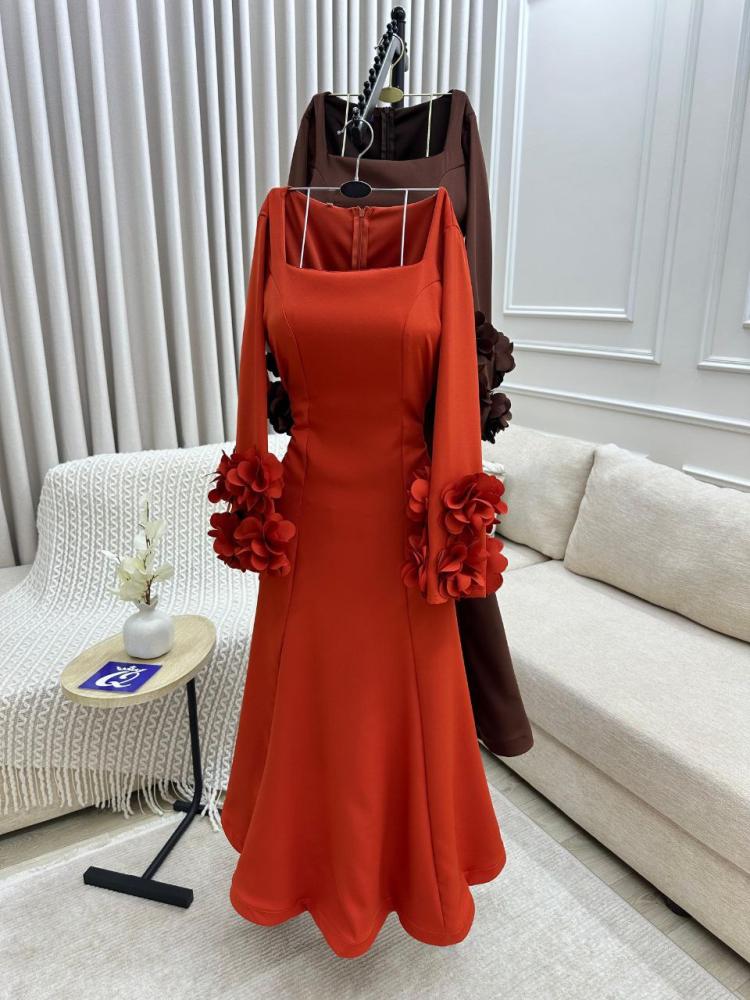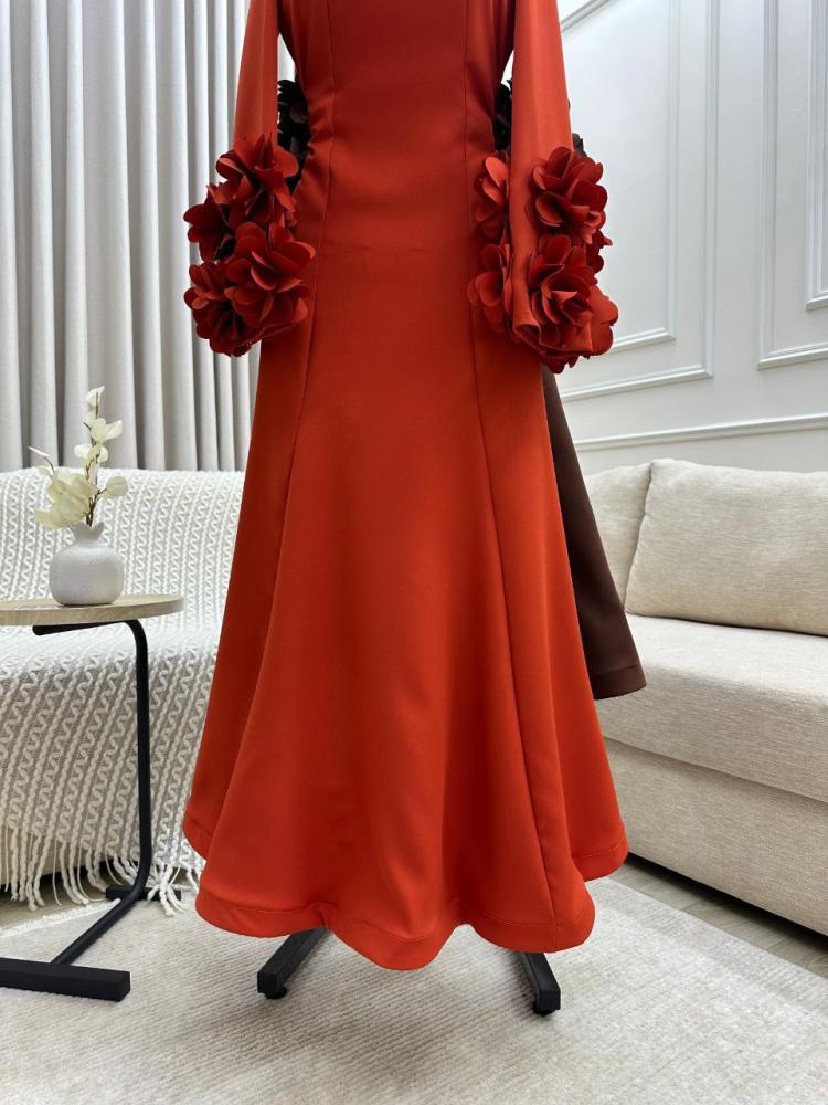 فستان ناعم برتقالي و بني باكمام من البتلات