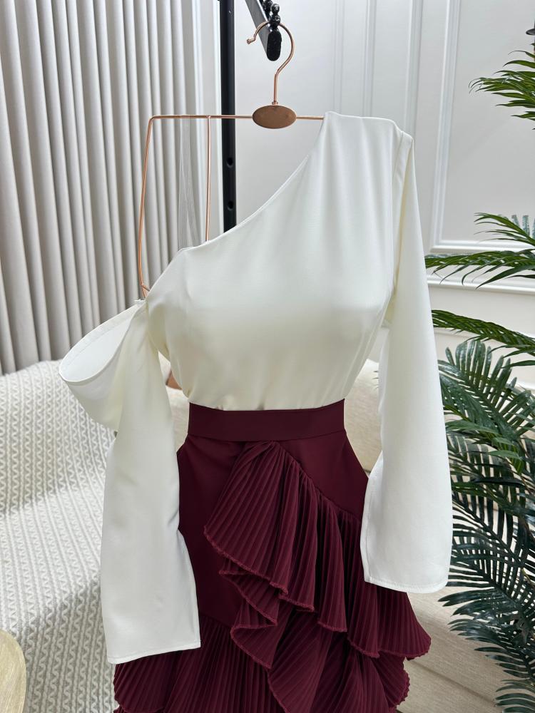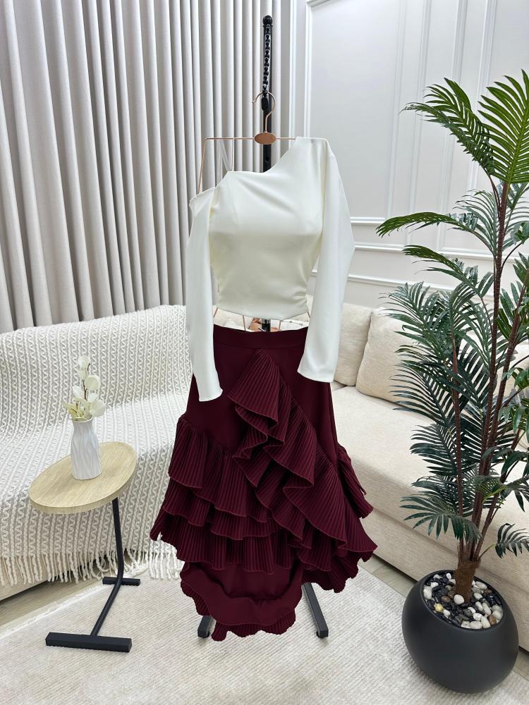 فستان مكون من قطعتين بلوزه ون شولدر و تنوره تصميم ايطالي لون سكري و عنابي من متجر جوهره