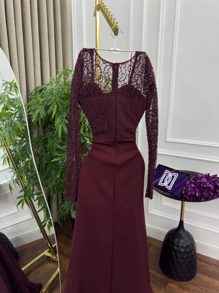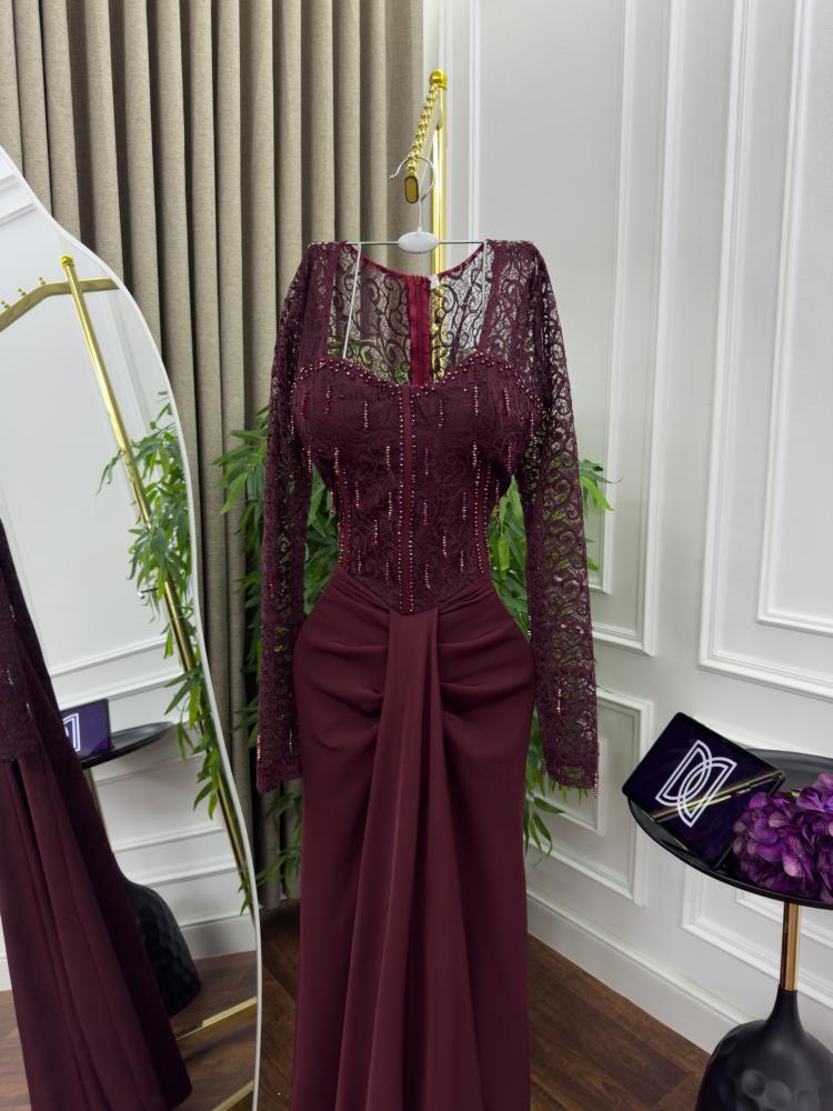 فستان سهره االلون برغندي الصدر دنتيل تطريز يدوي وتحت باربي من متجر جوهره D