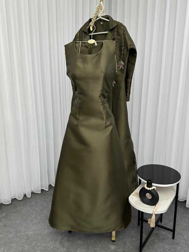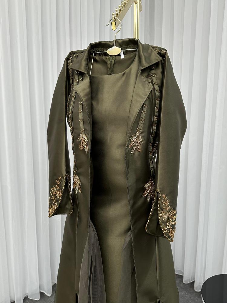 جلابيه مع جاكيت لون زيتي لخامة ميكادو خرز يدوي فخم من متجر جوهره