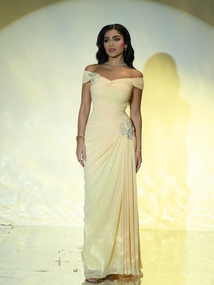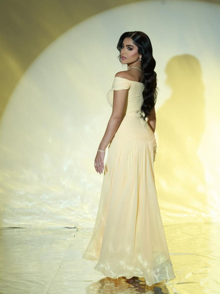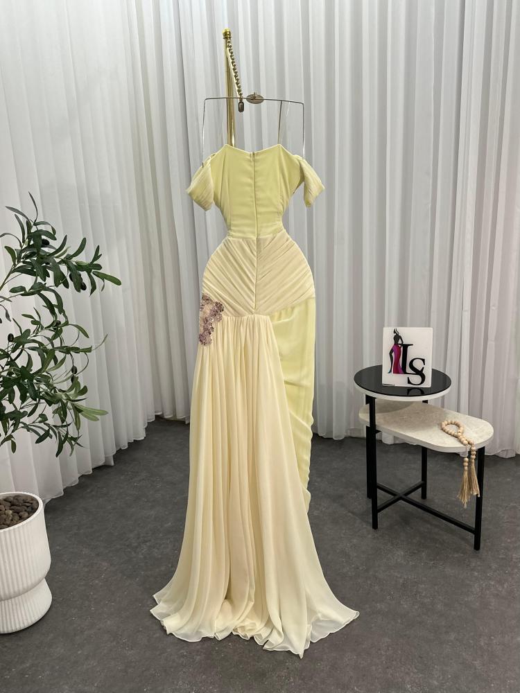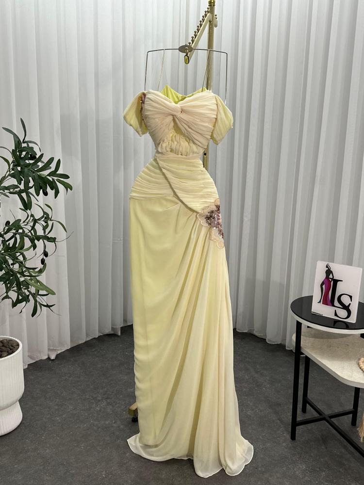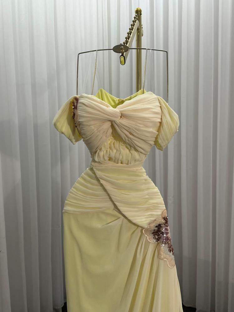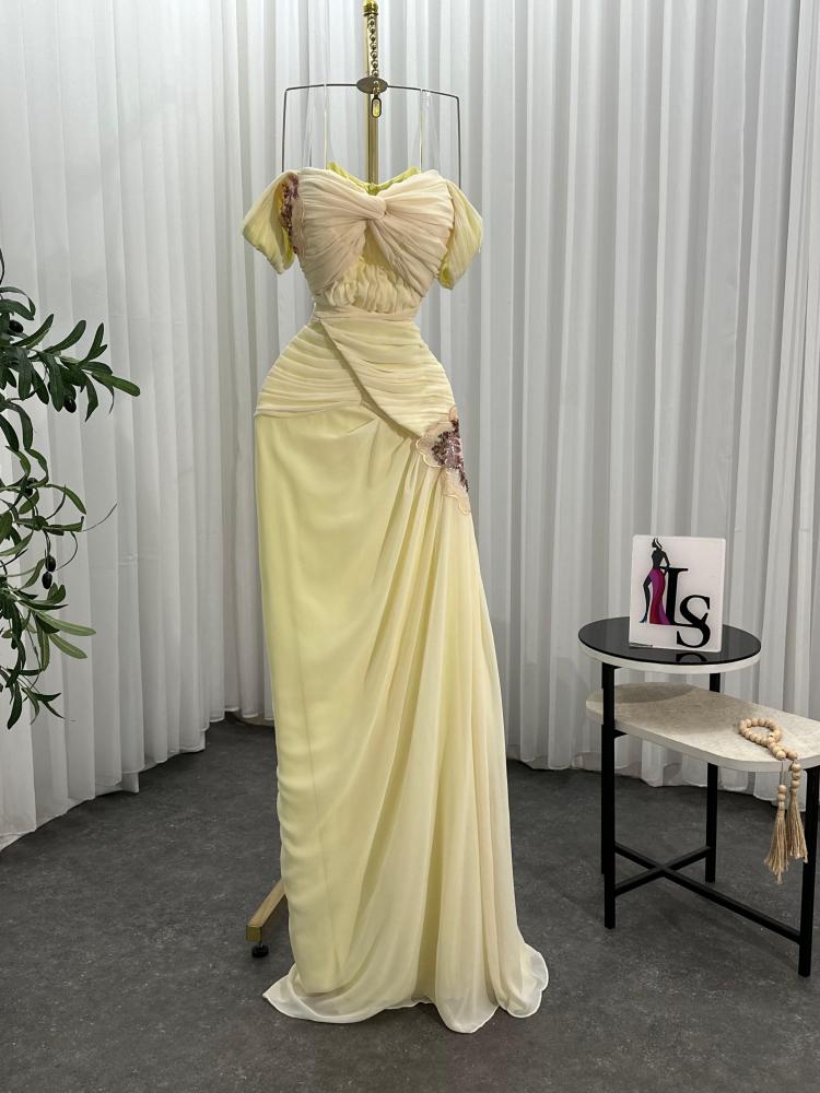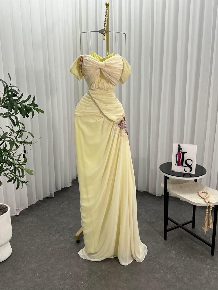 فستان سهره اللون اصفر شيفون مبطن بلبانه استرتش من متجر جوهره LS