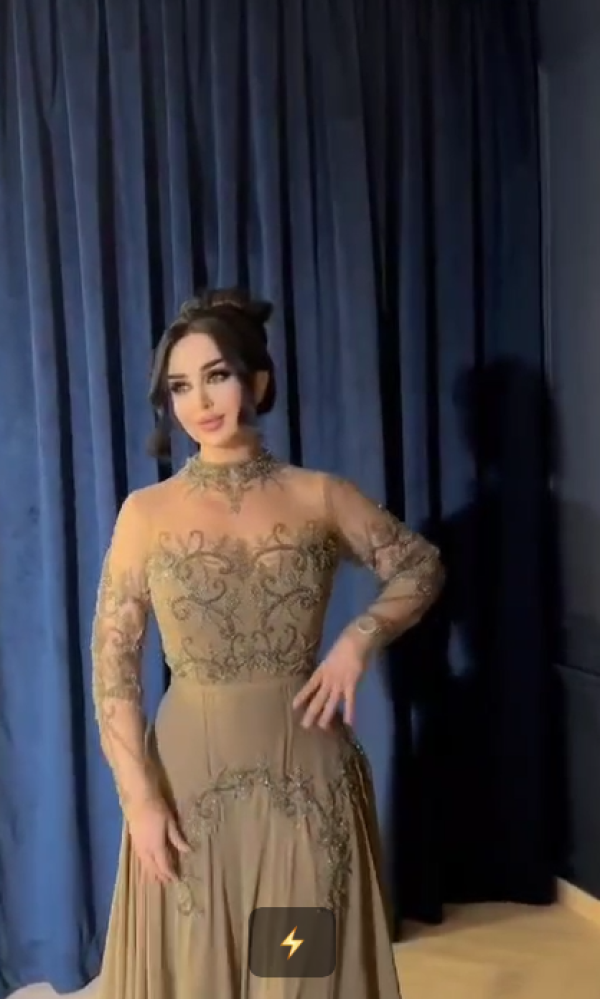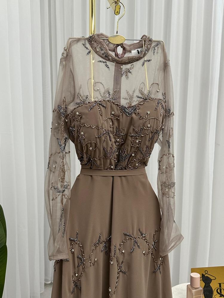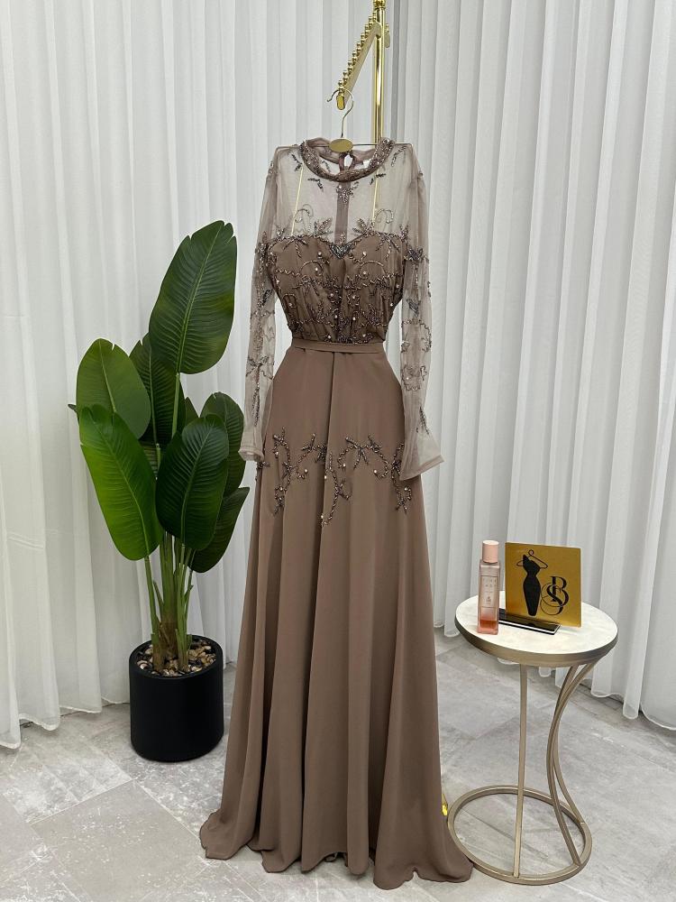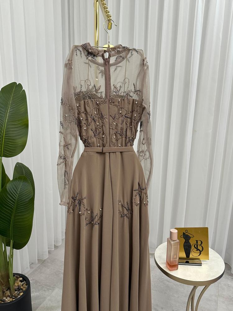 فستان سهره اللون بني الخامه شيفون جورجيت. تطريز يدوي راقي على القماش من متجر جوهره BS