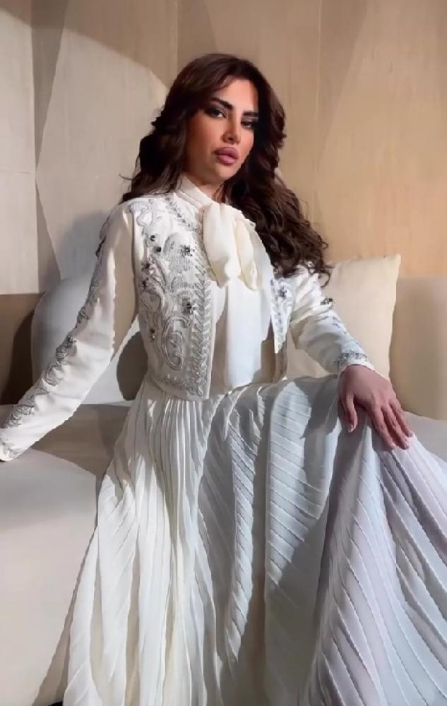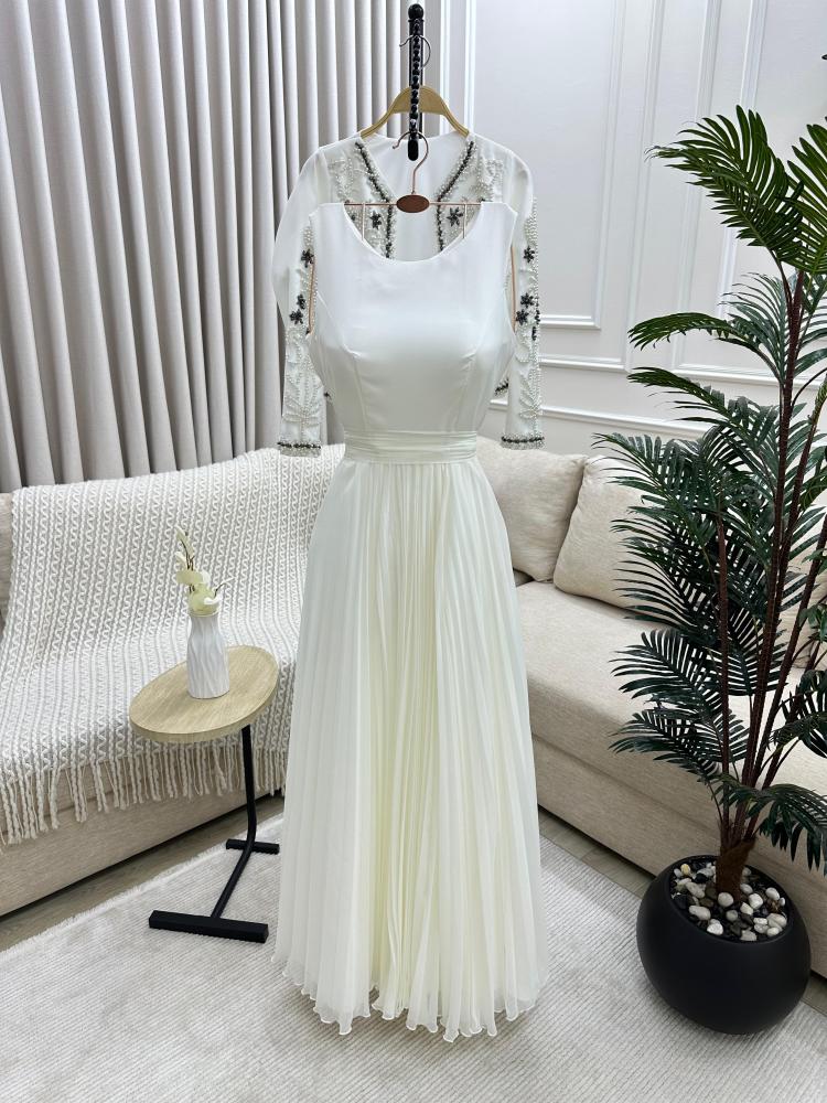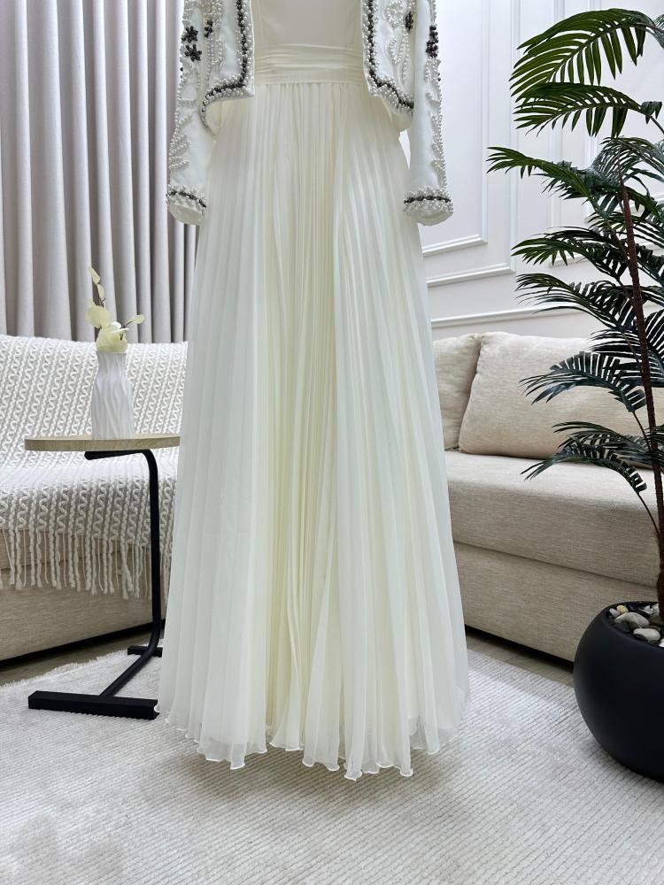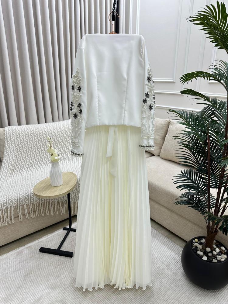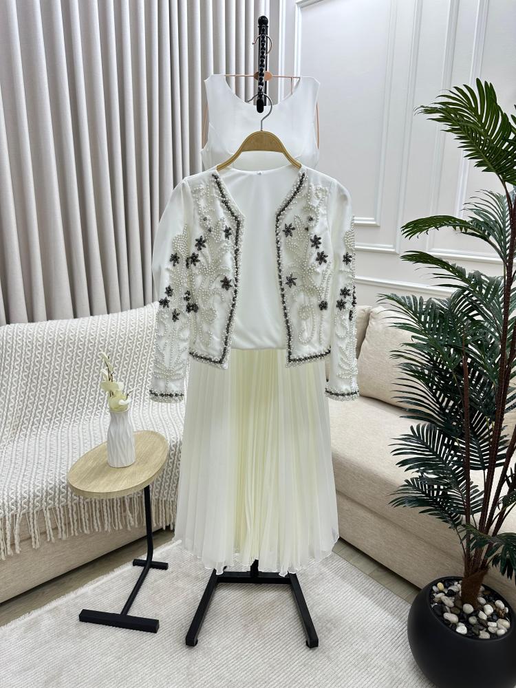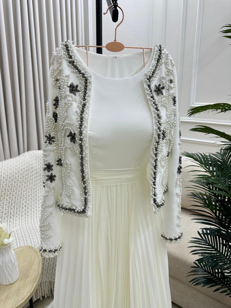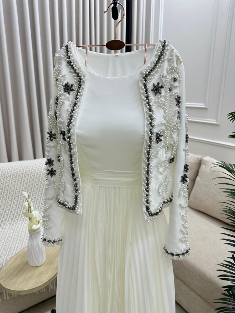 فستان ابيض و اسود مكون من قطعتين مع جاكيت قصير مطرز خامه باربي و شيفون تطريز راقي