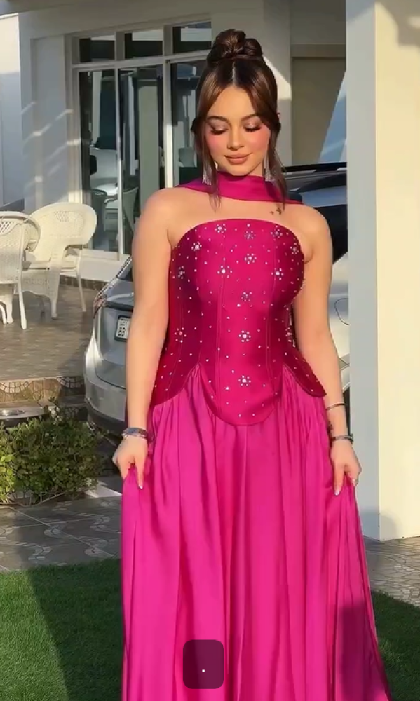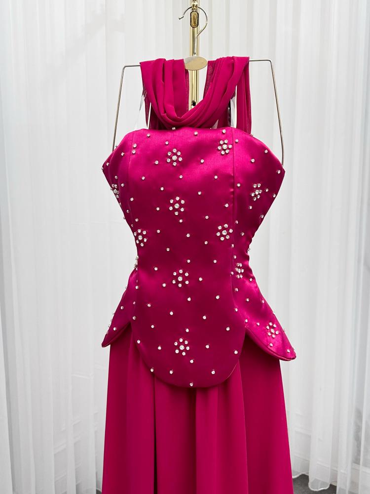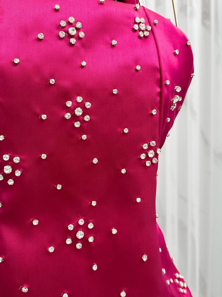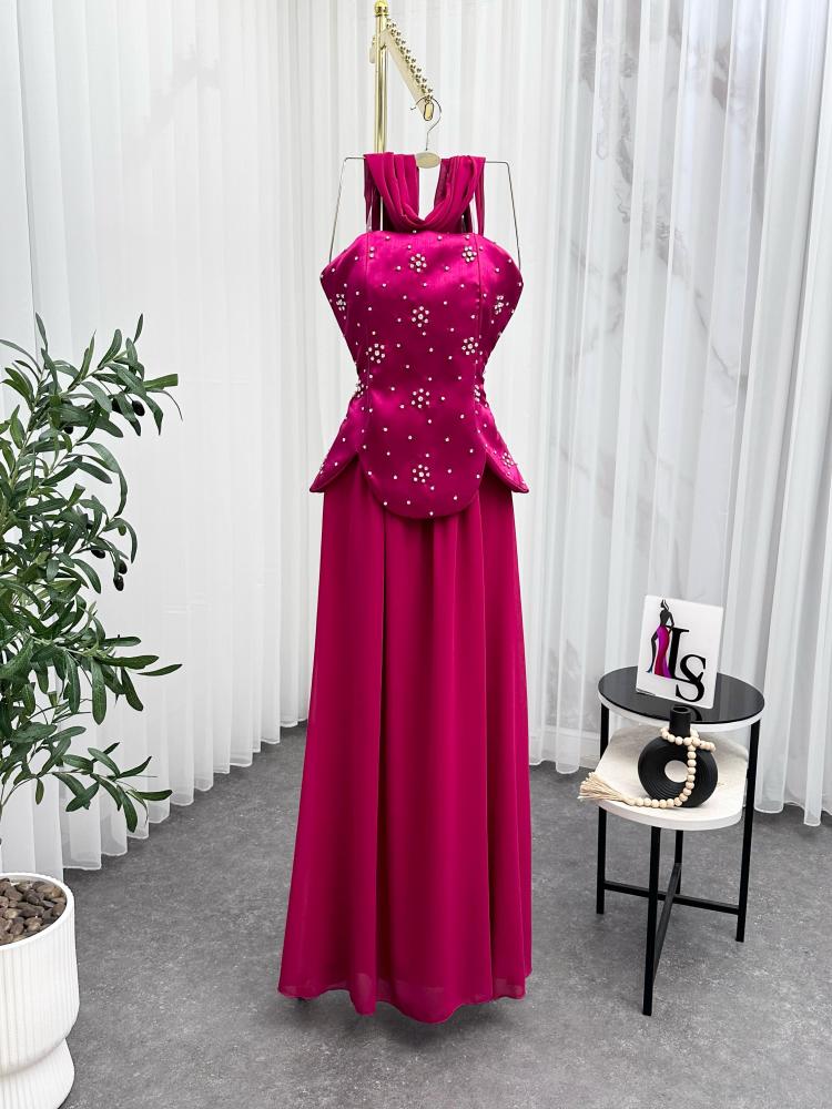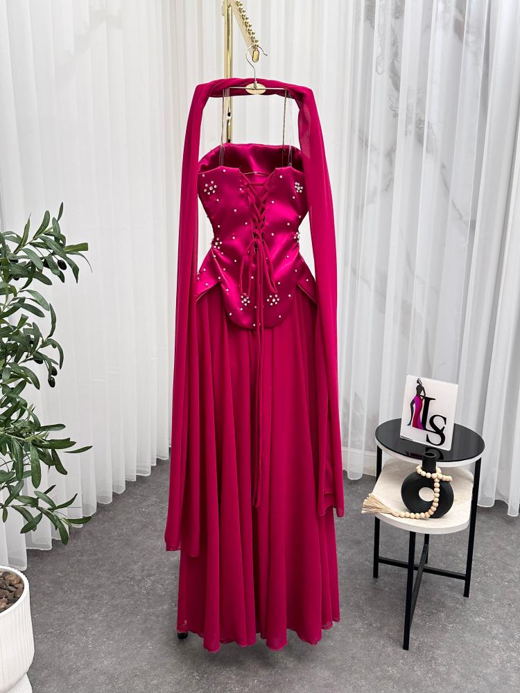 فستان سهره اللون فوشي الخامه ميكادو مطرز مع شيفون جورجيت LS