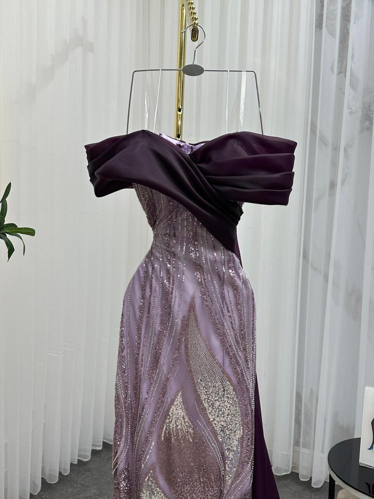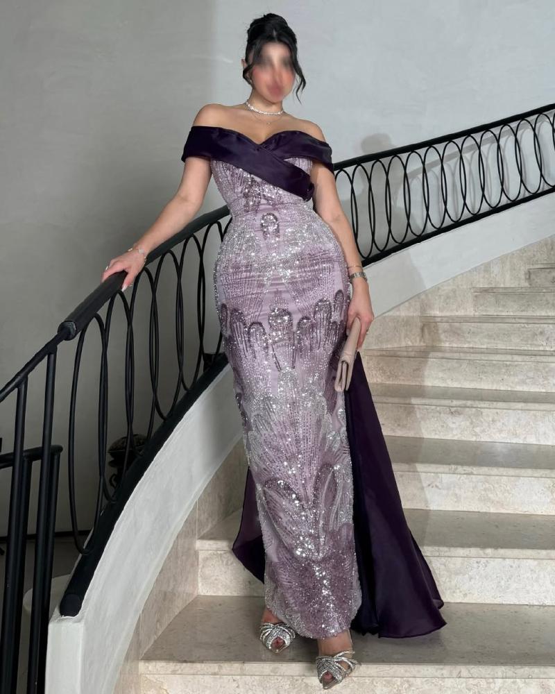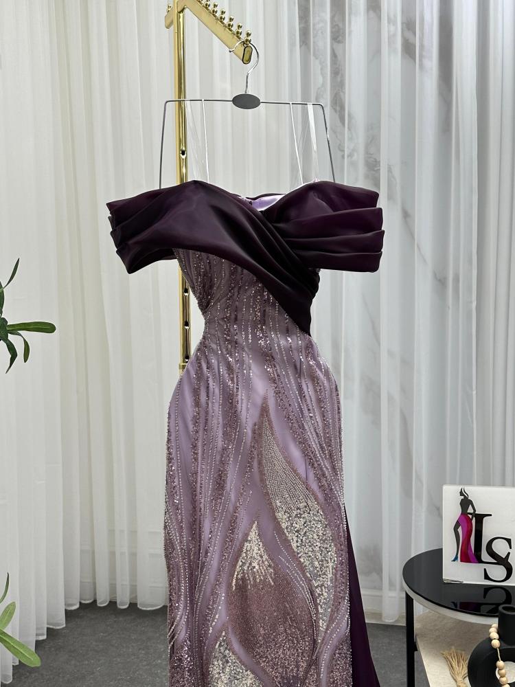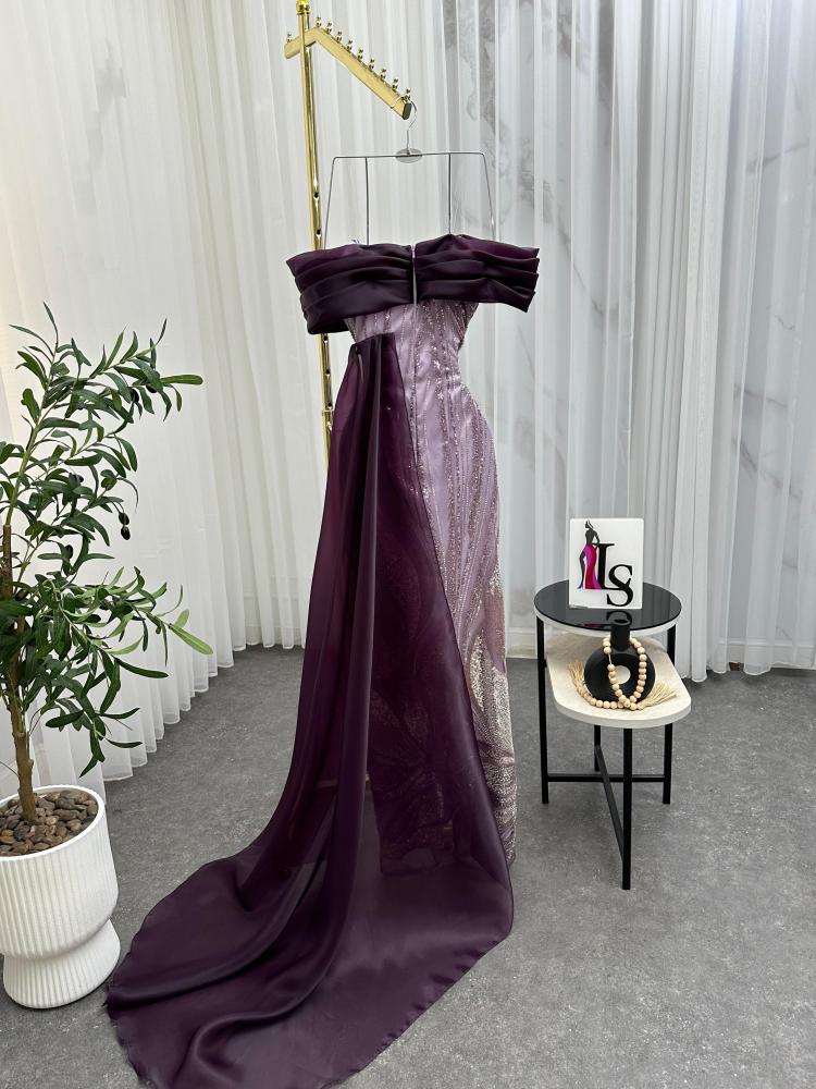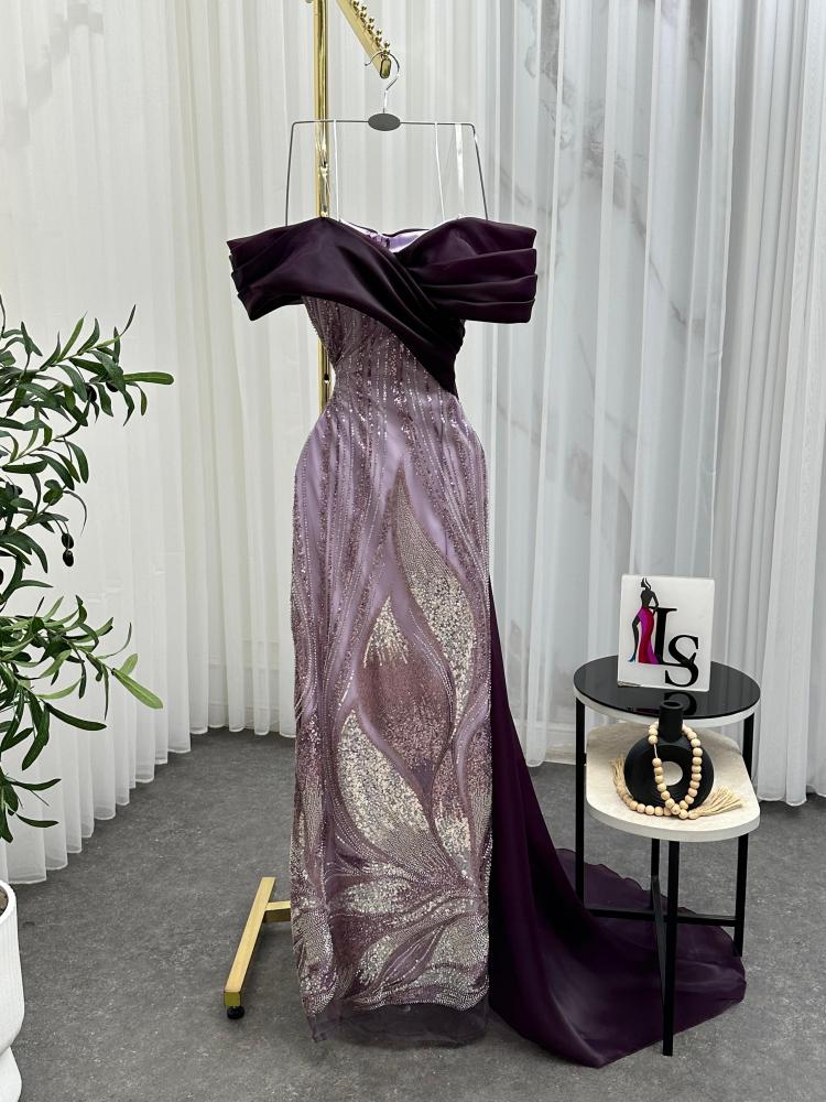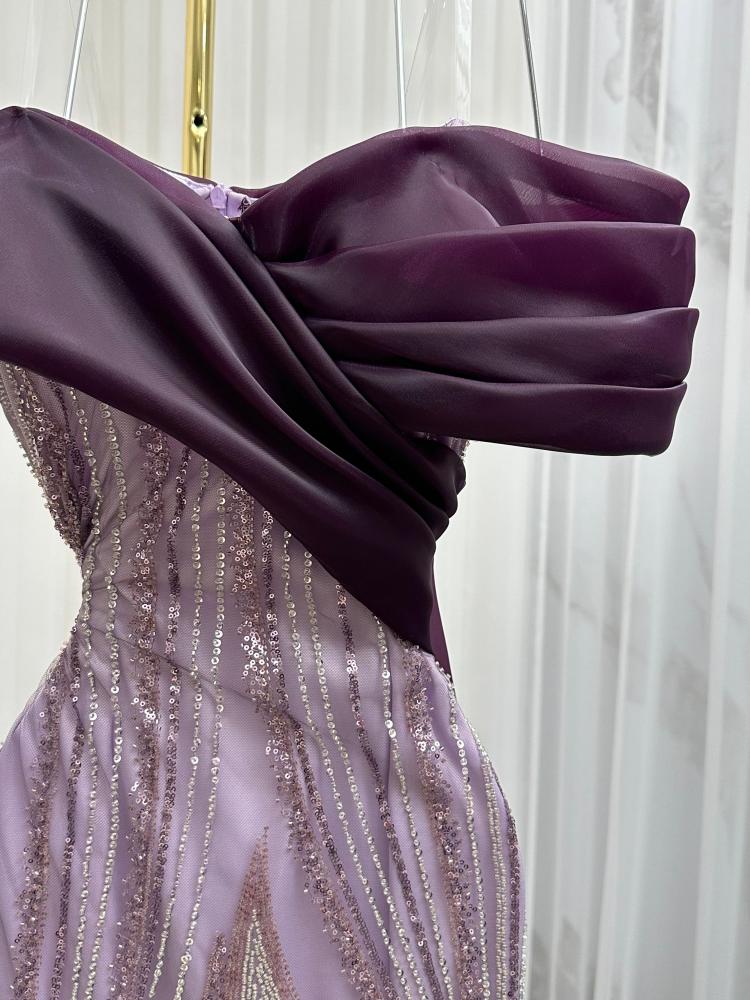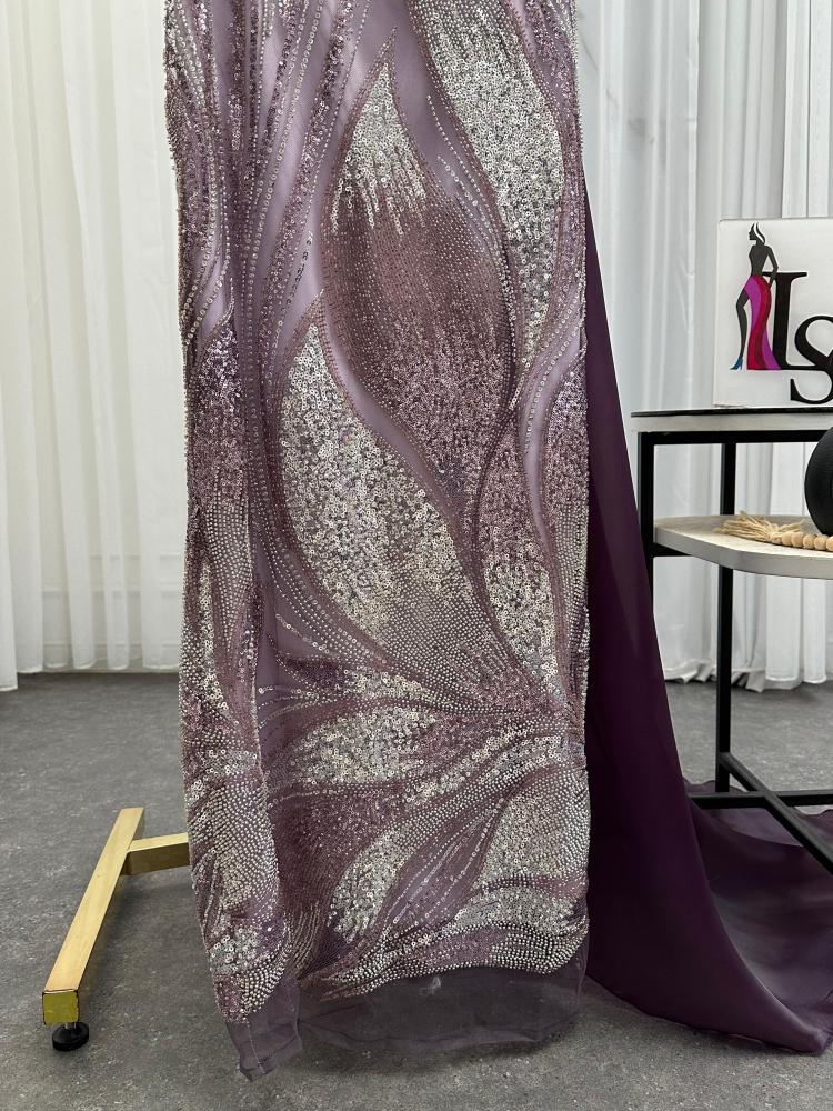 فستان سهره اللون موف الخامه تفته استرتش مغطى بتل مطرز مع اورجنزا LS