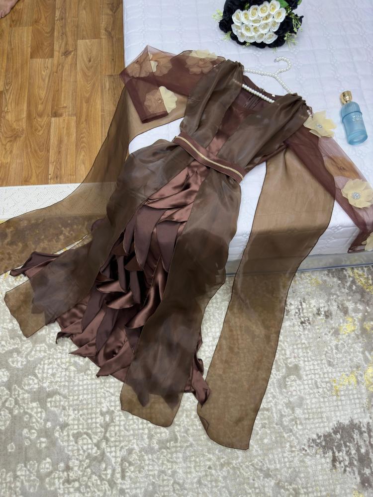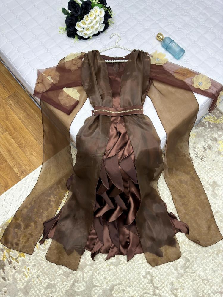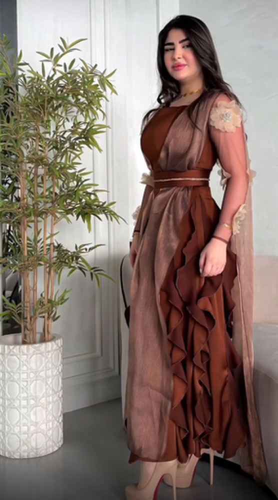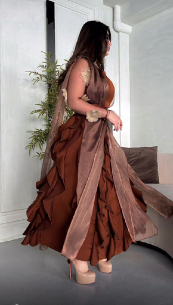 فستان ناعم اللون بني القماش تفته سترتش جازار ورود ليزر AR