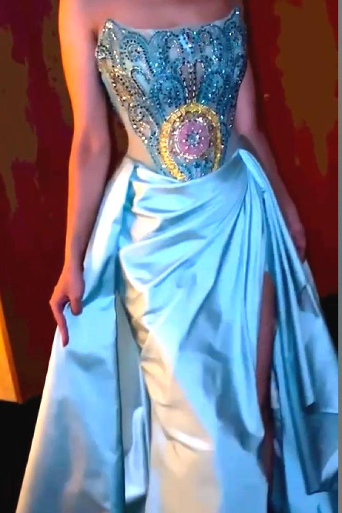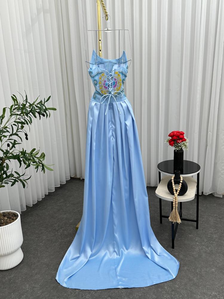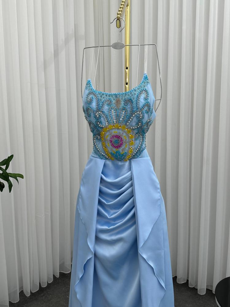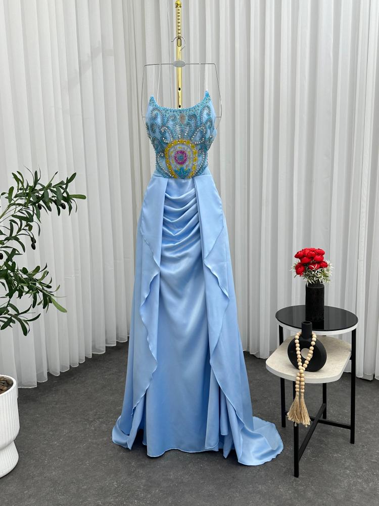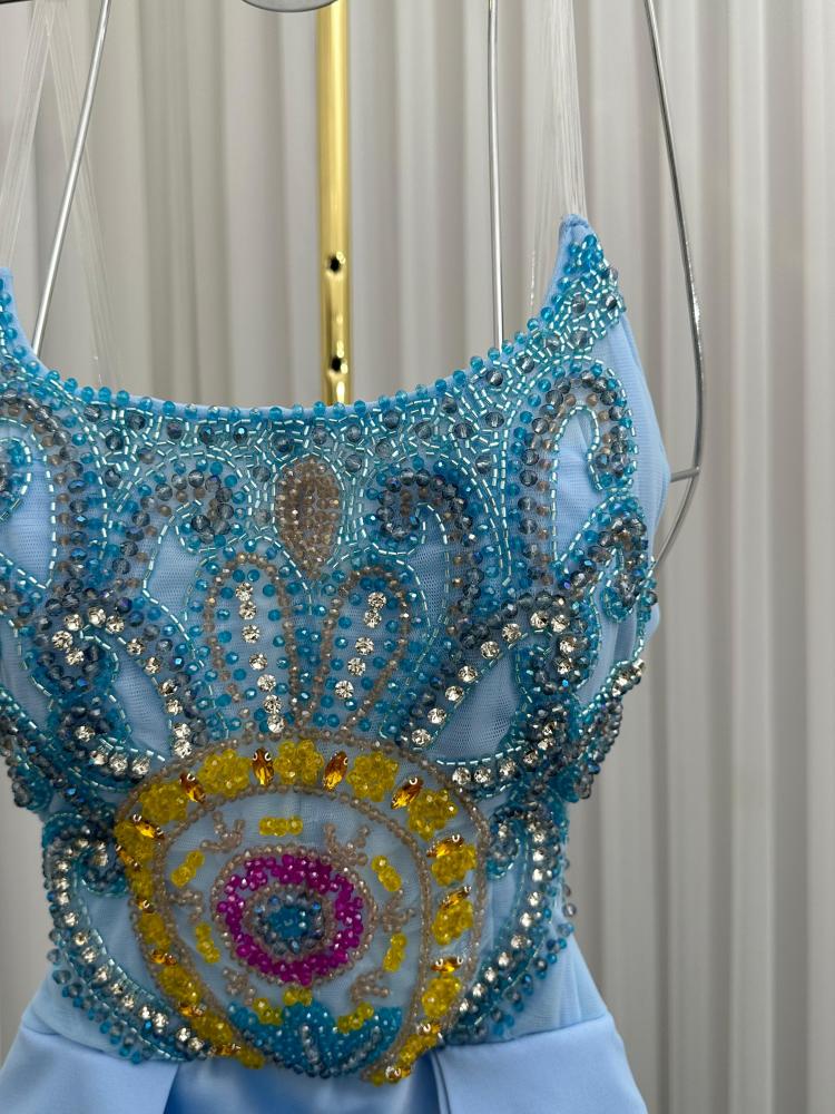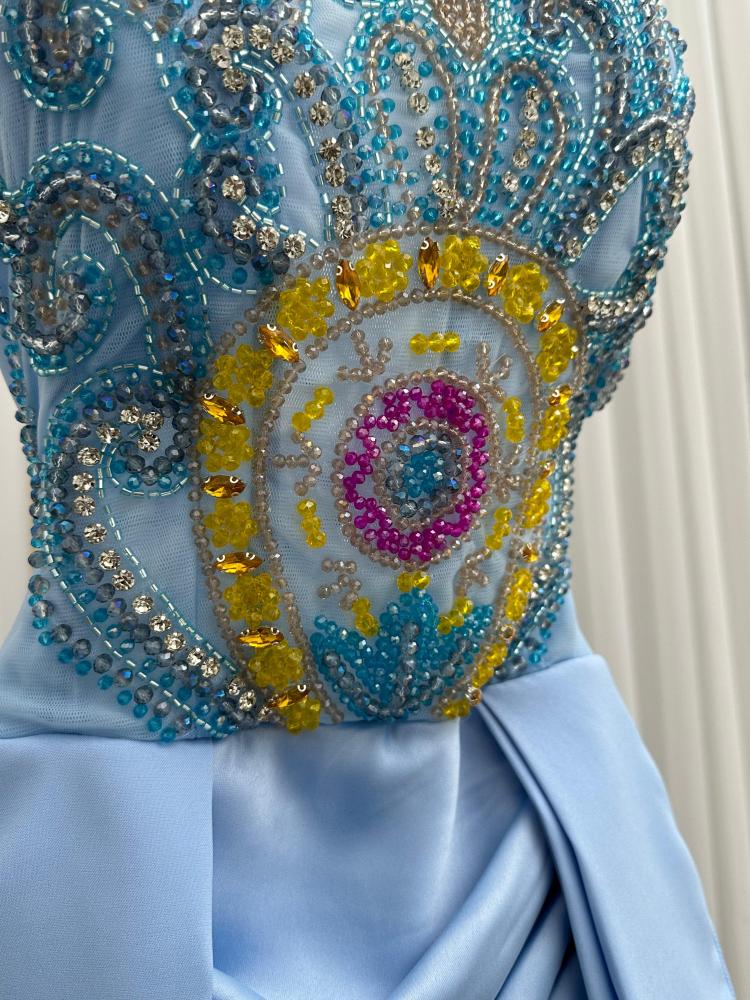 فستان سهره اللون سماوي ناعم القماش تفته استرتش تطريز يدوي من متجر جوهره FB