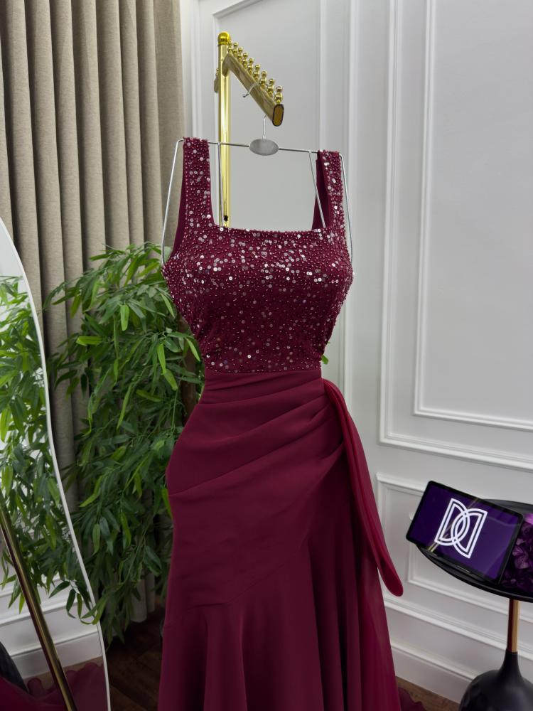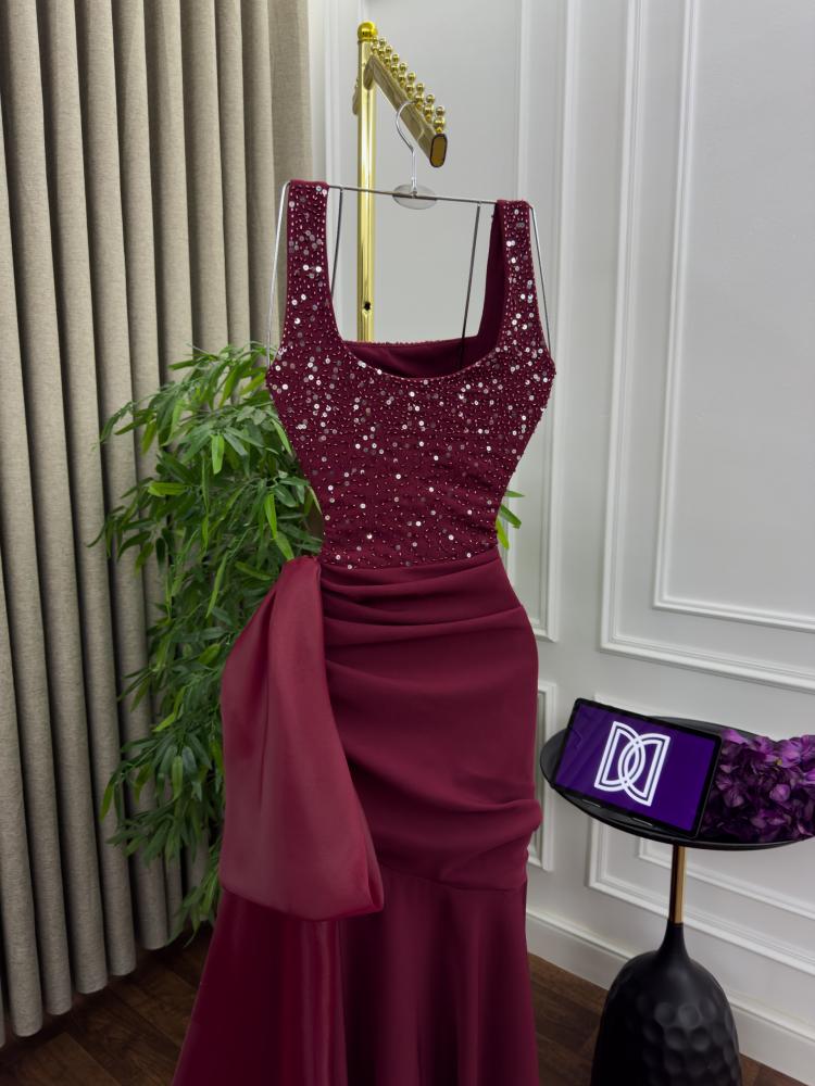 فستان سهره اللون برغندي باربي وجازارتطريز يدوي من متجر جوهره D