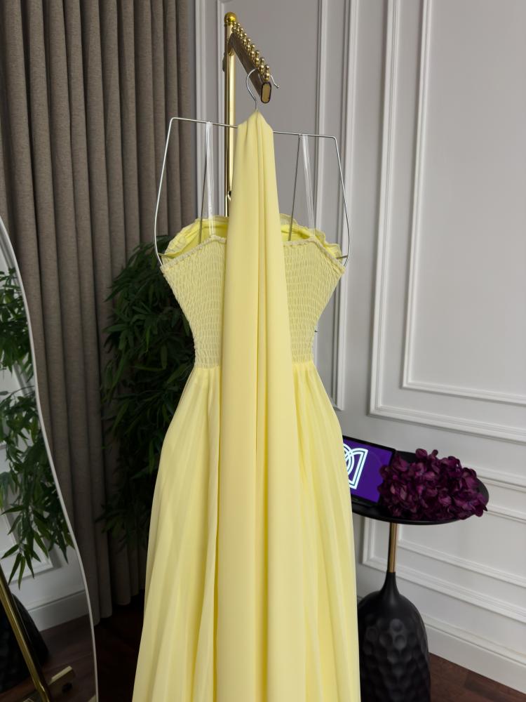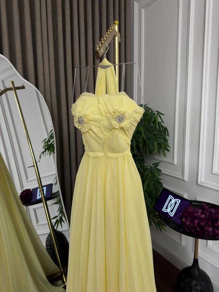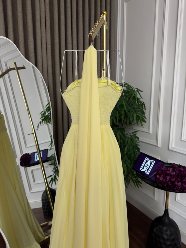 فستان سهره اللون ليموني خامة شيفون ذبل كلوش وتطريز من متجر جوهره D