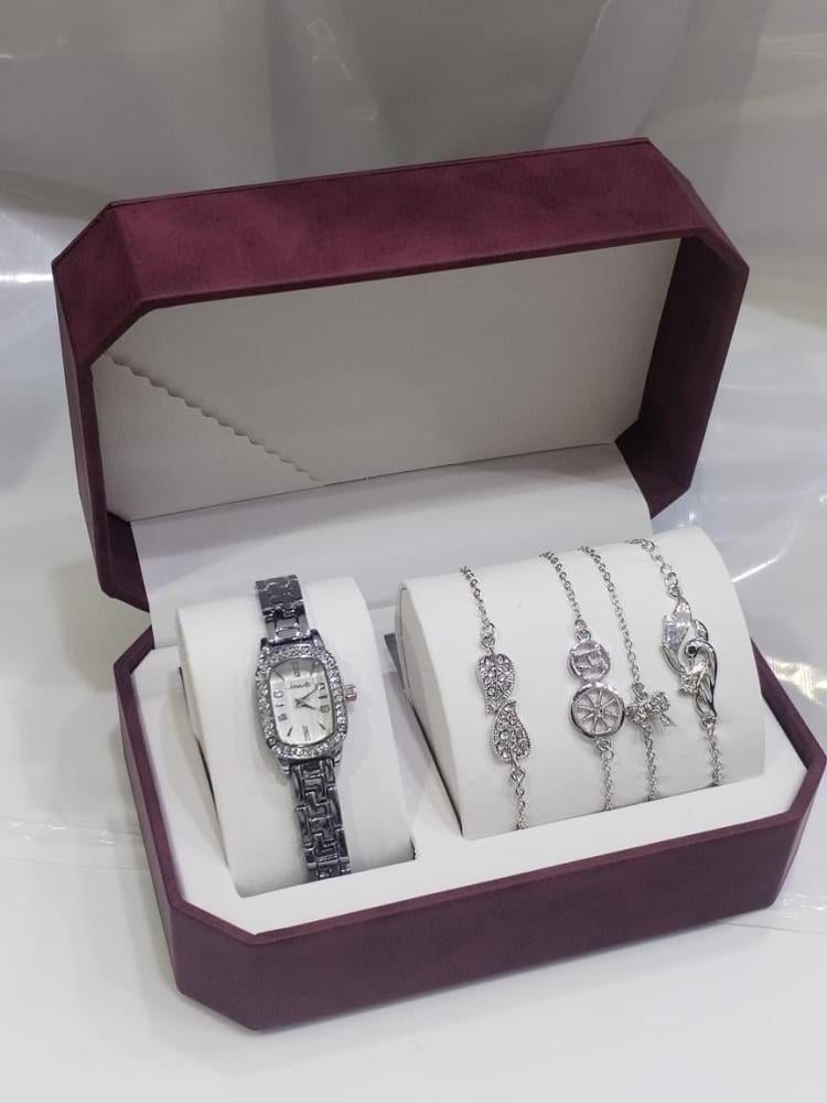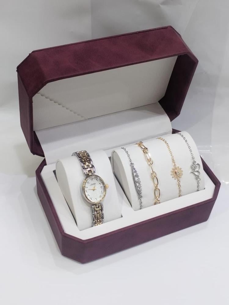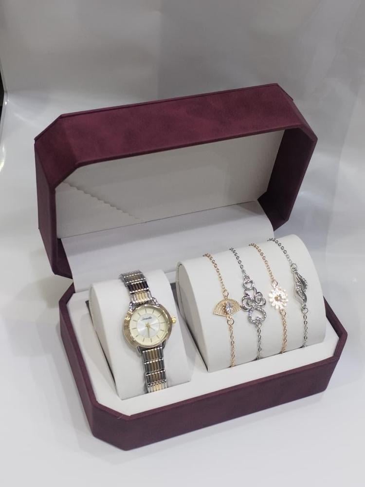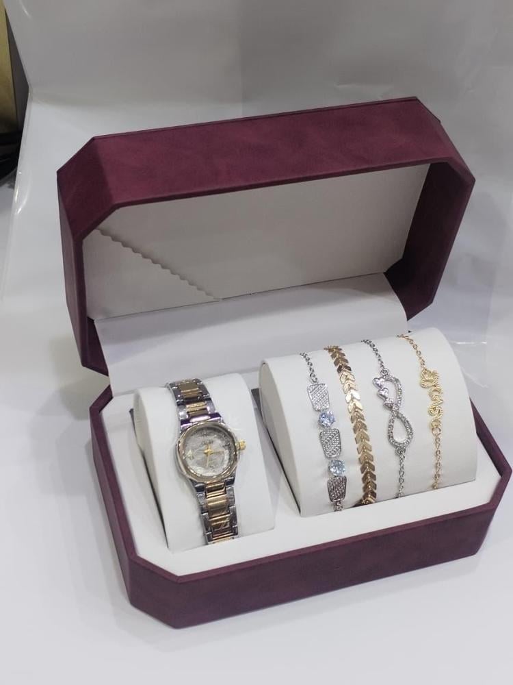 طقم نسائي أنيق مكوّن من ٣ أساور + ساعة بتصميم فاخر وعصري. الطقم يجي مع ضمان لمدة سنة، ومرفق علبة فاخرة + كيس مناسب للهدايمفاجأة جميلة لكِ: لون صندوق الساعة أو علبة الهدية قد يختلف أحيانًا، ونختار لكِ الأجمل من المتوفر