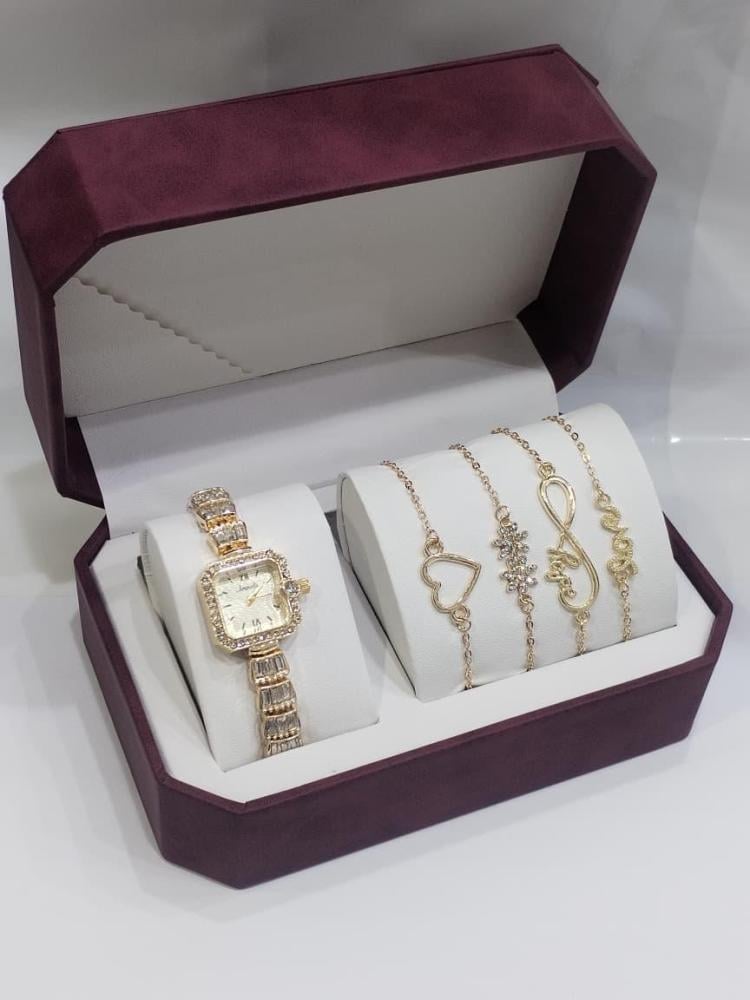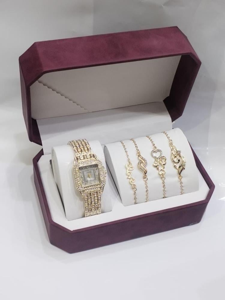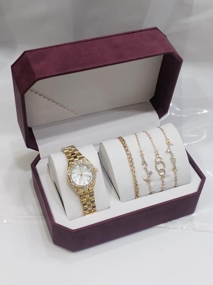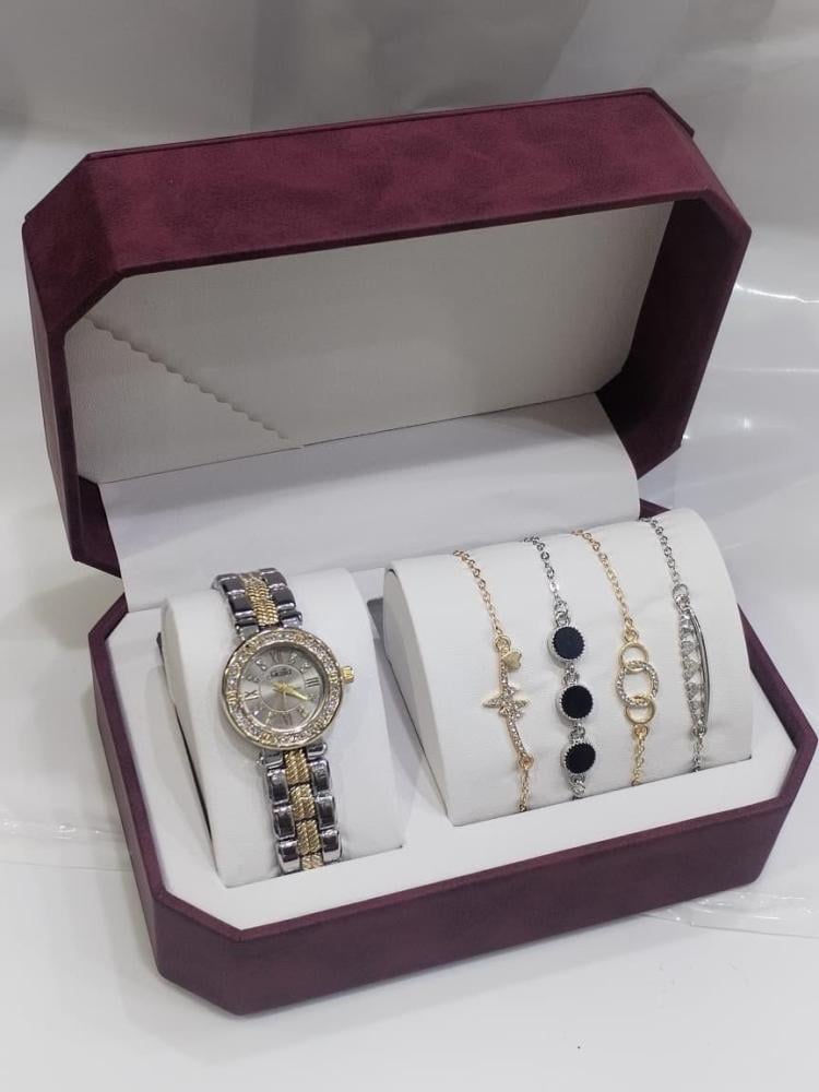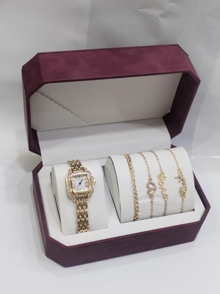 طقم نسائي أنيق مكوّن من ٣ أساور + ساعة بتصميم فاخر وعصري. الطقم يجي مع ضمان لمدة سنة، ومرفق علبة فاخرة + كيس مناسب للهدايمفاجأة جميلة لكِ: لون صندوق الساعة أو علبة الهدية قد يختلف أحيانًا، ونختار لكِ الأجمل من المتوفر