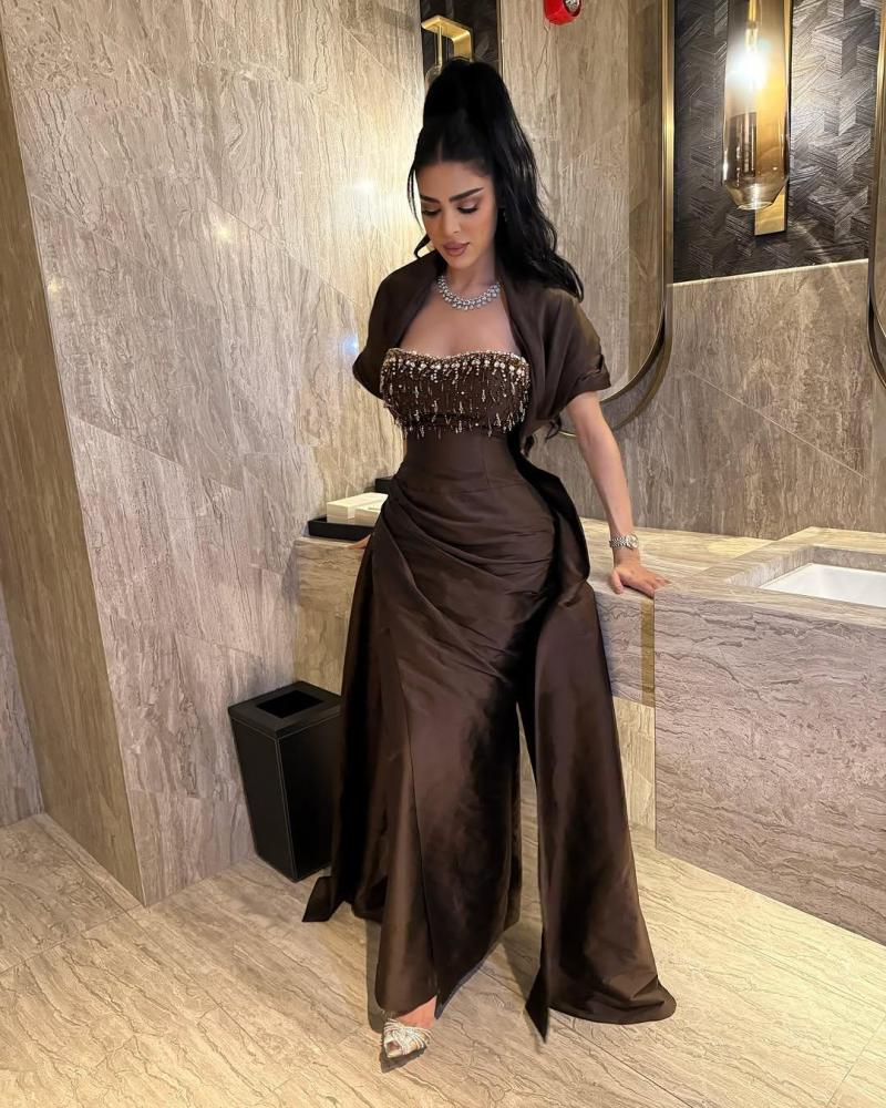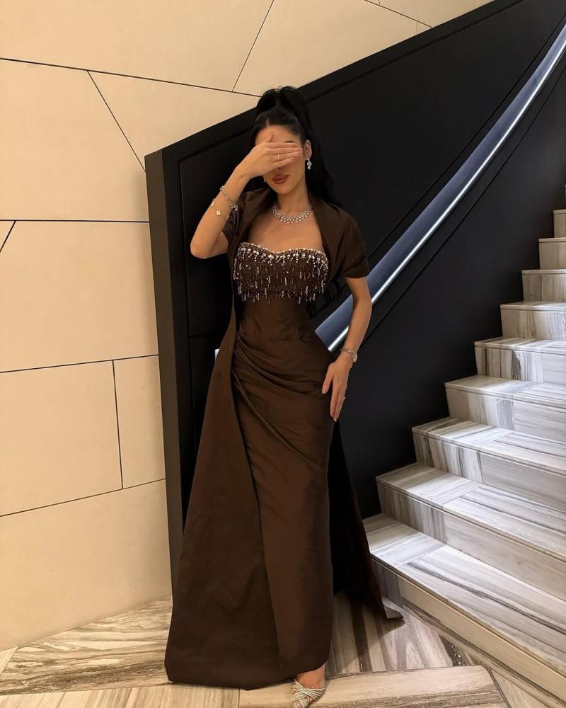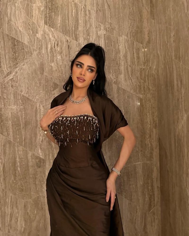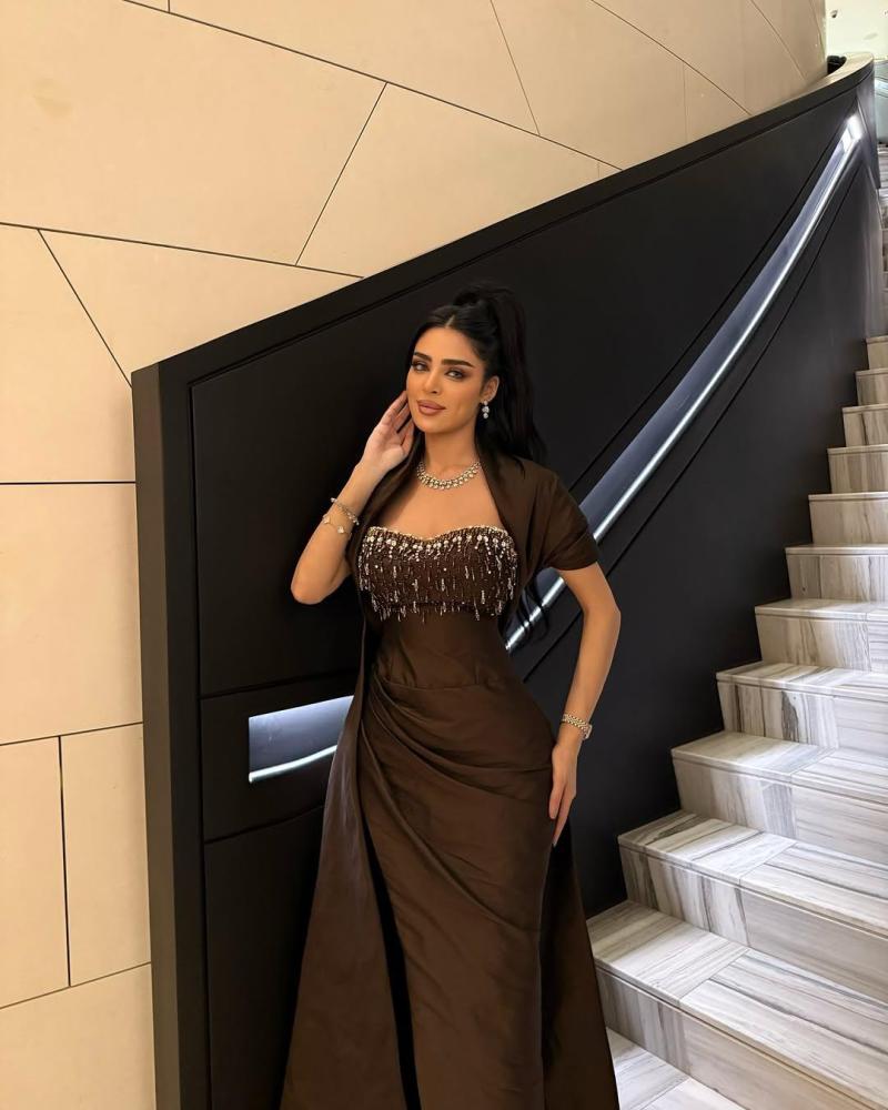 فستان بني الخامه شانطون مطرز عند الصدر تطريز راقي من متجر جوهره MN