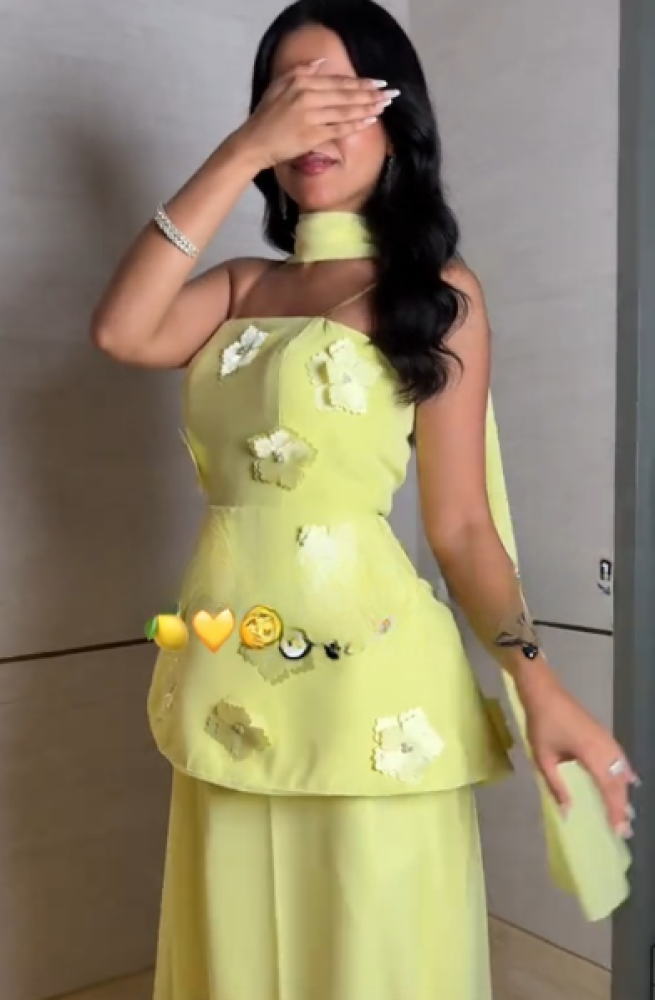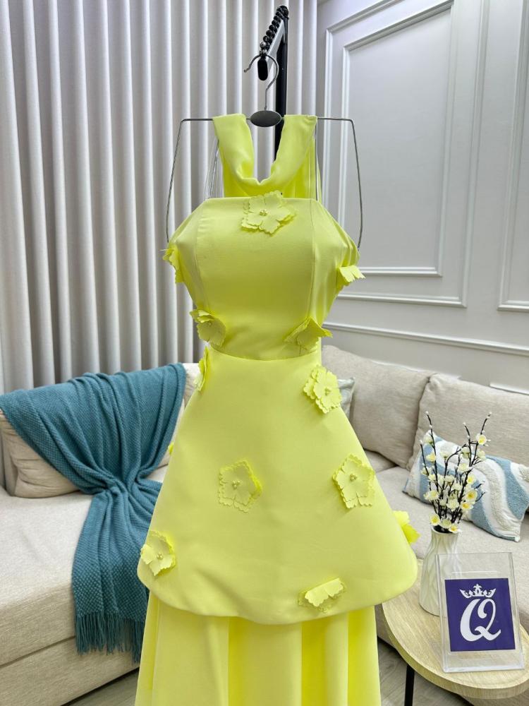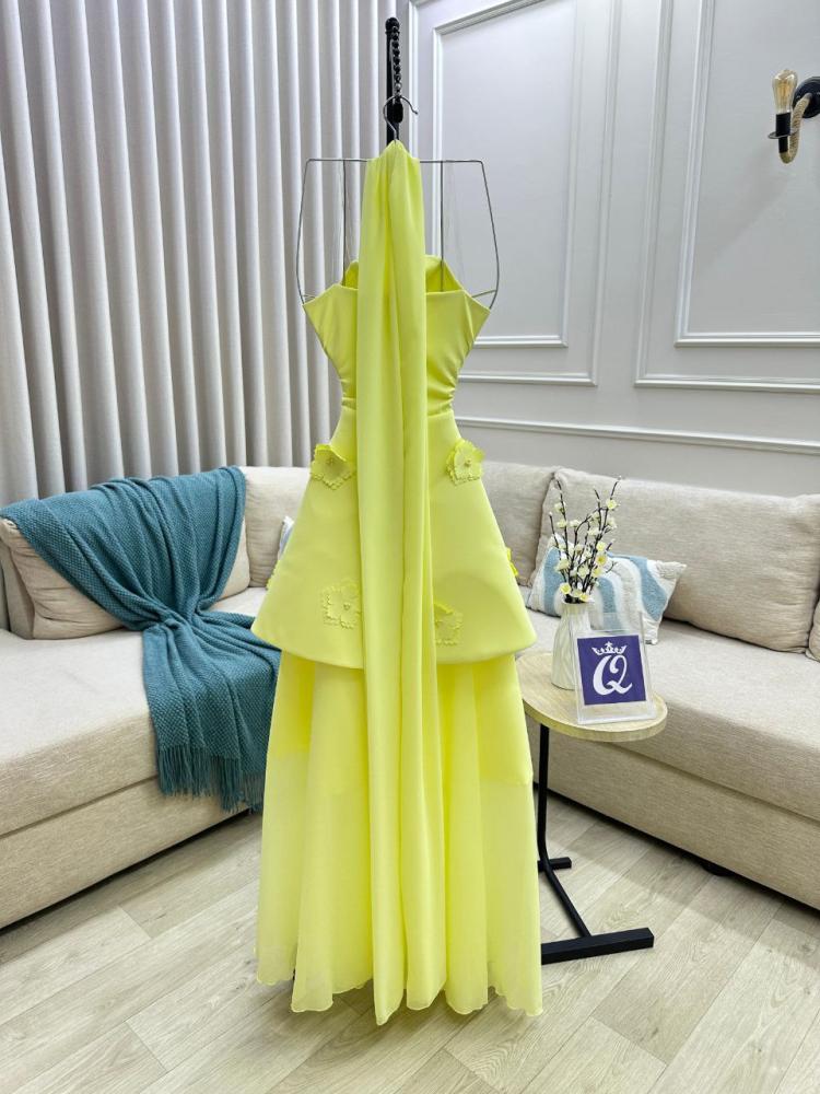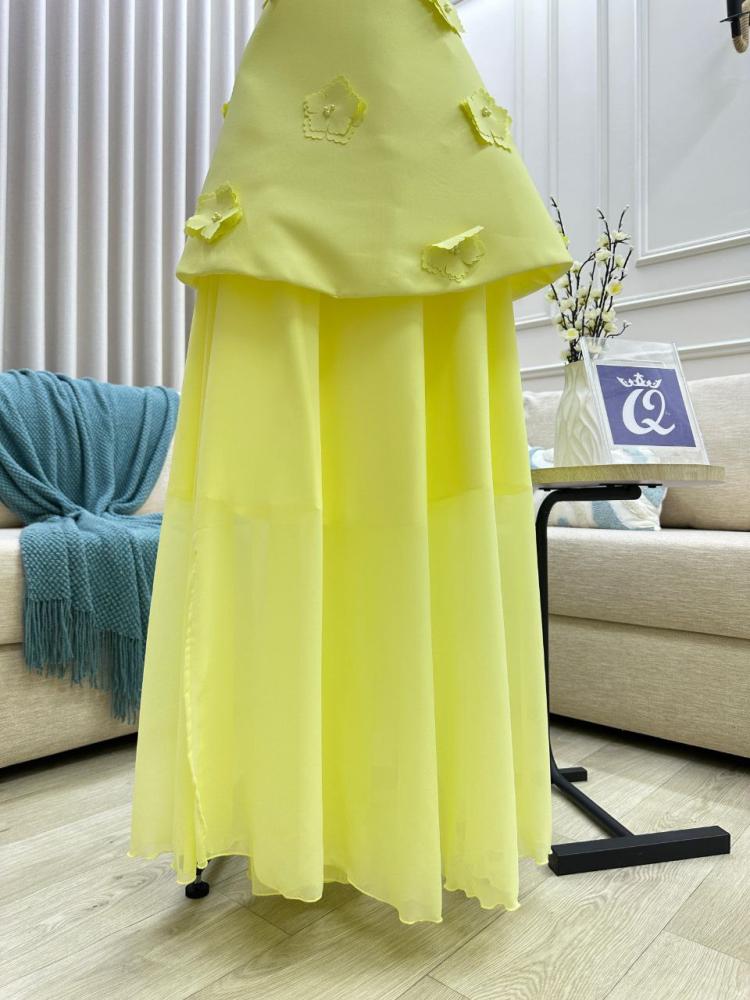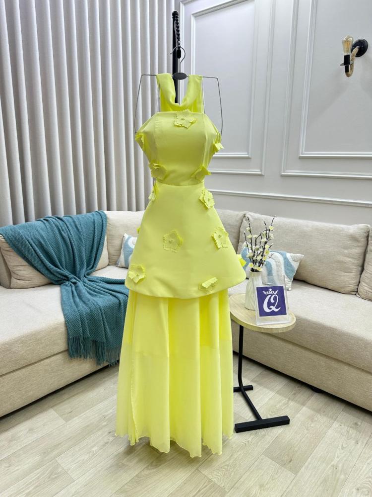 فستان سهره اللون اصفر الباربي مع ورد ليزر من متجر جوهره QU